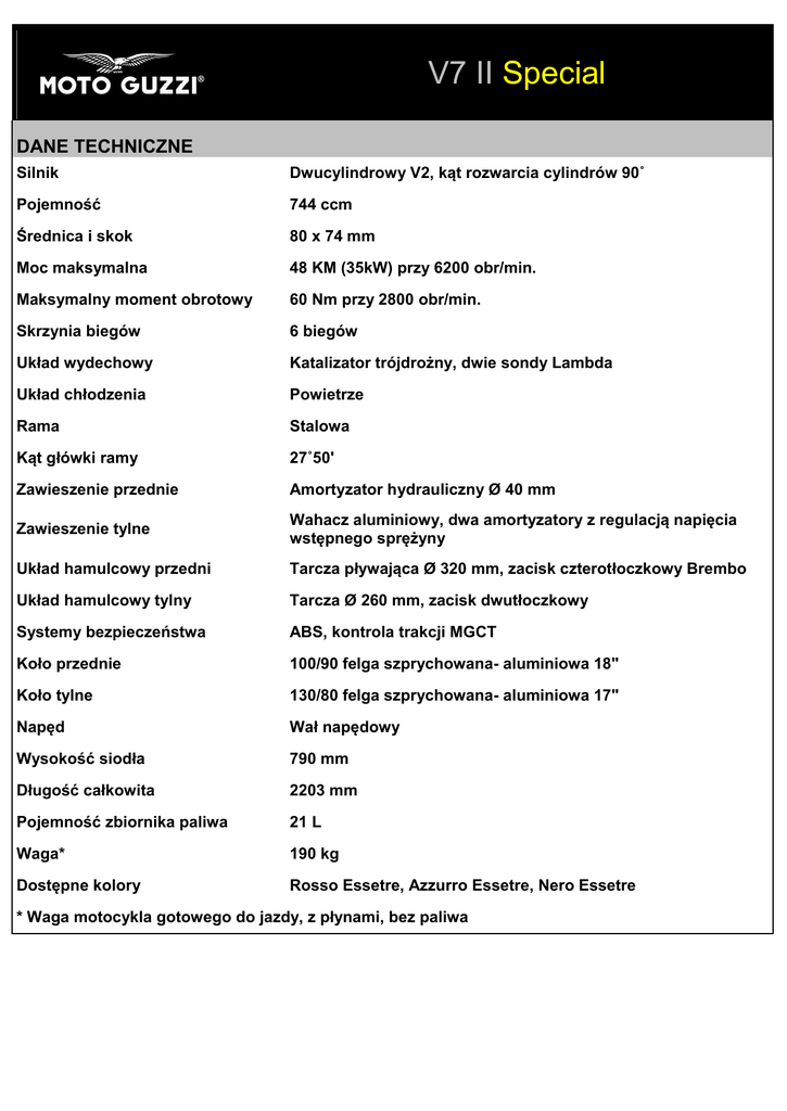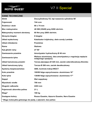 V7 II Special logo bn negativo-01.jpg DANE TECHNICZNE Silnik Dwucylindrowy V2, kąt rozwarcia cylindrów 90˚ Pojemność 744 ccm Średnica i skok 80 x 74 mm Moc maksymalna 48 KM (35kW) przy 6200 obr/min. Maksymalny moment obrotowy 60 Nm przy 2800 obr/min. Skrzynia biegów 6 biegów Układ wydechowy Katalizator trójdrożny, dwie sondy Lambda Układ chłodzenia Powietrze Rama Stalowa Kąt główki ramy 27˚50' Zawieszenie przednie Amortyzator hydrauliczny Ø 40 mm Zawieszenie tylne Wahacz aluminiowy, dwa amortyzatory z regulacją napięcia wstępnego sprężyny Układ hamulcowy przedni Tarcza pływająca Ø 320 mm, zacisk czterotłoczkowy Brembo Układ hamulcowy tylny Tarcza Ø 260 mm, zacisk dwutłoczkowy Systemy bezpieczeństwa ABS, kontrola trakcji MGCT Koło przednie 100/90 felga szprychowana- aluminiowa 18" Koło tylne 130/80 felga szprychowana- aluminiowa 17" Napęd Wał napędowy Wysokość siodła 790 mm Długość całkowita 2203 mm Pojemność zbiornika paliwa 21 L Waga* 190 kg Dostępne kolory Rosso Essetre, Azzurro Essetre, Nero Essetre * Waga motocykla gotowego do jazdy, z płynami, bez paliwa