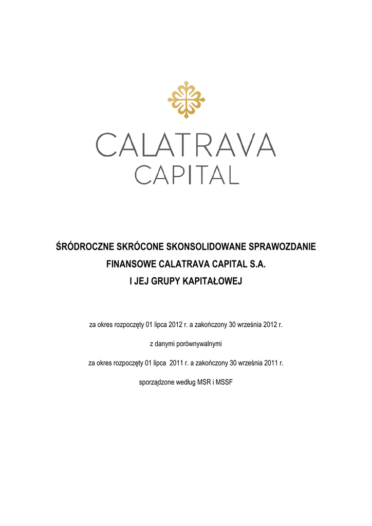 ŚRÓDROCZNE SKRÓCONE SKONSOLIDOWANE SPRAWOZDANIE FINANSOWE CALATRAVA CAPITAL S.A. I JEJ GRUPY KAPITAŁOWEJ za okres rozpoczęty 01 lipca 2012 r. a zakończony 30 września 2012 r. z danymi porównywalnymi za okres rozpoczęty 01 lipca 2011 r. a zakończony 30 września 2011 r. sporządzone według MSR i MSSF ŚRÓDROCZNE SKRÓCONE SKONSOLIDOWANE SPRAWOZDANIE FINANSOWE GRUPY KAPITAŁOWEJ CALATRAVA CAPITAL za III kwartał 2012 r. WYBRANE DANE FINANSOWE GRUPY KAPITAŁOWEJ CALATRAVA CAPITAL NA 30.09.2012 .................. 3 WYBRANE DANE FINANSOWE SPÓŁKI CALATRAVA CAPITAL S.A. NA 30.09.2012 ..................................... 4 ŚRÓDROCZNE SKONSOLIDOWANE SPRAWOZDANIE Z SYTUACJI FINANSOWEJ GRUPY KAPITAŁOWEJ CALATRAVA CAPITAL NA 30.09.2012................................................................................................................. 5 ŚRÓDROCZNE JEDNOSTKOWE SPRAWOZDANIE Z SYTUACJI FINANSOWEJ CALATRAVA CAPITAL S.A. NA 30.09.2012 ...................................................................................................................................................... 14 INFORMACJA DODATKOWA DO ŚRÓDROCZNEGO SKRÓCONEGO SKONSOLIDOWANEGO SPRAWOZDANIA FINANSOWEGO CALATRAVA CAPITAL S.A. I JEJ GRUPY KAPITAŁOWEJ ZA III KWARTAŁ 2012 ROKU ........................................................................................................................................ 23 I. II. III. IV. V. VI. VII. VIII. WPROWADZENIE....................................................................................................................................... 23 OŚWIADCZENIE O ZGODNOŚCI Z MSSF ...................................................................................................... 25 STOSOWANE NADRZĘDNE ZASADY RACHUNKOWOŚCI ................................................................................. 25 ISTOTNE ZASADY RACHUNKOWOŚCI ........................................................................................................... 26 CZYNNIKI I ZDARZENIA MAJĄCE WPŁYW NA OSIĄGNIĘTY WYNIK FINANSOWY W III KWARTALE 2012 ROKU ....... 34 ISTOTNE CZYNNIKI RYZYKA I ZAGROśEŃ ..................................................................................................... 37 WYKAZ ISTOTNYCH ZDARZEŃ PRZED I PO DNIU BILANSOWYM....................................................................... 40 INFORMACJE DODATKOWE ........................................................................................................................ 41 Wszystkie kwoty wyraŜono w tysiącach złotych, chyba Ŝe stwierdzono inaczej 2 ŚRÓDROCZNE SKRÓCONE SKONSOLIDOWANE SPRAWOZDANIE FINANSOWE GRUPY KAPITAŁOWEJ CALATRAVA CAPITAL za III kwartał 2012 r. WYBRANE DANE FINANSOWE GRUPY KAPITAŁOWEJ CALATRAVA CAPITAL NA 30.09.2012 w tys. PLN WYBRANE DANE FINANSOWE SKONSOLIDOWANE Przychody netto ze sprzedaŜy z działalności handlowej, usługowej, inwestycyjnej* Za okres 9 miesięcy zakończony 30.09.2012 w tys. EUR Za okres 9 miesięcy zakończony 30.09.2011 Za okres 9 miesięcy zakończony 30.09.2012 Za okres 9 miesięcy zakończony 30.09.2011 99 218 113 113 23 653 26 965 5 032 33 784 1 200 8 054 -191 31 779 -46 7 576 -355 31 824 -85 7 587 -78 -236 -19 -56 -277 32 272 -66 7 693 -3 909 -1 717 -950 -417 -42 -21 123 -10 -5 135 3 600 22 035 875 5 356 -351 -805 -85 -196 395 665 190 309 96 180 46 261 109 911 49 304 26 718 11 985 38 484 13 314 9 355 3 236 71 427 35 990 17 363 8 749 Kapitał własny w tym: 285 754 141 005 69 462 34 276 - kapitał własny przynaleŜny akcjonariuszom spółki dominującej 286 219 141 303 69 575 34 349 -465 -298 -113 -72 250 000 96 662 60 771 23 497 500 000 000 193 325 000 500 000 000 193 325 000 Zysk (strata) na jedną akcję zwykłą (w PLN / EUR) 0,00 0,17 0,00 0,04 Wartość księgowa na jedną akcję (w PLN / EUR) 0,57 0,73 0,14 0,18 Zysk (strata) z działalności operacyjnej Zysk (strata) brutto Zysk (strata) netto Zysk (strata) netto przypadający na udziały niekontrolujące Zysk (strata) netto przypadający na akcjonariuszy spółki dominującej Przepływy pienięŜne netto z działalności operacyjnej Przepływy pienięŜne netto z działalności inwestycyjnej Przepływy pienięŜne netto z działalności finansowej Przepływy pienięŜne netto, razem Aktywa, razem Zobowiązania i rezerwy na zobowiązania Zobowiązania długoterminowe Zobowiązania krótkoterminowe - udziały niekontrolujące (kapitał mniejszościowy) Kapitał zakładowy Liczba akcji (w szt.) * pozycja obejmuje przychody z działalności inwestycyjnej w kwocie 87 328 tys. (sprzedaŜ inwestycji portfelowych , dywidendy , odpisy aktualizujące) Wszystkie kwoty wyraŜono w tysiącach złotych, chyba Ŝe stwierdzono inaczej 3 ŚRÓDROCZNE SKRÓCONE SKONSOLIDOWANE SPRAWOZDANIE FINANSOWE GRUPY KAPITAŁOWEJ CALATRAVA CAPITAL za III kwartał 2012 r. WYBRANE DANE FINANSOWE SPÓŁKI CALATRAVA CAPITAL S.A. NA 30.09.2012 w tys. PLN WYBRANE DANE FINANSOWE JEDNOSTKOWE Za okres 9 miesięcy zakończony 30.09.2012 w tys. EUR Za okres 9 miesięcy zakończony 30.09.2011 Za okres 9 miesięcy zakończony 30.09.2012 Za okres 9 miesięcy zakończony 30.09.2011 Przychody netto ze sprzedaŜy z działalności handlowej, usługowej, inwestycyjnej* 91 755 15 991 21 874 3 812 Zysk (strata) z działalności operacyjnej 32 479 -2446 7 743 -583 Zysk (strata) brutto 26 768 -4 383 6 381 -1 045 Zysk (strata) netto 26 603 -4 336 6 342 -1 034 Przepływy pienięŜne netto z działalności operacyjnej 4 350 4 845 1 057 1 178 Przepływy pienięŜne netto z działalności inwestycyjnej -8 280 -21184 -2 013 -5 149 Przepływy pienięŜne netto z działalności finansowej 3 867 16 181 940 3 933 -63 -158 -15 -38 Aktywa, razem 367 506 184 114 89 335 44 755 Zobowiązania i rezerwy na zobowiązania 102 024 84 818 24 800 20 618 Zobowiązania długoterminowe 23 436 11191 5 697 2 720 Zobowiązania krótkoterminowe 78 588 73 627 19 104 17 898 Kapitał własny 265 482 99 296 64 534 24 137 Kapitał zakłado