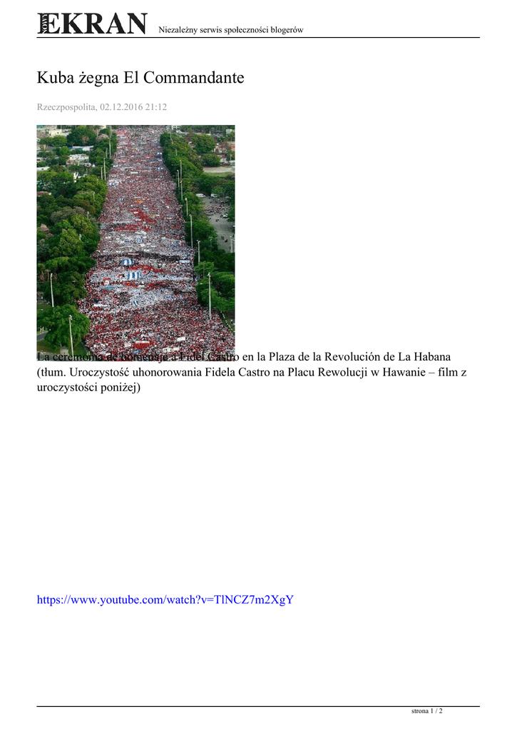 Niezależny serwis społeczności blogerów Kuba żegna El Commandante Rzeczpospolita, 02.12.2016 21:12 La ceremonia de homenaje a Fidel Castro en la Plaza de la Revolución de La Habana (tłum. Uroczystość uhonorowania Fidela Castro na Placu Rewolucji w Hawanie – film z uroczystości poniżej) https://www.youtube.com/watch?v=TlNCZ7m2XgY strona 1 / 2 Niezależny serwis społeczności blogerów ____________________________ Prezydent Rosji, W.Putin w kondolencyjnym telegramie do brata zmarłego przywódcy Kuby, Raula Castro oraz do narodu kubańskiego napisał m.in.: „Fidel Castro był szczerym i niezawodnym przyjacielem Rosji. Wniósł ogromny wkład w ustanowienie i rozwój stosunków rosyjsko-kubańskich, ścisłej strategicznej współpracy we wszystkich sferach. Państwo, jakie zbudował Fidel Castro i jego zwolennicy – „wolna i niezależna Kuba” – stało się wpływowym uczestnikiem wspólnoty międzynarodowej i inspirującym przykładem dla wielu krajów i narodów. Imię przywódcy kubańskiej rewolucji stało się symbolem całej epoki w najnowszej historii światowej.” _______ Nic nam nie wiadomo, żeby władze żydowskiego reżimu IIIRP złożyły kondolencje rodzinie zmarłego i Kubańczykom. Również powszechne żydowskie media w IIIRP wcale lub lakonicznie potraktowały śmierć Fidela Castro. Redakcja WPS Zapisz Zapisz Zapisz Zapisz Zapisz strona 2 / 2 Powered by TCPDF (www.tcpdf.org)