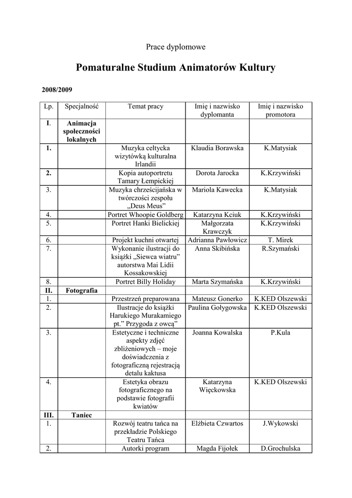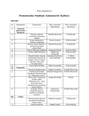 Prace dyplomowe Pomaturalne Studium Animatorów Kultury 2008/2009 Lp. Specjalność I. Animacja społeczności lokalnych 1. 2. 3. 4. 5. 6. 7. 8. II. 1. 2. Imię i nazwisko promotora Muzyka celtycka wizytówką kulturalna Irlandii Kopia autoportretu Tamary Łempickiej Muzyka chrześcijańska w twórczości zespołu „Deus Meus” Portret Whoopie Goldberg Portret Hanki Bielickiej Klaudia Borawska K.Matysiak Dorota Jarocka K.Krzywiński Mariola Kawecka K.Matysiak Katarzyna Kciuk Małgorzata Krawczyk Adrianna Pawłowicz Anna Skibińska K.Krzywiński K.Krzywiński Marta Szymańska K.Krzywiński T. Mirek R.Szymański Fotografia Przestrzeń preparowana Mateusz Gonerko Ilustracje do książki Paulina Gołygowska Harukiego Murakamiego pt.” Przygoda z owcą” Estetyczne i techniczne Joanna Kowalska aspekty zdjęć zbliżeniowych – moje doświadczenia z fotograficzną rejestracją detalu kaktusa Estetyka obrazu Katarzyna fotograficznego na Więckowska podstawie fotografii kwiatów 4. 2. Imię i nazwisko dyplomanta Projekt kuchni otwartej Wykonanie ilustracji do książki „Siewca wiatru” autorstwa Mai Lidii Kossakowskiej Portret Billy Holiday 3. III. 1. Temat pracy K.KED Olszewski K.KED Olszewski P.Kula K.KED Olszewski Taniec Rozwój teatru tańca na przekładzie Polskiego Teatru Tańca Autorki program Elżbieta Czwartos J.Wykowski Magda Fijołek D.Grochulska nauczania tańca w klasach I-III o profilu tanecznym Amatorski ruch artystyczny – przeglądy taneczne w Szczecinie i województwie zachodniopomorskim 3. Katarzyna Laskowska D.Grochulska 4. Wpływ zajęć rytmicznotanecznych na rozwój psycho-motorycznych dzieci w gminy Stepnica w świetle badań Irmina Łachacz J.Wykowski 5. Historia i współczesność Państwowego Ogniska Baletowego w Szczecinie Anna Magdziarz J.Wykowski 6. Taniec jako środek terapeutyczny, czyli choreoterapia Żaneta Pasternak E.Hołubowska 7. Zajęcia taneczno-ruchowe z grupą młodzieży Ewa Paś J.Wykowski 8. Maja Plisiecka – najwybitniejsza tancerka XX wieku Ilona Świątkowska D.Grochulska Temat pracy Imię i nazwisko dyplomanta Imię i nazwisko promotora Drzewa, drzewa, drzewa – poszukiwanie człowieka przy użyciu współczesnych form wyrazu tkaniny artystycznej Aranżacja dziedzińca w szkole podstawowej cz.II Rola Teatru Muzycznego w Gdyni w kształtowaniu kultury muzycznej Pomorza Partycja Czyż E. Banaś Krzywińska Anna Jermołowicz T.Mirek Katarzyna Kankowska K.Matysiak 2007/2008 Lp. Specjalność I. Animacja społeczności lokalnych 1. 2. 3. 4. 5. „Bez niej nawet najpiękniejsza kreacja jest niepełna” Portret Haliny Poświatowskiej Aranżacja dziedzińca w szkole podstawowej cz.I. Portret Mieczysławy Ćwiklińskiej Debiut poetycki Nestora Mocarskiego opracowanie graficzne Andrzej Zaucha – w pamięci na zawsze 6. 7. 8. 9. 10. II. 1. 2. Fotografia III. 1. Taniec 2. 3. 4. Monika Machała E.Banaś Krzywińska Agata Meksa K.Krzywiński Ewa Nawój T.Mirek Andrzej Ruppental K.Krzywiński Kazimierz Rajnerowicz I.Rewcio Łukasz Stachyra K.Matysiak Mistrz Jerzy Architektura Nowego Jorku Piotr Bednarz Emilia Wojciechowska K. KED Olszewski T.Czerniawski Wytańczy ć marzenia. Program zajęć tanecznych z dziećmi w wieku przedszkolnym Taniec towarzyski w Szczecinie 15 lat baletu w Koszalinie Michał Stukan, czyli jak doszedłem do sukcesu i sławy Monika Ferka A. Ikonomu Cichocka Małgorzata Cieryt J.Wykowski Iryna Nekrasowa Michał Stukan D. Grochulska J.Wykowski Temat pracy Imię i nazwisko dyplomanta Imię i nazwisko promotora Taniec flamenco – inspiracją dla wnętrza Z kruka dziewczyna Katarzyna Dobosz T. Mirek Małgorzata Jańczak Jolanta Lawrenc Ewa Banaś Krzywińska K. Matysiak Dorota Makar Aleksandra Raszeja K.Krzywiński T. Mirek Kamila Wojtasik Izabela Rewcio 2006/2007 Lp. Specjalność I. Animacja społeczności lokalnych 1. 2. 2. 3. 4. 5. Pieśń romantyczna Roberta Schumanna „Miłość i życie kobiety” Portret Marilyn Monroe Aranżacja wnętrza drewnianego domu rekreacyjnego Humor w japońskich komiksach dla młodzieży. Analiza zagadnienia na podstawie wybranych komiksów. II. Fotografia III. Taniec - - - - - - Temat pracy Imię i nazwisko dyplomanta Imię i nazwisko promotora 2005/2006 Lp. Specjalność I. Animacja kulturalna regionu 1. Pierwsza dama jazzu – Marta Dusznicka K. Matysiak Ella Fitzgerald Projekt aranżacji łazienki Anna Deresz Cetner T. Mirek w domku jednorodzinnym Aranżacja sypialni Anita Krystowska T. Mirek inspirowana stylem wiktoriańskim Muzea Europy (wybór) Marta Konopacka K.Krzywiński Portret Fridy Kahlo Karolina Skalska K.Krzywiński Portret Marleny Dietrich Grażyna Szrajber K. Krzywiński Kalendarz jako narzędzie Agnieszka J. Kopischke użytkowe Wiercińska Zasady projektowania i Małgorzata J.Kopischke publikacji wydawnictw Wrzosińska akcydensowych na przykładzie katalogu wystawy pokonkursowej 2. 3. 4. 5. 6. 7. 8. II. 1. Fotografia Historyczne fascynacje. Maciej Moskiewicz Międzynarodowy Festiwal Wikingów Wolin -Jomsborg - Vineta Architektura Gaudiego w Karolina Mysiak Barcelonie 2. III. 1. 2. T.Czerniawski T.Czerniawski Taniec Pozytywne i negatywne czynniki wpływające na rozwój i hamowanie kariery zawodowej tancerzy Taniec jako dziedzina wychowania na przykładzie zespołu Małgorzata Kopaczewska D. Grochulska Agnieszka Kozerska D. Grochulska POWER DANCE z Poznania Rozwój ruchu tanecznego w Świnoujściu w latach 1945-2006 Historia i charakterystyka subkultury Hip-hop Ruch taneczny w Drawsku Pomorskim 3. 4. 5. Agata Mida D. Grochulska Adam Pietras D. Grochulska Renata Żołądkiewicz D. Grochulska Imię i nazwisko dyplomanta Imię i nazwisko promotora 2004/2005 Lp. Specjalność I. Animacja kulturalna regionu 1. Temat pracy Muzyka w dobie Katarzyna Lisowska K. Matysiak renesansu i jej wpływ na koncepcję muzyki w Polsce Tworzenie się jednolitej Anna Kowalczyk J. Wykowski kulturowo społeczności lokalnej na ziemi reczańskiej po 1945 roku. Lampa witrażowa Małgorzata Poźniak G. Sz