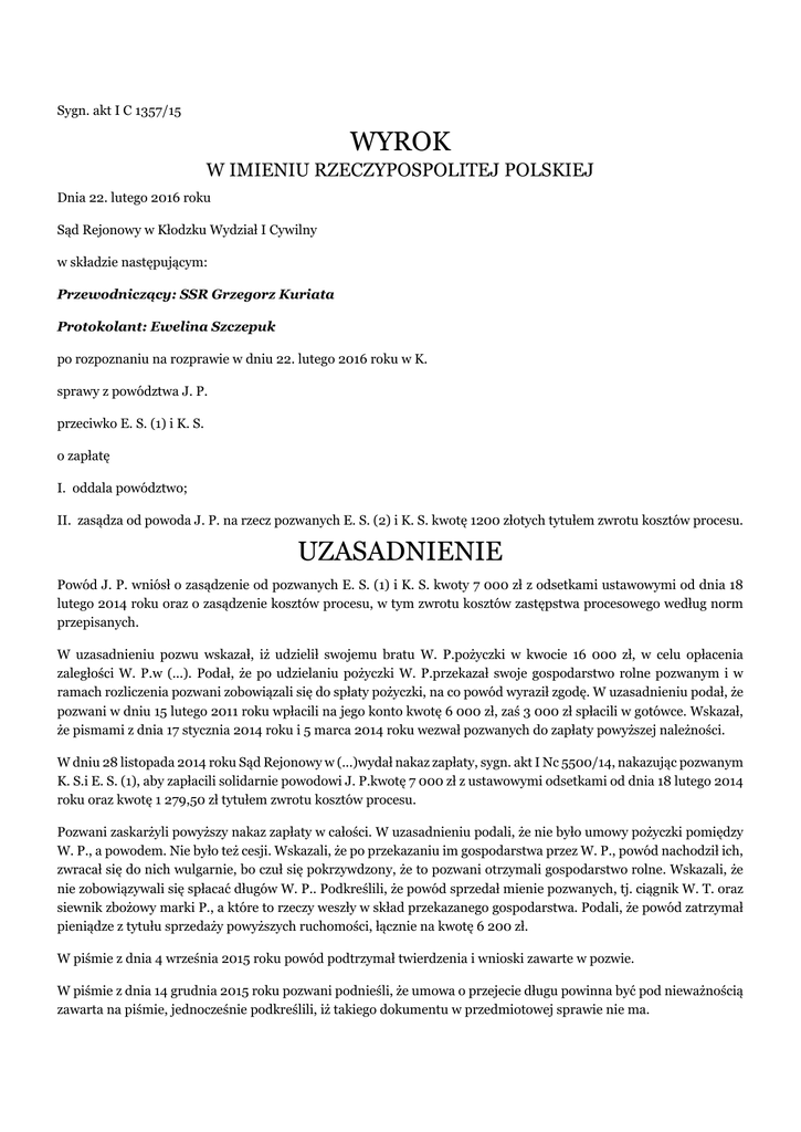 Sygn. akt I C 1357/15 WYROK W IMIENIU RZECZYPOSPOLITEJ POLSKIEJ Dnia 22. lutego 2016 roku Sąd Rejonowy w Kłodzku Wydział I Cywilny w składzie następującym: Przewodniczący: SSR Grzegorz Kuriata Protokolant: Ewelina Szczepuk po rozpoznaniu na rozprawie w dniu 22. lutego 2016 roku w K. sprawy z powództwa J. P. przeciwko E. S. (1) i K. S. o zapłatę I. oddala powództwo; II. zasądza od powoda J. P. na rzecz pozwanych E. S. (2) i K. S. kwotę 1200 złotych tytułem zwrotu kosztów procesu. UZASADNIENIE Powód J. P. wniósł o zasądzenie od pozwanych E. S. (1) i K. S. kwoty 7 000 zł z odsetkami ustawowymi od dnia 18 lutego 2014 roku oraz o zasądzenie kosztów procesu, w tym zwrotu kosztów zastępstwa procesowego według norm przepisanych. W uzasadnieniu pozwu wskazał, iż udzielił swojemu bratu W. P.pożyczki w kwocie 16 000 zł, w celu opłacenia zaległości W. P.w (...). Podał, że po udzielaniu pożyczki W. P.przekazał swoje gospodarstwo rolne pozwanym i w ramach rozliczenia pozwani zobowiązali się do spłaty pożyczki, na co powód wyraził zgodę. W uzasadnieniu podał, że pozwani w dniu 15 lutego 2011 roku wpłacili na jego konto kwotę 6 000 zł, zaś 3 000 zł spłacili w gotówce. Wskazał, że pismami z dnia 17 stycznia 2014 roku i 5 marca 2014 roku wezwał pozwanych do zapłaty powyższej należności. W dniu 28 listopada 2014 roku Sąd Rejonowy w (...)wydał nakaz zapłaty, sygn. akt I Nc 5500/14, nakazując pozwanym K. S.i E. S. (1), aby zapłacili solidarnie powodowi J. P.kwotę 7 000 zł z ustawowymi odsetkami od dnia 18 lutego 2014 roku oraz kwotę 1 279,50 zł tytułem zwrotu kosztów procesu. Pozwani zaskarżyli powyższy nakaz zapłaty w całości. W uzasadnieniu podali, że nie było umowy pożyczki pomiędzy W. P., a powodem. Nie było też cesji. Wskazali, że po przekazaniu im gospodarstwa przez W. P., powód nachodził ich, zwracał się do nich wulgarnie, bo czuł się pokrzywdzony, że to pozwani otrzymali gospodarstwo rolne. Wskazali, że nie zobowiązywali się spłacać długów W. P.. Podkreślili, że powód sprzedał mienie pozwanych, tj. ciągnik W. T. oraz siewnik zbożowy marki P., a które to rzeczy weszły w skład przekazanego gospodarstwa. Podali, że powód zatrzymał pieniądze z tytułu sprzedaży powyższych ruchomości, łącznie na kwotę 6 200 zł. W piśmie z dnia 4 września 2015 roku powód podtrzymał twierdzenia i wnioski zawarte w pozwie. W piśmie z dnia 14 grudnia 2015 roku pozwani podnieśli, że umowa o przejecie długu powinna być pod nieważnością zawarta na piśmie, jednocześnie podkreślili, iż takiego dokumentu w przedmiotowej sprawie nie ma. Sąd ustalił następujący stan faktyczny: W 2007 roku powód J. P. pożyczył swojemu bratu W. P. kwotę 16 000 zł. Powyższa umowa nie została zawarta w formie pisemnej, nie został również określony termin zwrotu powyższej pożyczki. Dowód: - przesłuchanie powoda, k. 99 Umową darowizny z dnia 2 lutego 2009 roku zawartą w Kancelarii Notarialnej w K.przed notariuszem A. S.(Repertorium A nr (...)) W. P.darował bratankowi K. S.i jego żonie E. S. (1)- na ich wspólność ustawową, nieruchomość stanowiącą gospodarstwo rolne z zabudowaniami, składające się z działek o numerach (...), o pow. 11,49 ha, położone w Ż., dla którego Sąd Rejonowy w (...)prowadzi księgę wieczystą Kw (...). K. S.i E. S. (1)przyjęli powyższą darowiznę. Z powyższej umowy darowizny wynika, że przedmiot umowy nie był obciążony żadnymi długami, ani roszczeniami osób trzecich, nie był obciążony ograniczonymi prawami rzeczowymi, nie występowały jakiekolwiek prawne lub faktyczne okoliczności mogące spowodować obciążenie tego przedmiotu, ograniczenia w rozporządzaniu nim lub korzystaniu z niego, zobowiązania podatkowe i inne zobowiązania publicznoprawne związane z tym przedmiotem zostały uregulowane. Dowód: - umowa darowizny z 02.02.2009 r., k. 41 – 48 Po przejęciu gospodarstwa rolnego pozwani sprzedali ciągnik rolniczy, a uzyskaną ze sprzedaży kwotę przekazali powodowi - w dniu 15 lutego 2011 r. pozwany K. S. dokonał przelewu na konto powoda kwoty 6 000 zł, w tytule przelewu wpisując „za W. P. spłata zadłużenia”. Dowód: potwierdzenie wykonania przelewu z 15.02.2011 r., k. 8 - przesłuchanie powoda, k. 98 - przesłuchanie pozwanej, k. 98 - 99 Pismami z dnia 17 stycznia 2014 roku i 5 marca 2014 roku powód wezwał pozwanych, wobec przejęcia przez nich gospodarstwa rolnego brata powoda - W. P. do zapłaty kwoty 7 000 zł z tytułu umowy pożyczki udzielonej przez niego W. P. w wysokości 16 000 zł. Dowód: - wezwanie do zapłaty z 17.01.2014 r., k. 9 - wezwanie do zapłaty z 05.03.2014 r., k. 10 Pozwani nie byli obecni przy zawieraniu umowy pożyczki pomiędzy powodem a W. P.. Pozwani mieli wiedzę, że W. P. pozostawił zobowiązania wobec osób trzecich, a które pozwani spłacali. Dowód: - przesłuchanie pozwanej, k. 98 - 99 Sąd zważył: Powództwo nie zasługuje na uwzględnienie. Mając na względzie całość zgromadzonego w sprawie materiału dowodowego, Sąd ustalił, iż powód udzielił swojemu bratu W. P. pożyczki w kwocie 16 000 zł. Wskazać należy, iż nie została zachowana forma umowy pożyczki, jednakże w niniejszej sprawie nie ma to istotnego znaczenia, bowiem umowa ta nie została zawarta pomiędzy stronami przedmiotowego postępowania, tj. powodem J. P., a pozwanymi E. S. (1) i K. S.. Powód opiera swoje żądanie na przejęciu przez pozwanych długu od W. P., bowiem to pozwani w drodze umowy darowizny otrzymali od W. P. gospodarstwo rolne z zabudowaniami. Ponadto pozwani wiedzieli o zadłużeniu W. P. u osób prywatnych i takie zobowiązania spłacali. Ze zgromadzonego w sprawie materiału dowodowego wynika również, że pozwany dokonywał spłaty zadłużenia W. P. również na rzecz powoda, dokonując chociażby przelewu w dniu 15 lutego 2011 roku w treści którego wpisując „za W. P. spłata zadłu