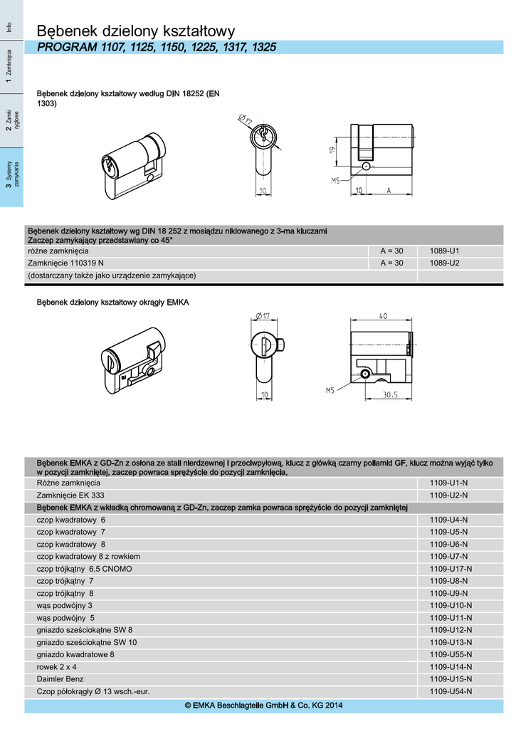 Info 1 Zamknięcia Bębenek dzielony kształtowy Program 1107, 1125, 1150, 1225, 1317, 1325 zamykania 3 Systemy ryglowe 2 Zamki Bębenek dzielony kształtowy według DIN 18252 (EN 1303) Bębenek dzielony kształtowy wg DIN 18 252 z mosiądzu niklowanego z 3-ma kluczami Zaczep zamykający przedstawiany co 45° różne zamknięcia A = 30 1089-U1 Zamknięcie 110319 N A = 30 1089-U2 (dostarczany także jako urządzenie zamykające) Bębenek dzielony kształtowy okrągły EMKA Bębenek EMKA z GD-Zn z osłona ze stali nierdzewnej i przeciwpyłową, klucz z główką czarny poliamid GF, klucz można wyjąć tylko w pozycji zamkniętej, zaczep powraca sprężyście do pozycji zamknięcia. Różne zamknięcia 1109-U1-N Zamknięcie EK 333 1109-U2-N Bębenek EMKA z wkładką chromowaną z GD-Zn, zaczep zamka powraca sprężyście do pozycji zamkniętej czop kwadratowy 6 1109-U4-N czop kwadratowy 7 1109-U5-N czop kwadratowy 8 1109-U6-N czop kwadratowy 8 z rowkiem 1109-U7-N czop trójkątny 6,5 CNOMO 1109-U17-N czop trójkątny 7 1109-U8-N czop trójkątny 8 1109-U9-N wąs podwójny 3 1109-U10-N wąs podwójny 5 1109-U11-N gniazdo sześciokątne SW 8 1109-U12-N gniazdo sześciokątne SW 10 1109-U13-N gniazdo kwadratowe 8 1109-U55-N rowek 2 x 4 1109-U14-N Daimler Benz 1109-U15-N Czop półokrągły Ø 13 wsch.-eur. 1109-U54-N © EMKA Beschlagteile GmbH & Co. KG 2014 Beschlagteile zamykania 3 Systemy ryglowe 2 Zamki Bębenek EMKA z wkładką 1 Zamknięcia Info ® Bębenek z przyciskiem Bębenek zapadkowy z kołkami promieniowymi Zaślepka Inne artykuły patrz strona katalogu ‒ Klucz 12B-120 ‒ Klucz zapasowy 12B-140 ‒ Moduł 3XC-120 ProGrAM 1107 ‒ Klamka odchylana ProGrAM 1125 ‒ Klamka odchylana Bębenek dzielony z przyciskiem z czarnego poliamidu GF 1109-U59 Bębenek zapadkowy z kołkiem promieniowym GD-Zn chromowany, zaczep zamykający powraca sprężyście do pozycji zamknięcia. Klucz można wyjąć tylko w pozycji zamkniętej. zamknięcie 20001 1109-U60 3B-220 3B-420 ProGrAM 1225 ‒ Klamka odchylana 1109-U61 Klucz zapasowy 20001 1108-U52 Klucz zapasowy: różne zamknięcia 1108-U52-V Program 1317 ‒ Klamka odchylana z zatrzaskiem kulkowym 1109-U3 Program 1325 ‒ Klamka odchylana bez zatrzasku kulkowego 1109-09-AA © EMKA Beschlagteile GmbH & Co. KG 2014 3A-120 3A-320 ProGrAM 1150 ‒ Klamka odchylana 1153 3C-320 Klamka odchylana 1154 3C-220 3C-260 Program 1190 ‒ Klamka dźwigniowa 3F-330 różne zamknięcia Zaślepka z czarnego PA GF, zatrzask kulkowy ze stali oksydowanej do 3G-220 3AB-120 3AB-140 3BA-220 3XB-120 01/14 (3A-580)