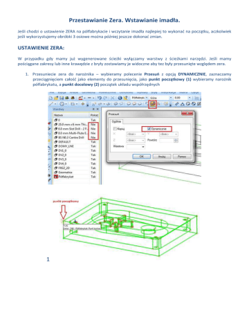Przestawianie Zera. Wstawianie imadła. Jeśli chodzi o ustawienie ZERA na półfabrykacie i wczytanie imadła najlepiej to wykonać na początku, aczkolwiek jeśli wykorzystujemy obróbki 3 osiowe można później jeszcze dokonać zmian. USTAWIENIE ZERA: W przypadku gdy mamy już wygenerowane ścieżki wyłączamy warstwy z ścieżkami narzędzi. Jeśli mamy pościągane zakresy lub inne krawędzie z bryły zostawiamy je widoczne aby tez były przesunięte względem zera. 1. Przesuniecie zera do narożnika – wybieramy polecenie Przesuń z opcją DYNAMICZNIE, zaznaczamy przeciągnięciem całość jako elementy do przesunięcia, jako punkt początkowy (1) wybieramy narożnik półfabrykatu, a punkt docelowy (2) początek układu współrzędnych 1 2 Wynik przesunięcia 2. Przesunięcie zera na środek półfabrykatu – najpierw wybieramy polecenie Linia pojedyncza i rysujemy przekątną pomiędzy narożnikami półfabrykatu, a następnie wybieramy polecenie Przesuń z opcją DYNAMICZNIE, zaznaczamy przeciągnięciem całość jako elementy do przesunięcia, jako punkt początkowy wybieramy środek wyrysowanej przekątnej, a punkt docelowy początek układu współrzędnych 1 2 Wynik przesunięcia Przekątna, która potrzebna była do ustawienia zera może być usunięta bądź ukryta na warstwie. Po przesunięciu zera musimy jeszcze przejść do OBRÓBKI i zaktualizować ścieżki narzędzi Klikamy prawym na sekwęcji i wybieramy Aktualizuj tę Po przeliczeniu ścieżek: Dodatkowo w tym przypadku musimy jeszcze edytować obróbki i pozmieniać wcześniej zdefiniowane poziomy obróbki, ponieważ zero zostało przesunięte również w osi Z. Jeśli przesunięcie byłoby tylko w osiach X i Y wystarczy zaktualizować Sekwencję. KORZYSTANIE Z OPREACJI. Postprocesor jest tak napisany że nie trzeba włączać i wyłączać chłodziwa oddzielnie, gdy korzystamy z operacji jest to robione z automatu ale mamy możliwość to wyłączyć w Ustawieniach operacji: Zaznaczamy Wyłącz M Funkcje na zakładce Ogólne i odznaczamy Zatrzymanie wrzeciona na zakładce Narzędzie Czasem Edgecam pamięta że zmieniliśmy te ustawienia a czasem musimy je ustawić na nowo. Jeśli nie mamy porozbijanych operacji wystarczy zaktualizować Sekwencję a jeśli mamy już je rozbite musimy usunąć te polecenia ręcznie. Finalnie ma wyglądać następująco: Polecenie Kontrola wrzeciona: Auto w kodzie wygeneruje zatrzymanie obrotów i będziemy mieć informacje o błędzie WCZYTANIE IMADŁA Aby wczytać imadło to w środowisku Modelowania zostawiamy widoczną tylko warstwę z PÓŁFABRYKATEM a następnie wybieramy menu MAKRO->Uruchom makro i na dysku C:\ wskazujemy ściezke do folderu z imadłem A następnie Następnie musimy wskazać 2 punkty na jaki wymiar jest rozsunięte imadło: opcja Along X – imadło rozwierane w osi X, opcja Along Y – imadło rozwierane w osi Y, Pierwszy wskazany punkt to szczęka stała a drugi szczęka ruchoma Po wczytaniu imadła z automatu tworzy się tez dodatkowe ZERO Location na dnie imadła, posłuży nam ono do stawienia imadła z detalem względem grafiki maszyny Na pasku narzędzi ustawiamy ponownie AKTYWNE ZERO Góra Po wczytaniu imadła przechodzimy do środowiska OBRÓBKI i edytujemy SEKWENCJĘ gdzie ustawiamy ZERO LOCATION jako ZERO CZEŚCI W przypadku gdy imadło jest wczytane i po raz pierwszy przechodzimy do obróbki lub tworzymy kolejną sekwencję wybieramy to już od razu na karcie sekwencji Wynik ustawienia imadła Aby imadło było widoczne w symulacji i były wykrywane kolizje musimy w środowisku obróbki zdefiniować uchwyty do dodania, po wskazaniu 2 elementów imadła edgecam będzie się pytał o uchwyty do usunięcia, nic nie wskazujemy i akceptujemy Polecenie ze zdefiniowanymi uchwytami przesuwamy na początek sekwencji, aby imadło było widoczne w symulacji od początku SYMULACJA