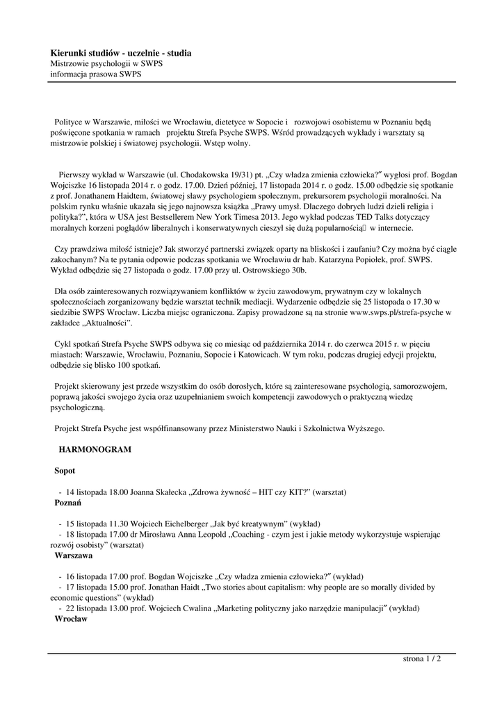Kierunki studiów - uczelnie - studia Mistrzowie psychologii w SWPS informacja prasowa SWPS Polityce w Warszawie, miłości we Wrocławiu, dietetyce w Sopocie i rozwojowi osobistemu w Poznaniu będą poświęcone spotkania w ramach projektu Strefa Psyche SWPS. Wśród prowadzących wykłady i warsztaty są mistrzowie polskiej i światowej psychologii. Wstęp wolny. Pierwszy wykład w Warszawie (ul. Chodakowska 19/31) pt. „Czy władza zmienia człowieka?″ wygłosi prof. Bogdan Wojciszke 16 listopada 2014 r. o godz. 17.00. Dzień później, 17 listopada 2014 r. o godz. 15.00 odbędzie się spotkanie z prof. Jonathanem Haidtem, światowej sławy psychologiem społecznym, prekursorem psychologii moralności. Na polskim rynku właśnie ukazała się jego najnowsza książka „Prawy umysł. Dlaczego dobrych ludzi dzieli religia i polityka?”, która w USA jest Bestsellerem New York Timesa 2013. Jego wykład podczas TED Talks dotyczący moralnych korzeni poglądów liberalnych i konserwatywnych cieszył się dużą popularnością w internecie. Czy prawdziwa miłość istnieje? Jak stworzyć partnerski związek oparty na bliskości i zaufaniu? Czy można być ciągle zakochanym? Na te pytania odpowie podczas spotkania we Wrocławiu dr hab. Katarzyna Popiołek, prof. SWPS. Wykład odbędzie się 27 listopada o godz. 17.00 przy ul. Ostrowskiego 30b. Dla osób zainteresowanych rozwiązywaniem konfliktów w życiu zawodowym, prywatnym czy w lokalnych społecznościach zorganizowany będzie warsztat technik mediacji. Wydarzenie odbędzie się 25 listopada o 17.30 w siedzibie SWPS Wrocław. Liczba miejsc ograniczona. Zapisy prowadzone są na stronie www.swps.pl/strefa-psyche w zakładce „Aktualności”. Cykl spotkań Strefa Psyche SWPS odbywa się co miesiąc od października 2014 r. do czerwca 2015 r. w pięciu miastach: Warszawie, Wrocławiu, Poznaniu, Sopocie i Katowicach. W tym roku, podczas drugiej edycji projektu, odbędzie się blisko 100 spotkań. Projekt skierowany jest przede wszystkim do osób dorosłych, które są zainteresowane psychologią, samorozwojem, poprawą jakości swojego życia oraz uzupełnianiem swoich kompetencji zawodowych o praktyczną wiedzę psychologiczną. Projekt Strefa Psyche jest współfinansowany przez Ministerstwo Nauki i Szkolnictwa Wyższego. HARMONOGRAM Sopot - 14 listopada 18.00 Joanna Skałecka „Zdrowa żywność – HIT czy KIT?” (warsztat) Poznań - 15 listopada 11.30 Wojciech Eichelberger „Jak być kreatywnym” (wykład) - 18 listopada 17.00 dr Mirosława Anna Leopold „Coaching - czym jest i jakie metody wykorzystuje wspierając rozwój osobisty” (warsztat) Warszawa - 16 listopada 17.00 prof. Bogdan Wojciszke „Czy władza zmienia człowieka?″ (wykład) - 17 listopada 15.00 prof. Jonathan Haidt „Two stories about capitalism: why people are so morally divided by economic questions” (wykład) - 22 listopada 13.00 prof. Wojciech Cwalina „Marketing polityczny jako narzędzie manipulacji″ (wykład) Wrocław strona 1 / 2 Kierunki studiów - uczelnie - studia Mistrzowie psychologii w SWPS informacja prasowa SWPS - 25 listopada 17.30 Manuela Pliżga-Jonarska "Jak rozmawiać, żeby wyjść z konfliktu" (warsztat) - 27 listopada 17.00 prof. Katarzyna Popiołek „Trudne czasy dla bliskich związków” (wykład) Więcej informacji na stornie www.swps.pl/strefa-psyche. strona 2 / 2