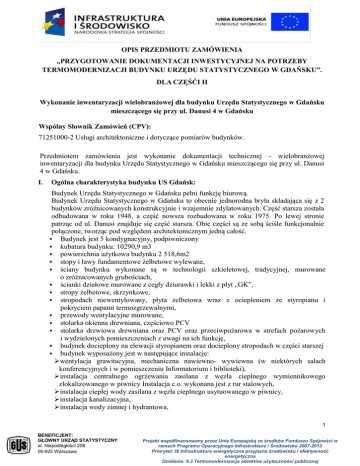 OPIS PRZEDMIOTU ZAMÓWIENIA „PRZYGOTOWANIE DOKUMENTACJI INWESTYCYJNEJ NA POTRZEBY TERMOMODERNIZACJI BUDYNKU URZĘDU STATYSTYCZNEGO W GDAŃSKU”. DLA CZĘŚĆI II Wykonanie inwentaryzacji wielobranżowej dla budynku Urzędu Statystycznego w Gdańsku mieszczącego się przy ul. Danusi 4 w Gdańsku Wspólny Słownik Zamówień (CPV): 71251000-2 Usługi architektoniczne i dotyczące pomiarów budynków. Przedmiotem zamówienia jest wykonanie dokumentacji technicznej - wielobranżowej inwentaryzacji dla budynku Urzędu Statystycznego w Gdańsku mieszczącego się przy ul. Danusi 4 w Gdańsku. I. Ogólna charakterystyka budynku US Gdańsk: Budynek Urzędu Statystycznego w Gdańsku pełni funkcję biurową. Budynek Urzędu Statystycznego w Gdańsku to obecnie jednorodna bryła składająca się z 2 budynków zróżnicowanych konstrukcyjnie i wzajemnie zdylatowanych. Część starsza została odbudowana w roku 1948, a część nowsza rozbudowana w roku 1975. Po lewej stronie patrząc od ul. Danusi znajduje się część starsza. Obie części są ze sobą ściśle funkcjonalnie połączone, tworząc pod względem architektonicznym jedną całość. Budynek jest 5 kondygnacyjny, podpiwniczony kubatura budynku: 10290,9 m3 powierzchnia użytkowa budynku 2 518,6m2 stopy i ławy fundamentowe żelbetowe wylewane, ściany budynku wykonane są w technologii szkieletowej, tradycyjnej, murowane o zróżnicowanych grubościach, ścianki działowe murowane z cegły dziurawki i lekki z płyt „GK”, stropy żelbetowe, skrzynkowe, stropodach niewentylowany, płyta żelbetowa wraz z ociepleniem ze styropianu i pokryciem papami termozgrzewalnymi, przewody wentylacyjne murowane, stolarka okienna drewniana, częściowo PCV stolarka drzwiowa drewniana oraz PCV oraz przeciwpożarowa w strefach pożarowych i wydzielonych pomieszczeniach z uwagi na ich funkcję, budynek docieplony na elewacji styropianem oraz docieplony stropodach w części starszej budynek wyposażony jest w następujące instalacje: wentylacja grawitacyjna, mechaniczna nawiewno- wywiewna (w niektórych salach konferencyjnych i w pomieszczeniu Informatorium i biblioteki), instalacja centralnego ogrzewania zasilana z węzła cieplnego wymiennikowego zlokalizowanego w piwnicy Instalacja c.o. wykonana jest z rur stalowych, instalacja ciepłej wody zasilana z węzła cieplnego usytuowanego w piwnicy, instalacja kanalizacyjna, instalacja wody zimnej i hydrantowa, 1 BENEFICJENT: GŁÓWNY URZĄD STATYSTYCZNY al. Niepodległości 208 00-925 Warszawa Projekt współfinansowany przez Unię Europejską ze środków Funduszu Spójności w ramach Programu Operacyjnego Infrastruktura i Środowisko 2007-2013 Priorytet: IX Infrastruktura energetyczna przyjazna środowisku i efektywność energetyczna Działanie: 9.3 Termomodernizacja obiektów użyteczności publicznej instalacja chłodzenia- pojedyncze pomieszczenia za pomocą klimatyzatorów, sala konferencyjna za pomocą rekuperatora, instalacja elektryczna, oświetlenia wbudowanego: oprawy rastrowe, świetlówkowe rastrowe instalacja sygnalizacji przeciwpożarowej, instalacja przeciwwłamaniowa, instalacja kontroli dostępu, instalacja telefoniczna, instalacja sieci logicznej LAN, instalacja oświetlenia awaryjnego, Zamawiający umożliwi przeprowadzenie wizji lokalnej w budynku Urzędu Statystycznego w Gdańsku mieszczącego się przy ul. Danusi 4 w Gdańsku w terminie wskazanym w Specyfikacji Istotnych Warunków Zamówienia. II. 1. Inwentaryzacja wielobranżowa Dokumentacja wykonania przedmiotowej inwentaryzacji wielobranżowej musi zawierać: 1) Mapę zasadniczą (lokalizacyjną ewidencyjną) przyjętą do zasobu geodezyjnego. Przyłącza sieci itp. 2) Ogólny opis techniczny zawierający kolejno w punktach informacje na temat: I. typu (rodzaju) obiektu budowlanego, II. jego przeznaczenia i sposobu użytkowania, III. okresu wykonania, IV. określenia podstawowych technologii budowlanych wykonania: fundamentów (o ile określenie ich jest możliwe bez wykonania odkrywek), ścian piwnicznych, ścian części nadziemnej, stropów między kondygnacyjnych, rodzaju konstrukcji dachu/ stropodachu, konstrukcji schodów wewnętrznych, zasadniczego wyposażenia technicznego budynku (obecność dźwigów, rodzaje instalacji wewnętrznych, urządzeń specjalistycznych, itp.), - systemu wentylacji budynku, - systemu ogrzewania budynku, wraz ze źródłem ciepła z którego korzysta obiekt (ewentualnie moc grzewcza zainstalowanych urządzeń, jeśli jest znana), V. rodzaju i budowy zastosowanej stolarki okiennej i drzwiowej, VI. bilansu powierzchni poszczególnych pomieszczeń z podziałem na poszczególne kondygnacje i podsumowaniem całościowym obiektu, VII. bilansu kubatury poszczególnych pomieszczeń z podziałem na poszczególne kondygnacje i podsumowaniem całościowym obiektu, VIII. charakterystyki przegród wewnętrznych i zewnętrznych, określonej na podstawie odkrywek wykonanych w miejscach najmniej widocznych, skonsultowanych z użytkownikiem budynku (w przypadku przegród zewnętrznych bezwzględnie konieczne jest podanie zasadniczej budowy przegrody z opisem i grubością poszczególnych warstw), IX. ogólnego stanu technicznego budynku, dokonanego na podstawie wizji lokalnej oględzin, określającego stan posadzek, ścian wewnętrznych i zewnętrznych, - 2 BENEFICJENT: GŁÓWNY URZĄD STATYSTYCZNY al. Niepodległości 208 00-925 Warszawa Projekt współfinansowany przez Unię Europejską ze środków Funduszu Spójności w ramach Programu Operacyjnego Infrastruktura i Środowisko 2007-2013 Priorytet: IX Infrastruktura energetyczna przyjazna środowisku i efektywność energetyczna Działanie: 9.3 Termomodernizacja obiektów użyteczności publicznej sufitów, ewentualnych zauważonych pęknięć, zarysowań ścian nośnych lub działowych i drożności kanałów wentylacyjnych. 3) Opis i ocenę ogólnego stanu technicznego instalacji, w tym urządzenia, armaturę, charakterystyczne parametry techni