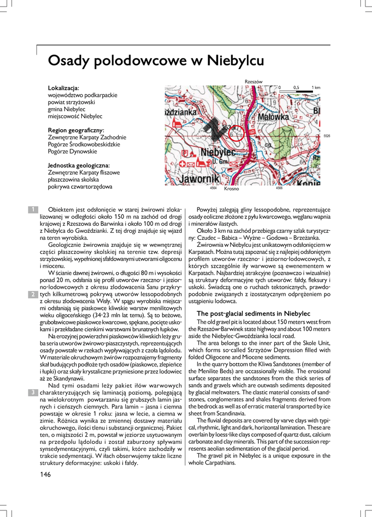 Osady polodowcowe w Niebylcu Rzeszów Lokalizacja: województwo podkarpackie powiat strzy¿owski gmina Niebylec miejscowoœæ Niebylec Region geograficzny: Zewnêtrzne Karpaty Zachodnie Pogórze Œrodkowobeskidzkie Pogórze Dynowskie Jednostka geologiczna: Zewnêtrzne Karpaty fliszowe p³aszczowina skolska pokrywa czwartorzêdowa 1 Obiektem jest ods³oniêcie w starej ¿wirowni zlokalizowanej w odleg³oœci oko³o 150 m na zachód od drogi krajowej z Rzeszowa do Barwinka i oko³o 100 m od drogi z Niebylca do GwoŸdzianki. Z tej drogi znajduje siê wjazd na teren wyrobiska. Geologicznie ¿wirownia znajduje siê w wewnêtrznej czêœci p³aszczowiny skolskiej na terenie tzw. depresji strzy¿owskiej, wype³nionej sfa³dowanymi utworami oligocenu i miocenu. W œcianie dawnej ¿wirowni, o d³ugoœci 80 m i wysokoœci ponad 20 m, ods³ania siê profil utworów rzeczno- i jeziorno-lodowcowych z okresu zlodowacenia Sanu przykry2 tych kilkumetrow¹ pokryw¹ utworów lessopodobnych z okresu zlodowacenia Wis³y. W sp¹gu wyrobiska miejscami ods³aniaj¹ siê piaskowce kliwskie warstw menilitowych wieku oligoceñskiego (34-23 mln lat temu). S¹ to be¿owe, grubo³awicowe piaskowce kwarcowe, spêkane, pociête uskokami i przek³adane cienkimi warstwami brunatnych ³upków. Na erozyjnej powierzchni piaskowców kliwskich le¿y gruba seria utworów ¿wirowo-piaszczystych, reprezentuj¹cych osady powsta³e w rzekach wyp³ywaj¹cych z czo³a l¹dolodu. W materiale okruchowym ¿wirów rozpoznajemy fragmenty ska³ buduj¹cych pod³o¿e tych osadów (piaskowce, zlepieñce i ³upki) oraz ska³y krystaliczne przyniesione przez lodowiec a¿ ze Skandynawii. Nad tymi osadami le¿y pakiet i³ów warwowych 3 charakteryzuj¹cych siê laminacj¹ poziom¹, polegaj¹c¹ na wielokrotnym powtarzaniu siê grubszych lamin jasnych i cieñszych ciemnych. Para lamin – jasna i ciemna powstaje w okresie 1 roku: jasna w lecie, a ciemna w zimie. Ró¿nica wynika ze zmiennej dostawy materia³u okruchowego, iloœci tlenu i substancji organicznej. Pakiet ten, o mi¹¿szoœci 2 m, powsta³ w jeziorze usytuowanym na przedpolu l¹dolodu i zosta³ zaburzony sp³ywami synsedymentacyjnymi, czyli takimi, które zachodzi³y w trakcie sedymentacji. W i³ach obserwujemy tak¿e liczne struktury deformacyjne: uskoki i fa³dy. 146 5526 4564 Krosno 4566 Powy¿ej zalegaj¹ gliny lessopodobne, reprezentuj¹ce osady eoliczne z³o¿one z py³u kwarcowego, wêglanu wapnia i minera³ów ilastych. Oko³o 3 km na zachód przebiega czarny szlak turystyczny: Czudec – Babica – Wy¿ne – Godowa – Brze¿anka. ¯wirownia w Niebylcu jest unikatowym ods³oniêciem w Karpatach. Mo¿na tutaj zapoznaæ siê z najlepiej ods³oniêtym profilem utworów rzeczno- i jeziorno-lodowcowych, z których szczególnie i³y warwowe s¹ ewenementem w Karpatach. Najbardziej atrakcyjne (poznawczo i wizualnie) s¹ struktury deformacyjne tych utworów: fa³dy, fleksury i uskoki. Œwiadcz¹ one o ruchach tektonicznych, prawdopodobnie zwi¹zanych z izostatycznym odprê¿eniem po ust¹pieniu lodowca. The post-glacial sediments in Niebylec The old gravel pit is located about 150 meters west from the Rzeszów-Barwinek state highway and about 100 meters aside the Niebylec-GwoŸdzianka local road. The area belongs to the inner part of the Skole Unit, which forms so-called Strzy¿ów Depression filled with folded Oligocene and Miocene sediments. In the quarry bottom the Kliwa Sandstones (member of the Menilite Beds) are occassionally visible. The erosional surface separates the sandstones from the thick series of sands and gravels which are outwash sediments deposited by glacial meltwaters. The clastic material consists of sandstones, conglomerates and shales fragments derived from the bedrock as well as of erratic material transported by ice sheet from Scandinavia. The fluvial deposits are covered by varve clays with typical, rhythmic, light and dark, horizontal lamination. These are overlain by loess-like clays composed of quartz dust, calcium carbonate and clay minerals. This part of the succession represents aeolian sedimentation of the glacial period. The gravel pit in Niebylec is a unique exposure in the whole Carpathians. Niebylec 1 2 3 Wybrana literatura: 137, 138, 459, 460, 461 Autor karty stanowiska dokumentacyjnego i fotografii: T. Malata (2005) 147