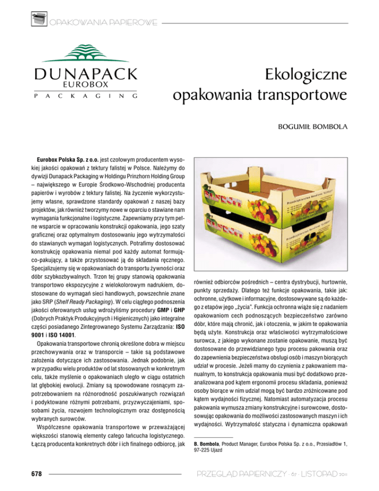 OPAKOWANIA PAPIEROWE Ekologiczne opakowania transportowe BOGUMIŁ BOMBOLA Eurobox Polska Sp. z o.o. jest czołowym producentem wysokiej jakości opakowań z tektury falistej w Polsce. Należymy do dywizji Dunapack Packaging w Holdingu Prinzhorn Holding Group – największego w Europie Środkowo-Wschodniej producenta papierów i wyrobów z tektury falistej. Na życzenie wykorzystujemy własne, sprawdzone standardy opakowań z naszej bazy projektów, jak również tworzymy nowe w oparciu o stawiane nam wymagania funkcjonalne i logistyczne. Zapewniamy przy tym pełne wsparcie w opracowaniu konstrukcji opakowania, jego szaty graficznej oraz optymalnym dostosowaniu jego wytrzymałości do stawianych wymagań logistycznych. Potrafimy dostosować konstrukcję opakowania niemal pod każdy automat formująco-pakujący, a także przystosować ją do składania ręcznego. Specjalizujemy się w opakowaniach do transportu żywności oraz dóbr szybkozbywalnych. Trzon tej grupy stanowią opakowania transportowo ekspozycyjne z wielokolorowym nadrukiem, dostosowane do wymagań sieci handlowych, powszechnie znane jako SRP (Shelf Ready Packaging). W celu ciągłego podnoszenia jakości oferowanych usług wdrożyliśmy procedury GMP i GHP (Dobrych Praktyk Produkcyjnych i Higienicznych) jako integralne części posiadanego Zintegrowanego Systemu Zarządzania: ISO 9001 i ISO 14001. Opakowania transportowe chronią określone dobra w miejscu przechowywania oraz w transporcie – takie są podstawowe założenia dotyczące ich zastosowania. Jednak podobnie, jak w przypadku wielu produktów od lat stosowanych w konkretnym celu, także myślenie o opakowaniach uległo w ciągu ostatnich lat głębokiej ewolucji. Zmiany są spowodowane rosnącym zapotrzebowaniem na różnorodność poszukiwanych rozwiązań i podyktowane różnymi potrzebami, przyzwyczajeniami, sposobami życia, rozwojem technologicznym oraz dostępnością wybranych surowców. Współczesne opakowania transportowe w przeważającej również odbiorców pośrednich – centra dystrybucji, hurtownie, punkty sprzedaży. Dlatego też funkcje opakowania, takie jak: ochronne, użytkowe i informacyjne, dostosowywane są do każdego z etapów jego „życia”. Funkcja ochronna wiąże się z nadaniem opakowaniom cech podnoszących bezpieczeństwo zarówno dóbr, które mają chronić, jak i otoczenia, w jakim te opakowania będą użyte. Konstrukcja oraz właściwości wytrzymałościowe surowca, z jakiego wykonane zostanie opakowanie, muszą być dostosowane do przewidzianego typu procesu pakowania oraz do zapewnienia bezpieczeństwa obsługi osób i maszyn biorących udział w procesie. Jeżeli mamy do czynienia z pakowaniem manualnym, to konstrukcja opakowania musi być dodatkowo przeanalizowana pod kątem ergonomii procesu składania, ponieważ osoby biorące w nim udział mogą być bardzo zróżnicowane pod kątem wydajności fizycznej. Natomiast automatyzacja procesu pakowania wymusza zmiany konstrukcyjne i surowcowe, dostosowując opakowania do możliwości zastosowanych maszyn i ich wydajności. Wytrzymałość statyczna i dynamiczna opakowań większości stanowią elementy całego łańcucha logistycznego. Łączą producenta konkretnych dóbr i ich finalnego odbiorcę, jak 678 B. Bombola, Product Manager, Eurobox Polska Sp. z o.o., Przesiadłów 1, 97-225 Ujazd PRZEGLĄD PAPIERNICZY · 67 · LISTOPAD 2011