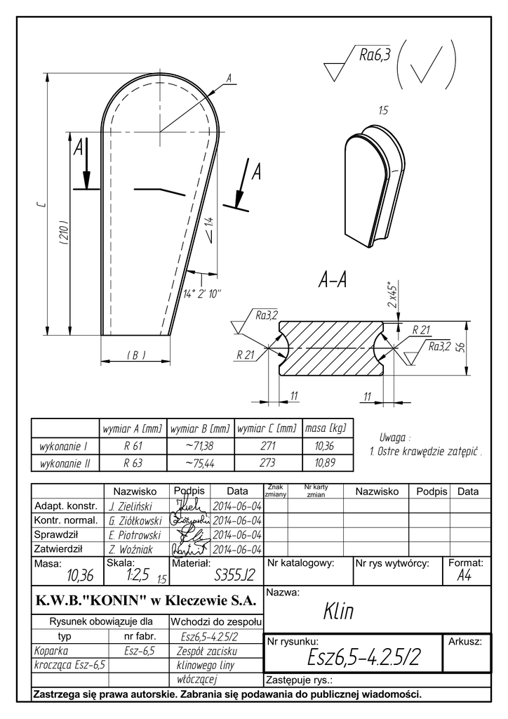 Ra6,3 A 1:5 A A-A Ra3,2 R 21 Ra3,2 R 21 (B ) 11 11 wymiar A [mm] wymiar B [mm] wymiar C [mm] masa [kg] R 61 271 10,36 ~71,38 wykonanie I 10,89 273 R 63 wykonanie II ~75,44 Nazwisko Adapt. konstr. J. Zieliński Kontr. normal. G. Ziółkowski Sprawdził E. Piotrowski Zatwierdził Z. Woźniak Skala: Masa: 10,36 1:2,5 1:5 Podpis Data Koparka krocząca Esz-6,5 Esz-6,5 Nr karty zmian Uwaga : 1. Ostre krawędzie zatępić . Nazwisko Podpis Data 2014-06-04 2014-06-04 2014-06-04 2014-06-04 Materiał: S355J2 K.W.B."KONIN" w Kleczewie S.A. Rysunek obowiązuje dla typ nr fabr. Znak zmiany 56 14° 2' 10" 2 x45° ( 210 ) 1:4 C A Nr katalogowy: Nazwa: Format: A4 Klin Wchodzi do zespołu Esz6,5-4.2.5/2 Zespół zacisku klinowego liny włóczącej Nr rys wytwórcy: Nr rysunku: Esz6,5-4.2.5/2 Zastępuje rys.: Zastrzega się prawa autorskie. Zabrania się podawania do publicznej wiadomości. Arkusz: