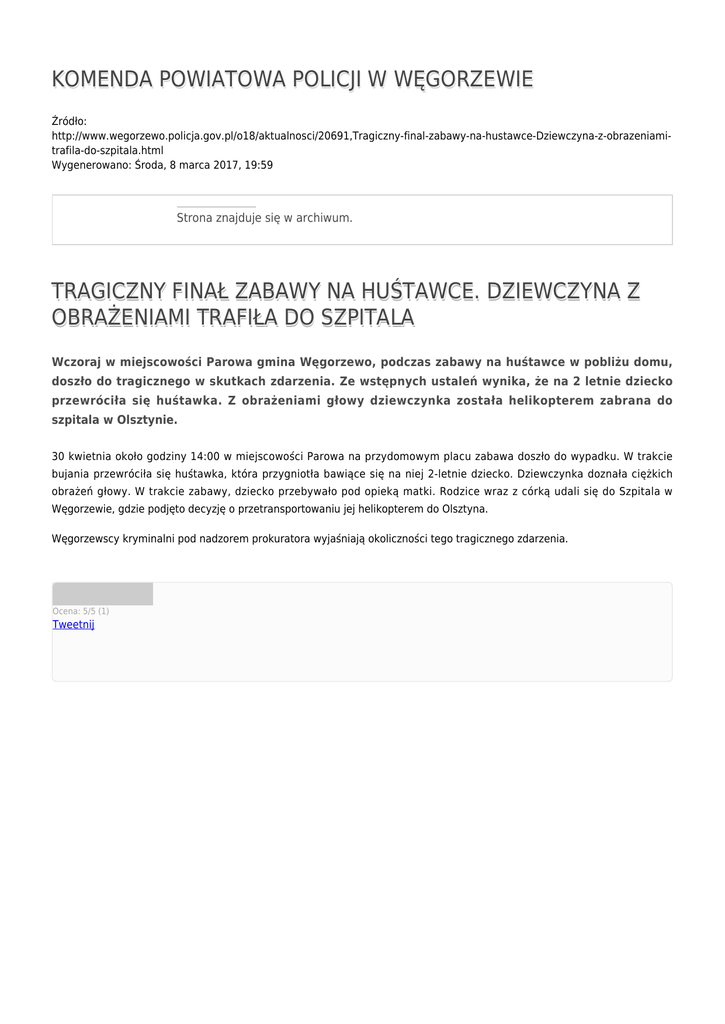 KOMENDA POWIATOWA POLICJI W WĘGORZEWIE Źródło: http://www.wegorzewo.policja.gov.pl/o18/aktualnosci/20691,Tragiczny-final-zabawy-na-hustawce-Dziewczyna-z-obrazeniamitrafila-do-szpitala.html Wygenerowano: Środa, 8 marca 2017, 19:59 Strona znajduje się w archiwum. TRAGICZNY FINAŁ ZABAWY NA HUŚTAWCE. DZIEWCZYNA Z OBRAŻENIAMI TRAFIŁA DO SZPITALA Wczoraj w miejscowości Parowa gmina Węgorzewo, podczas zabawy na huśtawce w pobliżu domu, doszło do tragicznego w skutkach zdarzenia. Ze wstępnych ustaleń wynika, że na 2 letnie dziecko przewróciła się huśtawka. Z obrażeniami głowy dziewczynka została helikopterem zabrana do szpitala w Olsztynie. 30 kwietnia około godziny 14:00 w miejscowości Parowa na przydomowym placu zabawa doszło do wypadku. W trakcie bujania przewróciła się huśtawka, która przygniotła bawiące się na niej 2-letnie dziecko. Dziewczynka doznała ciężkich obrażeń głowy. W trakcie zabawy, dziecko przebywało pod opieką matki. Rodzice wraz z córką udali się do Szpitala w Węgorzewie, gdzie podjęto decyzję o przetransportowaniu jej helikopterem do Olsztyna. Węgorzewscy kryminalni pod nadzorem prokuratora wyjaśniają okoliczności tego tragicznego zdarzenia. Ocena: 5/5 (1) Tweetnij