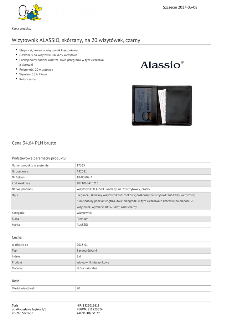 Szczecin 2017-03-08 Karta produktu: Wizytownik ALASSIO, skórzany, na 20 wizytówek, czarny Elegancki, skórzany wizytownik kieszonkowy Doskonały na wizytówki lub karty kredytowe Funkcjonalny podział wnętrza, dwie przegródki w tym kieszonka z siateczki Pojemność: 20 wizytówek Wymiary: 105x75mm Kolor czarny Cena 34,64 PLN brutto Podstawowe parametry produktu Numer produktu w systemie 17365 Nr dostawcy A42021 Nr Celcen 18-00502-7 Kod kreskowy 4021068420216 Nazwa produktu Wizytownik ALASSIO, skórzany, na 20 wizytówek, czarny Opis Elegancki, skórzany wizytownik kieszonkowy; doskonały na wizytówki lub karty kredytowe; funkcjonalny podział wnętrza, dwie przegródki w tym kieszonka z siateczki; pojemność: 20 wizytówek; wymiary: 105x75mm; kolor czarny Kategoria Wizytowniki Klasa Premium Marka ALASSIO Cecha W ofercie od 2013-01 Typ Z przegródkami Indeks B.d. Produkt Wizytownik kieszonkowy Materiał Skóra naturalna Ilość Mieści wizytówek 20 Toris ul. Władysława Jagieły 9/1 70-260 Szczecin NIP: 8521011619 REGON: 811220024 +48 91 482 51 77 Szczecin 2017-03-08 Karta katalogowa produktu cd. Wizytownik ALASSIO, skórzany, na 20 wizytówek, czarny Wymiary Wymiary (mm) 105x75 Wspólny słownik zamówień CPV 30199731-3 Wizytowniki Certyfikaty Nowy produkt w ofercie Standard Hit Standard Kolor Kolor Czarny Serdecznie zapraszamy do współpracy Toris zespół. Toris ul. Władysława Jagieły 9/1 70-260 Szczecin NIP: 8521011619 REGON: 811220024 +48 91 482 51 77