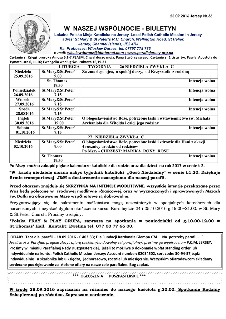 25.09.2016 Jersey Nr.36 W NASZEJ WSPÓLNOCIE - BIULETYN Lokalna Polska Misja Katolicka na Jersey Local Polish Catholic Mission in Jersey adres: St Mary & St Peter’s R.C. Church, Wellington Road, St Helier, Jersey, Channel Islands, JE2 4RJ Ks. Proboszcz: Wiesław Duracz tel. 07797 778 786 e-mail: [email protected] ; www.parafiajersey.org.uk Czytanie z Księgi proroka Amosa 6,1-7;PSALM: Chwal duszo moja, Pana Stwórcę swego; Czytanie z 1 Listu św. Pawła Apostoła do Tymoteusza 6,11-16; Ewangelia według św. Łukasza 16,19-31 Niedziela 25.09.2016 Poniedziałek 26.09.2016 Wtorek 27.09.2016 Środa 28.082016 Piątek 30.09.2016 Sobota 01.10.2016 Niedziela 02.10.2016 LITURGIA TYGODNIA - 26 NIEDZIELA ZWYKŁA C St.Mary&St.Peter’ Za zmarłego ojca, o spokój duszy, od Krzysztofa z rodziną 9.00 St. Thomas Intencja wolna 19.30 St.Mary&St.Peter’ Intencja wolna 7.15 St.Mary&St.Peter’ Intencja wolna 7.15 St.Mary&St.Peter’ Intencja wolna 7.15 St.Mary&St.Peter’ O błogosławieństwo Boże, potrzebne łaski i wstawiennictwo św. Michała 19.00 Archanioła dla Witolda i całej jego rodziny St.Mary&St.Peter’ Intencja wolna 7.15 27 NIEDZIELA ZWYKŁA C St.Mary&St.Peter’ O błogosławieństwo Boże, potrzebne łaski i zdrowie dla Hani z okazji 9.00 4 rocznicy urodzin od rodziców Po Mszy - CHRZEST: MARIKA ROXY ROSE St. Thomas Intencja wolna 19.30 Po Mszy można zakupić piękne kalendarze katolickie dla rodzin oraz dla dzieci na rok 2017 w cenie Ł 2. *W każdą niedzielę można nabyć tygodnik katolicki „Gość Niedzielny” w cenie Ł1.20. Dziękuję firmie transportowej J&M z dostarczenie czasopisma dla naszej parafii. Przed ołtarzem znajduje się SKRZYNKA NA INTENCJE MODLITEWNE: wszystkie intencje przekazane przez Was będą polecane w środowej modlitwie różańcowej, oraz w wyznaczonych i sprawowanych Mszach św. Datki na ofiarowane Msze wspólnotowe są dobrowolne. Przygotowujący się do sakramentu małżeństwa mogą uczestniczyć w specjalnych katechezach dla narzeczonych i uzyskać dyplom ukończenia kursu. Kurs będzie 24 i 25.10.2016 g.19.00-21.00. w St. Mary & St.Peter Church. Prosimy o zapisy. *Polska PRAY & PLAY GRUPA, zaprasza na spotkania w poniedziałki od g.10.00-12.00 w St.Thomas’ Hall. Kontakt: Ewelina tel. 077 00 77 66 00. OFIARY: Taca dla parafii – 18.09.2016 - £ 403.33; Dla Fundacji Kardynała Glempa £74. Na potrzeby parafii – £ Jeżeli ktoś z Parafian pragnie złożyć ofiarę czekiem/na dowolny cel parafialny/, prosimy go wypisać na – P.C.M. JERSEY. Prosimy w imieniu Parafialnej Rady Duszpasterskiej, jeżeli to możliwe o dokonanie wpłat standing order lub indywidualnie na konto: Polish Catholic Mission Jersey: Account number: 02034502, sort code: 30-94-57,bądź indywidualnie u skarbnika lub u księdza, jednorazowo, rocznie lub miesięcznie. Wszystkim ofiarodawcom składamy serdeczne podziękowanie za złożone ofiary na nasze cele parafialne. Bóg zapłać. *** OGŁOSZENIA DUSZPASTERSKIE *** W środę 28.09.2016 zapraszam na różaniec do naszego kościoła g.20.00. Spotkanie Rodziny Szkaplerznej po różańcu. Zapraszam serdecznie. Zainteresowanych włączeniem się do Róż Różańcowych proszę o osobisty kontakt. Zmiana tajemnic w każdą pierwszą niedzielę miesiąca po Mszy wieczornej o g.19.30. Piątek – g.18.45 Koronka do Bożego Miłosierdzia w St.Mary’ & St. Peter. Po Mszy zapraszam na adorację Najświętszego Sakramentu, którą zakończymy Apelem Jasnogórskim o 20.45. Podczas adoracji możliwość spowiedzi. W imieniu Parafialnej Rady Duszpasterskiej i Administracyjnej po ostatnim zebraniu 20.09.2016, zwracam się z prośbą do wszystkich Parafian o większe zaangażowanie i ofiarność w celu płynnego utrzymania zobowiązań finansowych związanych z wynajmem kościoła i utrzymaniem mieszkania. W miesiącu sierpniu 2016 stan konta wyniósł na 26.08.2016 – Ł 102.20 !!! , z powodu braku środków na koncie nie dokonano „standing order” za wynajem kościoła. Aby uniknąć takich sytuacji potrzebujemy płynności finansowej, aby móc korzystać z budynków i normalnie funkcjonować. Obecnie bilans jest dodatni i wynosi Ł 1.265.03. Od września Polska Misja Katolicka i Diecezja Portsmouth podpisała kontrakt w sprawie wynajmu kościoła i mieszkania oraz warunków funkcjonowania wspólnoty i pracy księdza proboszcza w polskiej parafii . Koszt wynajmu budynków wzrósł o Ł 621.12 w skali roku w stosunku do ubiegłego roku i wynosi obecnie Ł 11,280.00 Proszę Was zatem o większą ofiarność ,zrozumienie, i troskę o przyszłość naszej parafii. 1. Dobiega końca wrzesień. Powróciliśmy już do obowiązków związanych z nowym rokiem szkolnym, do codziennych spraw po czasie wakacji i urlopów. Pragniemy wszystkich zaprosić do aktywnego włączenia się w życie naszej parafialnej wspólnoty. 2.W czwartek przypada święto Świętych Archaniołów Michała, Gabriela i Rafała. Pamiętamy z lekcji religii, że poza światem widzialnym istnieje świat rzeczy niewidzialnych, świat duchowy. Pan Bóg stworzył Aniołów i powierzył im misję bycia Jego posłańcami i jednocześnie naszymi towarzyszami w ziemskiej pielgrzymce. Aniołów, których będziemy wspominać w liturgii w najbliższy czwartek, nazywamy Archaniołami. Jak naucza w jednej z homilii Święty Grzegorz Wielki, są oni Bożymi zwiastunami w sprawach większej wagi. Zapraszamy zatem do wspólnej modlitwy podczas Mszy św. 3. Najbliższa sobota będzie pierwszą sobotą października – miesiąca różańcowej modlitwy. W tym miesiącu będziemy spotykać się na nabożeństwach różańcowych w środy o g.20.00 i w piątki po Mszy wieczornej o g.19.00. 4. Serdecznie pozdrawiamy solenizantów i jubilatów tygodnia, przekazując słowa najlepszych życzeń. W TYM TYGODNIU PATRONUJĄ NAM:*27 IX – św. Wincenty à Paulo, prezbiter, który założył zgromadzenia księży misjonarzy i sióstr miłosierdzia, przyczyniając się tym samym do lepszej 