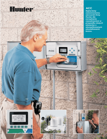 ACC Najbardziej zaawansowany sterownik firmy Hunter dla zarz¹dzania nawadnianiem w przypadku du¿ych obszarów o skomplikowanym ukszta³towaniu terenu. M odel ACC ³¹czy w sobie wygodê u¿ytkowania oraz uniwersalnoœæ konstrukcji modu³owej oferuj¹c najbardziej zaawansowany sterownik w ofercie firmy Hunter. Modu³owa budowa pozwala nie tylko na pod³¹czenie zadanej liczby sekcji, lecz tak¿e u³atwia rozbudowê do rzeczywistej komunikacji dwudro¿nej z centralnym systemem sterowania firmy Hunter. Sterownik mo¿na dostosowaæ do potrzeb u¿ytkownika przy wykorzystaniu po¿¹danych funkcji: dodawanych modu³ów, sekcji czy centralnych systemów komunikacji. Jednak najwa¿niejsza zaleta sterownika ACC s¹ jego funkcje, miedzy innymi monitorowanie wydatku wody w czasie rzeczywistym. Dziêki temu sterownik b³yskawicznie reaguje na zmienny wydatek Metalowa obudowa Postument plastikowy Postument metalowy wody wed³ug sekcji oraz rejestruje zu¿ycie wody. Sterownik ACC oferuje tak¿e 6 niezale¿nych programów, 4 programy dostosowane specjalnie do potrzeb u¿ytkownika, a tak¿e wyj¹tkowa mo¿liwoœæ dostosowania pracy systemu do przerw w nawadnianiu. Ponadto, du¿y i podœwietlany wyœwietlacz LCD oferuje mo¿liwoœæ wygodnej personalizacji sekcji i nazw programów. W£AŒCIWOŒCI I ZALETY Monitorowanie wydatku wody w czasie rzeczywistym w trybie niezale¿nym System monitoruje wydatek wody ka¿dej sekcji i automatycznie koryguje nieprawid³owoœci Rozbudowa sekcji dziêki modu³om wtykowym Prosta rozbudowa poprzez dodawanie kolejnych sekcji oraz uproszczone zarz¹dzanie zapasami czêœci £atwa rozbudowa modu³owa do dwudro¿nej komunikacji z centralnym systemem steruj¹cym Mo¿liwoœæ rozbudowy o po³¹czenie kablowe, modem lub system zdalnego sterowania 6 ca³kowicie niezale¿nych programów (plus 4 dostosowane specjalnie do potrzeb u¿ytkownika) Standardowy program oferuj¹ oddzielne cykle dzienne oraz 10 czasów startu czyni¹c sterownik ACC niezwykle elastycznym w przypadku obszarów o z³o¿onym ukszta³towaniu terenu. Niezale¿ne opcje harmonogramu dziennego dla ka¿dego programu Bogate opcje harmonogramu (wybór dni tygodnia, dni parzystych/nieparzystych, pominiêcie okresu do 31 dni) Trwa³a pamiêæ Dane nie zostan¹ utracone w przypadku braku zasilania, nie wymaga stosowania baterii Regulacja cyklu i wsi¹kania wed³ug sekcji Czas dzia³ania mo¿e zostaæ podzielony na nastêpuj¹ce po sobie cykle w celu zminimalizowania iloœci wody sp³ywaj¹cej Watering Window Manager™ U¿ytkownik okreœla przerwy w nawadnianiu; funkcja ta dzia³a niezale¿nie od wszelkich programów nawadniania zdefiniowanych przez u¿ytkownika Mo¿liwoœæ pod³¹czenia licznych czujników Mo¿liwoœæ pod³¹czenia urz¹dzeñ monitoruj¹cych warunki pogodowe oraz wydatek wody w celu zamkniêcia system w przypadku wyst¹pienia nietypowych warunków Du¿y wyœwietlacz LCD z podœwietleniem Dla ³atwego odczytu w przyæmionym œwietle jak i w jasnym s³oñcu. Funkcja przerwij/wznów Pozwala u¿ytkownikowi zawiesiæ nawadnianie i potem wznowiæ w miejscu zatrzymania. Przycisk informacyjny Zapewnia pomoc w programowaniu i otwiera ukryte funkcje Podwójnie programowalny zawór g³ówny / obwód pompy Mo¿e pracowaæ normalnie zamkniêty lub normalnie otwarty. Mo¿liwoœæ nadania nazw programom i stacjom £atwo tworzy pole identyfikacyjne programów i stacji. Regulacja cyklu i wsi¹kania wed³ug sekcji Minimalizuje iloœæ wody sp³ywaj¹cej. Monitorowanie wydatku wody w czasie rzeczywistym: natychmiastowa reakcja na nieprawid³owy wydatek wody Monitorowanie wydatku wody w czasie rzeczywistym pozwala na natychmiastowe wykrycie przypadków zbyt ma³ego lub du¿ego wydatku wody, zanim dojdzie do uszkodzenia systemu lub otoczenia. U¿ytkownik okreœla wartoœæ progowa, któr¹ system ma rozpoznaæ, jako najwy¿sz¹ Du¿y podœwietlany wyœwietlacz LCD dostarcza i najni¿sz¹ dopuszczaln¹ wartoœæ wielu informacji oraz przeprowadza u¿ytkownika przez proces programowania. wydatku wody. W przypadku przekroczenia wartoœci progowych sterownik ACC wykrywa sekcje dzia³aj¹ce nieprawid³owo, odcina odpowiednie obszary oraz kontynuuje nawadnianie przy wykorzystaniu pozosta³ych sekcji. W celu dodania do sterownika ACC funkcji monitorowania wydatku wody w czasie rzeczywistym wystarczy pod³¹czyæ czujnik HFS oraz ³¹cznik teowy FCT odpowiedni dla danego przewodu rurowego. Modele postumentu ACC Dziêki konstrukcji najwy¿szej jakoœci, postumenty z tworzywa sztucznego dla sterowników ACC poradz¹ sobie w dowolnych warunkach stworzonych przez matkê naturê lub cz³owieka. Postument wykonany z tworzywa sztucznego nie rdzewieje, jest odporny na czynniki pogodowe oraz promieniowanie UV, co zapobiega wyblakniêciu. Ponadto, ich wnêtrza oferuj¹ niezwykle du¿o miejsca. Przestrzeñ ta pozwala na zamontowanie okablowania polowego a tak¿e przewodów centralnego systemu sterowania. Mo¿liwe jest równie¿ zamontowanie na sta³e odbiornika dla modu³u zdalnego sterowania ICR. Po³ó¿ kres awariom zwi¹zanym z wydatkiem wody! W celu dodania do sterownika ACC funkcji monitorowania wydatku wody w czasie rzeczywistym wystarczy pod³¹czyæ czujnik HFS oraz ³¹cznik teowy FCT odpowiedni dla danego przewodu rurowego. Plastikowy postument jest idealnej wysokoœci i pod idealnym k¹tem dla ³atwego programowania. Modele ACC-1200 - 12-sekcyjny sterownik, obudowa wykonana z metalu, mo¿liwoœæ pod³¹czenia 42 sekcji ACC-1200-PP - 12-sekcyjny sterownik, postument wykonany z tworzywa sztucznego, mo¿liwoœæ pod³¹czenie 42 sekcji ACC-99D - 2-przewodowy sterownik dekoder z mo¿liwoœci¹ pod³¹czenia 99 sekcji, metalowa obudowa ACC-99DPP - 2-przewodowy sterownik dekoder z mo¿liwoœci¹ pod³¹czenia 99 sekcji, postument z tworzywa sztucznego ACM-600 - 6-sekcyjny modu³ kompatybilny z dowolnym sterownikiem ACC AGM-600 - 6-sekcyjny modu³ wyposa¿ony w ochronê przeciwprzepiêciow¹ HFS - czujnik wydatku wody, wymaga zastos