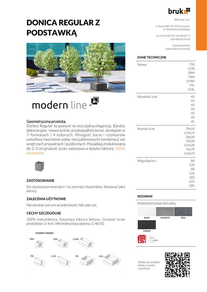 DONICA REGULAR Z PODSTAWKĄ BRUK Sp. z o.o. ul. Nowa 28G, 44-352 Czyzowice (k. Wodzislawia Slaskiego) tel. 32 456 09 70 / 32 456 09 71 [email protected] www.bruk.info.pl www.modernline.info.pl DANE TECHNICZNE Nazwa 79S 119S 39M 79M 119M 79L 119L 45 45 45 45 45 45 45 Wysokość (cm) Geometryczna prostota. Donice Regular to pomysł na oszczędną elegancję. Bardzo dekoracyjne, nowocześnie prostopadłościenne, dostępne w 7 formatach i 4 kolorach. Mnogość barw i rozmiarów umożliwa tworzenie wielu nieszablonowych kombinacji we wnętrzach prywatnych i publicznych. Posiadają zredukowaną do 2-3 cm grubość ścian, satynowa w dotyku fakturę. 100% handmade. Rozmiar (cm) 79x19 119x19 39x39 79x39 119x39 79x79 119x79 84 120 68 126 183 215 305 Waga (kg/szt.) ZASTOSOWANIE Do stosowania wewnątrz i na zewnątrz budynków. Stosować jako donicę. ZALECENIA UŻYTKOWE Nie dotykać ostrymi przedmiotami. Nie uderzać. WZORNIK POWIERZCHNIA NATURAL CECHY SZCZEGÓLNE 100% manufaktura. Satynowa faktura betonu. Grubość ścian produktów: 2-4cm. Minimalna klasa betonu: C 40/50. WHITE CARBON Zobacz ten produkt online w swoim smartfonie CONCRETE STEEL