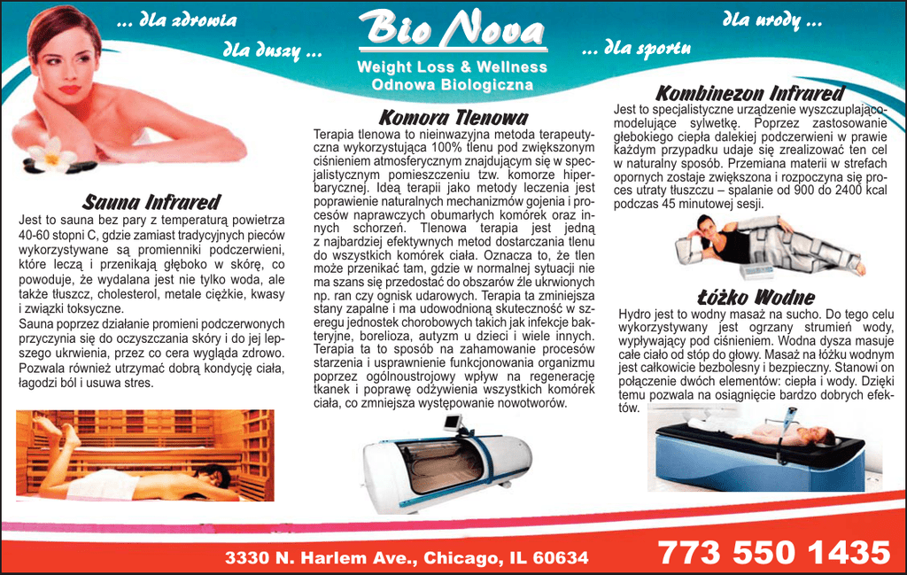 ... dla zdrowia dla duszy ... Bio B io Nova Weight Loss & Wellness Odnowa Biologiczna dla urody ... ... dla sportu Komora Tlenowa Sauna Infrared Jest to sauna bez pary z temperaturą powietrza 40-60 stopni C, gdzie zamiast tradycyjnych pieców wykorzystywane są promienniki podczerwieni, które leczą i przenikają głęboko w skórę, co powoduje, że wydalana jest nie tylko woda, ale także tłuszcz, cholesterol, metale ciężkie, kwasy i związki toksyczne. Sauna poprzez działanie promieni podczerwonych przyczynia się do oczyszczania skóry i do jej lepszego ukrwienia, przez co cera wygląda zdrowo. Pozwala również utrzymać dobrą kondycję ciała, łagodzi ból i usuwa stres. Terapia tlenowa to nieinwazyjna metoda terapeutyczna wykorzystująca 100% tlenu pod zwiększonym ciśnieniem atmosferycznym znajdującym się w specjalistycznym pomieszczeniu tzw. komorze hiperbarycznej. Ideą terapii jako metody leczenia jest poprawienie naturalnych mechanizmów gojenia i procesów naprawczych obumarłych komórek oraz innych schorzeń. Tlenowa terapia jest jedną z najbardziej efektywnych metod dostarczania tlenu do wszystkich komórek ciała. Oznacza to, że tlen może przenikać tam, gdzie w normalnej sytuacji nie ma szans się przedostać do obszarów źle ukrwionych np. ran czy ognisk udarowych. Terapia ta zminiejsza stany zapalne i ma udowodnioną skuteczność w szeregu jednostek chorobowych takich jak infekcje bakteryjne, borelioza, autyzm u dzieci i wiele innych. Terapia ta to sposób na zahamowanie procesów starzenia i usprawnienie funkcjonowania organizmu poprzez ogólnoustrojowy wpływ na regenerację tkanek i poprawę odżywienia wszystkich komórek ciała, co zmniejsza występowanie nowotworów. 3330 N. Harlem Ave., Chicago, IL 60634 Kombinezon Infrared Jest to specjalistyczne urządzenie wyszczuplającomodelujące sylwetkę. Poprzez zastosowanie głebokiego ciepła dalekiej podczerwieni w prawie każdym przypadku udaje się zrealizować ten cel w naturalny sposób. Przemiana materii w strefach opornych zostaje zwiększona i rozpoczyna się proces utraty tłuszczu – spalanie od 900 do 2400 kcal podczas 45 minutowej sesji. £ó¿ko Wodne Hydro jest to wodny masaż na sucho. Do tego celu wykorzystywany jest ogrzany strumień wody, wypływający pod ciśnieniem. Wodna dysza masuje całe ciało od stóp do głowy. Masaż na łóżku wodnym jest całkowicie bezbolesny i bezpieczny. Stanowi on połączenie dwóch elementów: ciepła i wody. Dzięki temu pozwala na osiągnięcie bardzo dobrych efektów. 773 550 1435