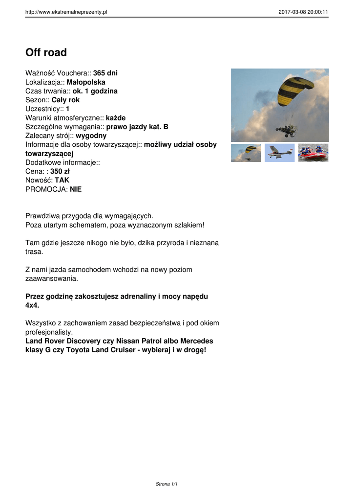 http://www.ekstremalneprezenty.pl 2017-03-08 20:00:11 Off road Ważność Vouchera:: 365 dni Lokalizacja:: Małopolska Czas trwania:: ok. 1 godzina Sezon:: Cały rok Uczestnicy:: 1 Warunki atmosferyczne:: każde Szczególne wymagania:: prawo jazdy kat. B Zalecany strój:: wygodny Informacje dla osoby towarzyszącej:: możliwy udział osoby towarzyszącej Dodatkowe informacje:: Cena: : 350 zł Nowość: TAK PROMOCJA: NIE Prawdziwa przygoda dla wymagających. Poza utartym schematem, poza wyznaczonym szlakiem! Tam gdzie jeszcze nikogo nie było, dzika przyroda i nieznana trasa. Z nami jazda samochodem wchodzi na nowy poziom zaawansowania. Przez godzinę zakosztujesz adrenaliny i mocy napędu 4x4. Wszystko z zachowaniem zasad bezpieczeństwa i pod okiem profesjonalisty. Land Rover Discovery czy Nissan Patrol albo Mercedes klasy G czy Toyota Land Cruiser - wybieraj i w drogę! Strona 1/1