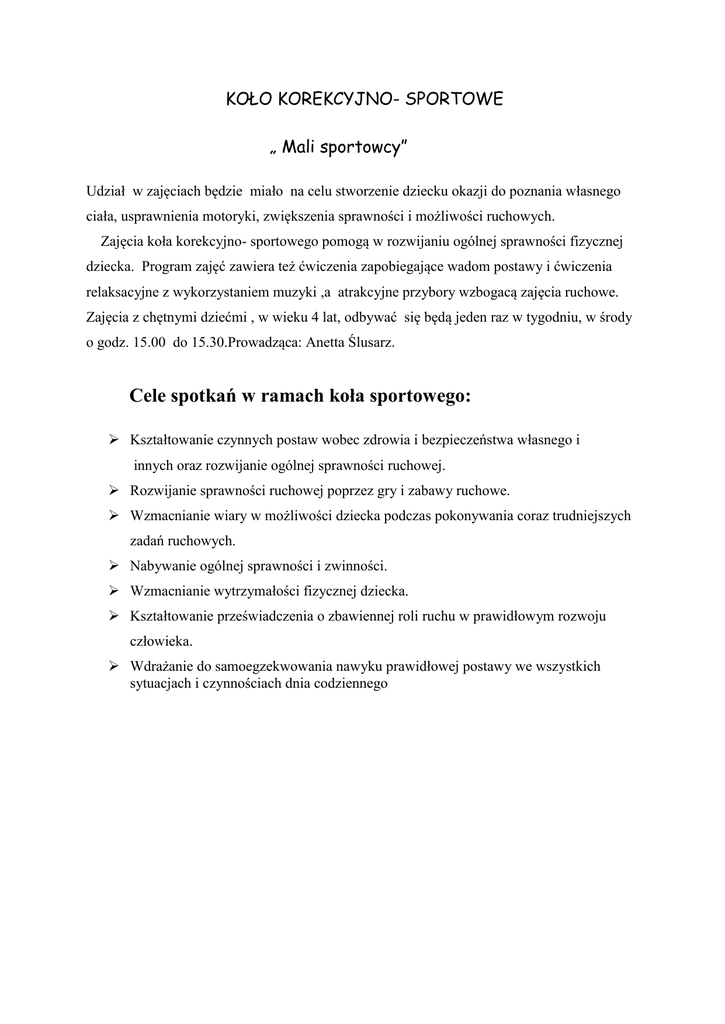 KOŁO KOREKCYJNO- SPORTOWE „ Mali sportowcy” Udział w zajęciach będzie miało na celu stworzenie dziecku okazji do poznania własnego ciała, usprawnienia motoryki, zwiększenia sprawności i możliwości ruchowych. Zajęcia koła korekcyjno- sportowego pomogą w rozwijaniu ogólnej sprawności fizycznej dziecka. Program zajęć zawiera też ćwiczenia zapobiegające wadom postawy i ćwiczenia relaksacyjne z wykorzystaniem muzyki ,a atrakcyjne przybory wzbogacą zajęcia ruchowe. Zajęcia z chętnymi dziećmi , w wieku 4 lat, odbywać się będą jeden raz w tygodniu, w środy o godz. 15.00 do 15.30.Prowadząca: Anetta Ślusarz. Cele spotkań w ramach koła sportowego: Kształtowanie czynnych postaw wobec zdrowia i bezpieczeństwa własnego i innych oraz rozwijanie ogólnej sprawności ruchowej. Rozwijanie sprawności ruchowej poprzez gry i zabawy ruchowe. Wzmacnianie wiary w możliwości dziecka podczas pokonywania coraz trudniejszych zadań ruchowych. Nabywanie ogólnej sprawności i zwinności. Wzmacnianie wytrzymałości fizycznej dziecka. Kształtowanie przeświadczenia o zbawiennej roli ruchu w prawidłowym rozwoju człowieka. Wdrażanie do samoegzekwowania nawyku prawidłowej postawy we wszystkich sytuacjach i czynnościach dnia codziennego