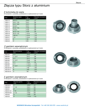 Złącza Złącza typu Storz z aluminium Z końcówką do węża W komplecie z uszczelką, sprzedawane w opakowaniach po 5 sztuk. Kod Średnica węża (mm) Typ złącza Rozstaw zaczepów (mm) 1920.10 25 (1”) 25-D 31 1920.11 38 (1” 1/2) 52-C 66 1920.12 45 (1” 3/4) 52-C 66 1920.15 52 (2”) 52-C 66 1920.16 65 (2” 1/2) 75-B 89 1920.17 75 (3”) 75-B 89 1920.18 80 (3” 1/4) 75-B 89 1920.19 90 (3” 1/2) 110-A 133 1920.20 100 (4”) 110-A 133 1920.21 110 110-A 133 1920.22 6” 150 160 1920.24 8” 205 220 Z gwintem wewnętrznym W komplecie z uszczelką, sprzedawane w opakowaniach po 5 sztuk. Kod Rozmiar gwintu (cal) Typ złącza Rozstaw zaczepów (mm) 1920.53 1” F 25-D 31 1920.54 1” 1/2 F 52-C 66 1920.55 2” F 52-C 66 1920.56 2” 1/2 F 75-B 89 1920.57 3” F 75-B 89 1920.58 4” F 110-A 133 1920.59 4” 1/2 F 110-A 133 1920.59-10 6” 150 160 1920.59-11 8” 205 220 1920.62-01 3” 90 105 Z gwintem zewnętrznym W komplecie z uszczelką, sprzedawane w opakowaniach po 5 sztuk. Kod Rozmiar gwintu (cal) Typ złącza Rozstaw zaczepów (mm) 1920.60-1 1” 25-D 31 1920.60 1” 1/2 52-C 66 1920.61 2” 52-C 66 1920.61-01 1” M 52-C 66 1920.62-02 2” 1/2 75-B 89 1920.62 3” 75-B 89 1920.63 4” 110-A 133 WODNICK Mirosław Szczepański ∙ Tel +48 530 260 870 ∙ www.wodnick.pl Złącza Złącza typu Storz z aluminium Złącza redukcyjne W komplecie z uszczelką, sprzedawane w opakowaniach po 5 sztuk. Kod Rozmiar (mm) Typ złącza Rozstaw zaczepów (mm) 1920.81 52/25 (2” - 1”) 52-C/25-D 66/31 1920.82 75/52 (3”-2” 75-B/52-C 89/66 1920.83 110-75 (4” 1/2 - 3”) 110-A/75-B 133/89 Zaślepki Z łańcuchem i uszczelką, sprzedawane w opakowaniach po 5 sztuk. Kod Rozmiar Typ złącza Rozstaw zaczepów (mm) 1920.90 1920.901 1” 1” 1/4 25-D 32 31 1920.91 2” 52-C 66 1920.92 3” 75-B 89 1920.93 4” 110-A 133 1920.94 6” 150 1920.96 8” 205 Uszczelki Silikon do temp. 150°C, Hypalon i Viton na życzenie. Kod Opis Materiał Rozmiar 1920.03-01 Uszczelka wargowa NBR biały 52-C 1920.03-03 Uszczelka złączna do węży ssawnych NBR biały Uszczelka płaska do złączy z gwintem NBR biały 1920.03-04 1920.03-02 110-A 205 52-C Klucze Kod Rozmiar Typ złącza 1920.01 150 150 F 1920.01-01 205 205 F Obejmy 3 częściowe do aluminiowych złącz STORZ Kod Rozmiar Typ złącza 1920.99-04 150 (6”) 150 1920.99-05 200 (8”) 205 WODNICK Mirosław Szczepański ∙ Tel +48 530 260 870 ∙ www.wodnick.pl