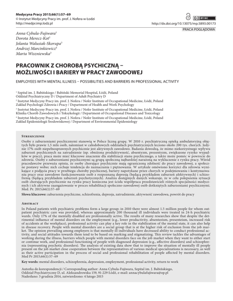 Medycyna Pracy 2015;66(1):57–69 © Instytut Medycyny Pracy im. prof. J. Nofera w Łodzi http://medpr.imp.lodz.pl http://dx.doi.org/10.13075/mp.5893.00173 Anna Cybula-Fujiwara1 Dorota Merecz-Kot2 Jolanta Walusiak-Skorupa3 Andrzej Marcinkiewicz4 Marta Wiszniewska3 PRACA POGLĄDOWA PRACOWNIK Z CHOROBĄ PSYCHICZNĄ – MOŻLIWOŚCI I BARIERY W PRACY ZAWODOWEJ EMPLOYEES WITH MENTAL ILLNESS – POSSIBILITIES AND BARRIERS IN PROFESSIONAL ACTIVITY Szpital im. J. Babińskiego / Babiński Memorial Hospital, Łódź, Poland Oddział Psychiatryczny D / Department of Adult Psychiatry D 2 Instytut Medycyny Pracy im. prof. J. Nofera / Nofer Institute of Occupational Medicine, Łódź, Poland Zakład Psychologii Zdrowia i Pracy / Department of Health and Work Psychology 3 Instytut Medycyny Pracy im. prof. J. Nofera / Nofer Institute of Occupational Medicine, Łódź, Poland Klinika Chorób Zawodowych i Toksykologii / Department of Occupational Diseases and Toxicology 4 Instytut Medycyny Pracy im. prof. J. Nofera / Nofer Institute of Occupational Medicine, Łódź, Poland Zakład Epidemiologii Środowiskowej / Department of Environmental Epidemiology 1 Streszczenie Osoby z zaburzeniami psychicznymi stanowią w Polsce liczną grupę. W 2010 r. psychiatryczną opieką ambulatoryjną objętych było prawie 1,5 mln osób, natomiast w całodobowych oddziałach psychiatrycznych leczono około 200 tys. chorych. Jedynie 17% osób niepełnosprawnych psychicznie jest aktywnych zawodowo. Badania dowodzą, że mimo niekorzystnego wpływu zaburzeń psychicznych na zatrudnienie (np. obniżona produktywność, absentyzm, prezentyzm, zwiększone ryzyko wypadków w pracy), praca może mieć kluczowe znaczenie dla stabilizacji stanu psychicznego, a także może pomóc w powrocie do zdrowia. Osoby z zaburzeniami psychicznymi są grupą społeczną najbardziej narażoną na wykluczenie z rynku pracy. Wśród pracodawców przeważa opinia, że osoby chorujące psychicznie mają ograniczoną zdolność do pracy zawodowej, a społeczne postawy wobec nich cechuje tendencja do naznaczania i piętnowania. W artykule omówiono korzyści dla zdrowia wynikające z podjęcia pracy w przebiegu choroby psychicznej, bariery napotykane przez chorych w podejmowaniu i kontynuowaniu pracy oraz zawodowe funkcjonowanie osób z rozpoznaną depresją (będącą przykładem zaburzeń afektywnych) i schizofrenią (będącą przykładem zaburzeń psychotycznych). Analiza dostępnych danych wskazuje, że w celu polepszenia sytuacji osób chorujących psychicznie na rynku pracy konieczna jest ścisła współpraca przedstawicieli różnych specjalności medycznych i ich aktywne zaangażowanie w proces rehabilitacji społeczno-zawodowej osób dotkniętych zaburzeniami psychicznymi. Med. Pr. 2015;66(1):57–69 Słowa kluczowe: zaburzenia psychiczne, schizofrenia, depresja, zatrudnienie, aktywność zawodowa, powrót do pracy Abstract In Poland patients with psychiatric problems form a large group; in 2010 there were almost 1.5 million people for whom outpatient psychiatric care was provided, whereas approximately 200 thousand ill individuals were treated in 24-h psychiatric wards. Only 17% of the mentally disabled are professionally active. The results of many researches show that despite the detrimental influence of mental disorders on the employment (e.g., lower productivity, absenteeism, presenteism, increased risk of accidents at the workplace), professional activity can play a key role in the stabilization of the mental state, it can also help in disease recovery. People with mental disorders are a social group that is at the higher risk of exclusion from the job market. The opinion prevailing among employers is that mentally ill individuals have decreased ability to conduct professional activity, and social attitudes towards them tend to be based on marking and stigmatizing. This review tackles the advantages of working during the illness, barriers which people with mental disorders face on the job market when they want to either start or continue work, and professional functioning of people with diagnosed depression (e.g., affective disorders) and schizophrenia (representing psychotic disorders). The analysis of existing data show that to improve the situation of mentally ill people present on the job market close cooperation between the representatives of various medical specializations is necessary, as well as their active participation in the process of social and professional rehabilitation of people affected by mental disorders. Med Pr 2015;66(1):57–69 Key words: mental disorders, schizophrenia, depression, employment, professional activity, return to work Autorka do korespondencji / Corresponding author: Anna Cybula-Fujiwara, Szpital im. J. Babińskiego, Oddział Psychiatryczny D, ul. Aleksandrowska 159, 91-229 Łódź, e-mail: [email protected] Nadesłano: 3 grudnia 2014, zatwierdzono: 4 lutego 2015 58 A. Cybula-Fujiwara i wsp. WSTĘP Według Światowej Organizacji Zdrowia (World Health Organization – WHO) choroby psychiczne do 2020 r. staną się jednym z poważniejszych problemów zdrowotnych występujących w populacji europejskiej [1]. Wyniki badań przeprowadzonych w Europie (UE 27, Szwajcaria, Islandia i Norwegia), opublikowane w 2011 r. w formie raportu, wskazują, że każdego roku 164,8 mln (38,2%) mieszkańców Europy cierpi z powodu zaburzeń zdrowia psychicznego [2]. Według ww. raportu do najczęstszych zaburzeń psychicznych należą, zgodnie z klasyfikacją DSM-IV (Diagnostic and statistical manual of mental disorder. Fourth edition – Klasyfikacja zaburzeń psychicznych Amerykańskiego Towarzystwa Psychiatrycznego. Wydanie 4) [3]: n zaburzenia lękowe – ogółem 12%; n zaburzenia afektywne – 7,8%, w tym zaburzenia depresyjne – 6,9%, zaburzenia dwubiegunowe – 0,9%; n zaburzenia spowodowane substancjami psychoaktywnymi – 3,8–5,6%; n schizofrenia i inne zaburzenia psychotyczne – 1,2%; n zaburzenia odżyw