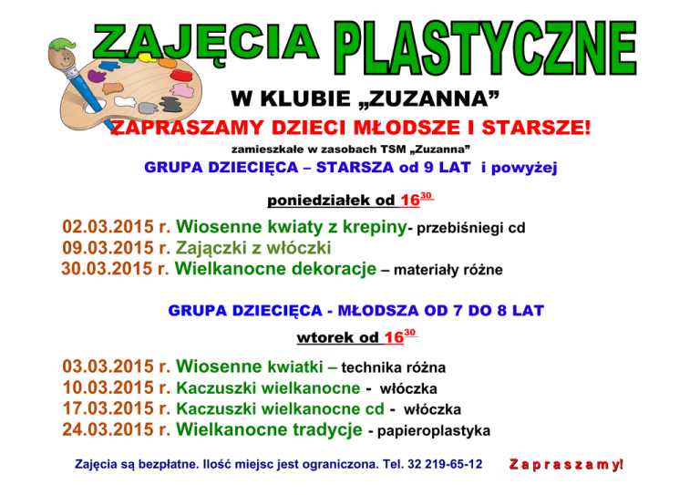 W KLUBIE „ZUZANNA” ZAPRASZAMY DZIECI MŁODSZE I STARSZE! zamieszkałe w zasobach TSM „Zuzanna” GRUPA DZIECIĘCA – STARSZA od 9 LAT i powyżej poniedziałek od 1630 02.03.2015 r. Wiosenne kwiaty z krepiny- przebiśniegi cd 09.03.2015 r. Zajączki z włóczki 30.03.2015 r. Wielkanocne dekoracje – materiały różne GRUPA DZIECIĘCA - MŁODSZA OD 7 DO 8 LAT wtorek od 1630 03.03.2015 r. Wiosenne kwiatki – technika różna 10.03.2015 r. Kaczuszki wielkanocne - włóczka 17.03.2015 r. Kaczuszki wielkanocne cd - włóczka 24.03.2015 r. Wielkanocne tradycje - papieroplastyka Zajęcia są bezpłatne. Ilość miejsc jest ograniczona. Tel. 32 219-65-12 Z a p r a s z a m y!
