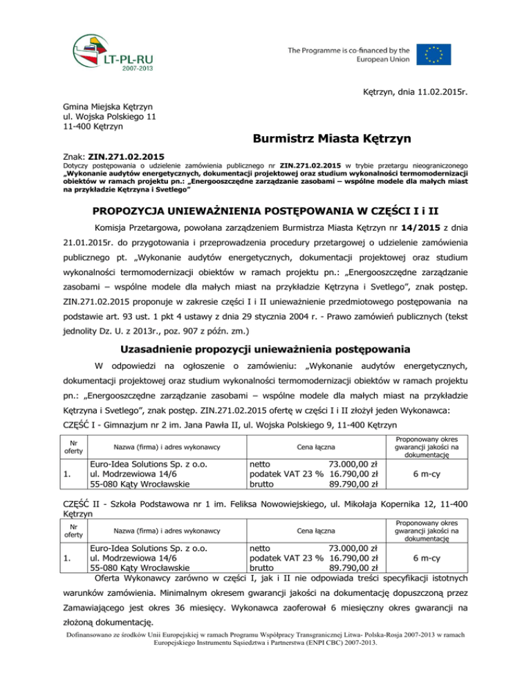 Kętrzyn, dnia 11.02.2015r. Gmina Miejska Kętrzyn ul. Wojska Polskiego 11 11-400 Kętrzyn Burmistrz Miasta Kętrzyn Znak: ZIN.271.02.2015 Dotyczy postępowania o udzielenie zamówienia publicznego nr ZIN.271.02.2015 w trybie przetargu nieograniczonego „Wykonanie audytów energetycznych, dokumentacji projektowej oraz studium wykonalności termomodernizacji obiektów w ramach projektu pn.: „Energooszczędne zarządzanie zasobami – wspólne modele dla małych miast na przykładzie Kętrzyna i Svetlego” PROPOZYCJA UNIEWAśNIENIA POSTĘPOWANIA W CZĘŚCI I i II Komisja Przetargowa, powołana zarządzeniem Burmistrza Miasta Kętrzyn nr 14/2015 z dnia 21.01.2015r. do przygotowania i przeprowadzenia procedury przetargowej o udzielenie zamówienia publicznego pt. „Wykonanie audytów energetycznych, dokumentacji projektowej oraz studium wykonalności termomodernizacji obiektów w ramach projektu pn.: „Energooszczędne zarządzanie zasobami – wspólne modele dla małych miast na przykładzie Kętrzyna i Svetlego”, znak postęp. ZIN.271.02.2015 proponuje w zakresie części I i II uniewaŜnienie przedmiotowego postępowania na podstawie art. 93 ust. 1 pkt 4 ustawy z dnia 29 stycznia 2004 r. - Prawo zamówień publicznych (tekst jednolity Dz. U. z 2013r., poz. 907 z późn. zm.) Uzasadnienie propozycji uniewaŜnienia postępowania W odpowiedzi na ogłoszenie o zamówieniu: „Wykonanie audytów energetycznych, dokumentacji projektowej oraz studium wykonalności termomodernizacji obiektów w ramach projektu pn.: „Energooszczędne zarządzanie zasobami – wspólne modele dla małych miast na przykładzie Kętrzyna i Svetlego”, znak postęp. ZIN.271.02.2015 ofertę w części I i II złoŜył jeden Wykonawca: CZĘŚĆ I - Gimnazjum nr 2 im. Jana Pawła II, ul. Wojska Polskiego 9, 11-400 Kętrzyn Nr oferty 1. Nazwa (firma) i adres wykonawcy Euro-Idea Solutions Sp. z o.o. ul. Modrzewiowa 14/6 55-080 Kąty Wrocławskie Cena łączna netto 73.000,00 zł podatek VAT 23 % 16.790,00 zł brutto 89.790,00 zł Proponowany okres gwarancji jakości na dokumentację 6 m-cy CZĘŚĆ II - Szkoła Podstawowa nr 1 im. Feliksa Nowowiejskiego, ul. Mikołaja Kopernika 12, 11-400 Kętrzyn Nr oferty 1. Nazwa (firma) i adres wykonawcy Euro-Idea Solutions Sp. z o.o. ul. Modrzewiowa 14/6 55-080 Kąty Wrocławskie Oferta Wykonawcy zarówno w części Cena łączna Proponowany okres gwarancji jakości na dokumentację netto 73.000,00 zł 6 m-cy podatek VAT 23 % 16.790,00 zł brutto 89.790,00 zł I, jak i II nie odpowiada treści specyfikacji istotnych warunków zamówienia. Minimalnym okresem gwarancji jakości na dokumentację dopuszczoną przez Zamawiającego jest okres 36 miesięcy. Wykonawca zaoferował 6 miesięczny okres gwarancji na złoŜoną dokumentację. Dofinansowano ze środków Unii Europejskiej w ramach Programu Współpracy Transgranicznej Litwa- Polska-Rosja 2007-2013 w ramach Europejskiego Instrumentu Sąsiedztwa i Partnerstwa (ENPI CBC) 2007-2013. Ponadto Zamawiający zwraca uwagę, Ŝe Wykonawca nie złoŜył podpisu pod całością oświadczenia woli. Podpis Wykonawcy złoŜony został pod pozycją nr 7 formularza oferty, winien być złoŜony pod pozycją nr 8 formularza oferty oraz pod formułą o przyjęciu do wiadomości odpowiedzialności karnej za prawdziwość złoŜonych oświadczeń. Wykonawca nie złoŜył oświadczenia w zakresie korzystania z podwykonawstwa. Warunkiem udziału w postępowaniu było wykonanie w okresie ostatnich 3 lat przed upływem terminu składania ofert (a jeŜeli okres prowadzenia działalności jest krótszy - w tym okresie co najmniej: jeden projekt budowlano - wykonawczy o wartości nie mniejszej niŜ 40.000 złotych CZĘŚĆ I brutto na budowę, rozbudowę, przebudowę lub remont wpisanego do Rejestru Konserwatora Zabytków budynku uŜyteczności publicznej lub budynku mieszkalnego jeden projekt budowlano - wykonawczy o wartości nie mniejszej niŜ 40.000 złotych CZĘŚĆ II brutto na budowę, rozbudowę, przebudowę lub remont wpisanego do Rejestru Konserwatora Zabytków budynku uŜyteczności publicznej lub budynku mieszkalnego Wykonawca złoŜył wraz z ofertą wykaz wykonanych usług obejmujący: 1) A) montaŜ 16 zewnętrznych lamp solarnych led na terenie zabytkowego zespołu pałacowo- projekt budowlany z pozwoleniem na budowę Utwardzenie terenu (kostka granitowa) 1035 m2 Ośrodek Leczenia Odwykowego w Woskowicach Małych- projekt budowlany z pozwoleniem na budowę Wykonanie dokumentacji kosztorysowe remontu pomieszczeń piwnicznych oraz opaski i wykonanie izolacji pionowej wokół budynku pałacowego OLO Woskowice Małe o wartości 40.000,00 zł na rzecz Woskowice Małe, 46-100 Namysłów- zapis toŜsamy dla części I i II , B) Remont konstrukcji dachu wraz z wymianą pokrycia dachu oraz odnowienie elewacji budynku magazynowego Browar Namysłów. Projekt i nadzór oraz Wykonanie hali namiotowej połączonej z istniejącą śluzą załadunkową istniejącego magazynu na terenie browaru namysłów sp. z o.o. , namysłów ul. bolesława chrobrego 26, działka nr 886/1 (browar jest obiektem zabytkowym jako całość, częściowo zlokalizowany w obiektach Zamku w Namysłowie, zamek w całości naleŜy do browaru pełni równieŜ częściowo funkcje mieszkalne) Projekt i nadzór o wartości 40.000,00 zł na rzecz Browar Namysłów Sp. z o.o., 46-100 Namysłów , ul. Bolesława Chrobrego 26- w części I; 2) Wykonanie audytów energetycznych 6 obiektów oświatowych (szkół) w celu przygotowania projektu do RPO WD 2014-2020o wartości 19.680,00 zł na rzecz Gminny Zespół Oświaty, ul. Nowodojazdowa 9, 55-200 Oława - zapis toŜsamy dla części I i II , 3) Przygotowanie studium wykonalności inwestycji polegającej na remoncie 10 km dróg w gminie Aleksandrów Kujawski, projekt po pozytywnej ocenie formalnej o wartości 15.500,00 zł na rzecz Gmina Aleksandrów Kujawski - zapis toŜsamy dla części I i II , Dofinansowano ze środków Unii Europ