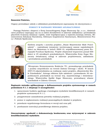 Szanowni Państwo, Organy prowadzące szkoły z oddziałami przedszkolnymi zapraszamy do skorzystania z: POMOCY W NAPISANIU WNIOSKU APLIKACYJNEGO Pomogą Państwu eksperci z firmy konsultingowej Zegar Słoneczny Sp. z o.o., doświadczeni praktycy zajmujący się na co dzień doradztwem w zakresie zakładania i prowadzenia placówek wczesnej edukacji i opieki, stale współpracujący z sejmową komisją oświaty, Ministerstwem Edukacji Narodowej, Głównym Inspektorem Sanitarnym, Ministerstwem Pracy i Polityki Społecznej. Szefowa zespołu i autorka projektu „Nasze Mazowieckie Małe Przedszkola” – największej inicjatywy wyrównującej szanse najmłodszych dzieci na Mazowszu w latach 2009-10, współfinansowanej przez Europejski Fundusz Społeczny. Projekt obejmował wsparciem ponad 600 dzieci w 25 ośrodkach przedszkolnych. Właścicielka firmy Zegar Słoneczny świadczącej usługi w zakresie projektowania, zakładania i prowadzenia przedszkoli. Wiceprezes Stowarzyszenia Rodziców TU, prowadzącego przedszkole i punkty niepubliczne na terenie Zalesia Górnego i okolic. W latach 2007/8 odpowiedzialna za realizację części projektu „Mazowieckie Małe Przedszkola”, którego efektem było założenie i prowadzenie 30 niepublicznych przedszkoli na terenie woj. mazowieckiego i świętokrzyskiego. Właścicielka Spółki Zegar Słoneczny, prowadzącej własne przedszkole w Zalesiu Górnym. Napisanie wniosku aplikacyjnego o dofinansowanie projektu systemowego w ramach podziałania 9.1.1 obejmuje w szczególności: 1. opracowanie budżetu zgodnego z katalogiem wydatków kwalifikowanych w ramach projektów systemowych 9.1.1; 2. przygotowanie uzasadnienia potrzeby realizacji projektu; 3. pomoc w zaplanowaniu realizacji poszczególnych działań w projekcie; 4. przesłanie wypełnionego formularza w wersji xml oraz pdf; 5. przekazanie instrukcji prawidłowego złożenia projektu. Gwarantujemy zgodność z dokumentacją konkursową oraz wytycznymi w zakresie kwalifikowalności wydatków. Stowarzyszenie Rodziców „TU” ul. Rusałek 21, 05-540 Zalesie Górne, www.tu.edu.pl Zegar Słoneczny Sp. z o.o. ul. Poranku 5, 05-540 Zalesie Górne NIP 123 09 21 520, REGON 016447645, KRS 0000155407 NIP 123 11 78 997, REGON 141801200, KRS 0000325855 [email protected] www.przedszkolezlobek.pl; tel 22 756 59 16 Dodatkowo oferujemy: pomoc w przygotowaniu opisu przedmiotu zamówienia w ewentualnych przetargach sporządzenia wniosku o płatność rozliczającego projekt Katarzyna Czublun [email protected] tel. 665 375 595 Stowarzyszenie Rodziców „TU” ul. Rusałek 21, 05-540 Zalesie Górne, www.tu.edu.pl Zegar Słoneczny Sp. z o.o. ul. Poranku 5, 05-540 Zalesie Górne NIP 123 09 21 520, REGON 016447645, KRS 0000155407 NIP 123 11 78 997, REGON 141801200, KRS 0000325855 [email protected] www.przedszkolezlobek.pl; tel 22 756 59 16