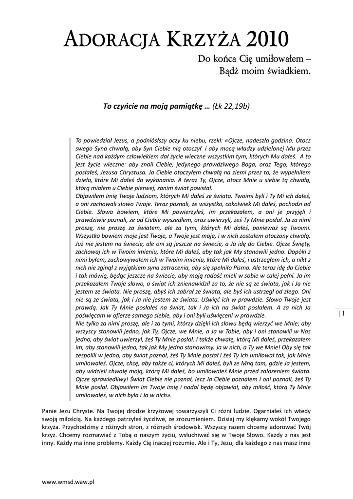 ADORACJA KRZYŻA 2010 Do końca Cię umiłowałem – Bądź moim świadkiem. To czyocie na moją pamiątkę … (Łk 22,19b) To powiedział Jezus, a podniósłszy oczy ku niebu, rzekł: «Ojcze, nadeszła godzina. Otocz swego Syna chwałą, aby Syn Ciebie nią otoczył i aby mocą władzy udzielonej Mu przez Ciebie nad każdym człowiekiem dał życie wieczne wszystkim tym, których Mu dałeś. A to jest życie wieczne: aby znali Ciebie, jedynego prawdziwego Boga, oraz Tego, którego posłałeś, Jezusa Chrystusa. Ja Ciebie otoczyłem chwałą na ziemi przez to, że wypełniłem dzieło, które Mi dałeś do wykonania. A teraz Ty, Ojcze, otocz Mnie u siebie tą chwałą, którą miałem u Ciebie pierwej, zanim świat powstał. Objawiłem imię Twoje ludziom, których Mi dałeś ze świata. Twoimi byli i Ty Mi ich dałeś, a oni zachowali słowo Twoje. Teraz poznali, że wszystko, cokolwiek Mi dałeś, pochodzi od Ciebie. Słowa bowiem, które Mi powierzyłeś, im przekazałem, a oni je przyjęli i prawdziwie poznali, że od Ciebie wyszedłem, oraz uwierzyli, żeś Ty Mnie posłał. Ja za nimi proszę, nie proszę za światem, ale za tymi, których Mi dałeś, ponieważ są Twoimi. Wszystko bowiem moje jest Twoje, a Twoje jest moje, i w nich zostałem otoczony chwałą. Już nie jestem na świecie, ale oni są jeszcze na świecie, a Ja idę do Ciebie. Ojcze Święty, zachowaj ich w Twoim imieniu, które Mi dałeś, aby tak jak My stanowili jedno. Dopóki z nimi byłem, zachowywałem ich w Twoim imieniu, które Mi dałeś, i ustrzegłem ich, a nikt z nich nie zginął z wyjątkiem syna zatracenia, aby się spełniło Pismo. Ale teraz idę do Ciebie i tak mówię, będąc jeszcze na świecie, aby moją radośd mieli w sobie w całej pełni. Ja im przekazałem Twoje słowo, a świat ich znienawidził za to, że nie są ze świata, jak i Ja nie jestem ze świata. Nie proszę, abyś ich zabrał ze świata, ale byś ich ustrzegł od złego. Oni nie są ze świata, jak i Ja nie jestem ze świata. Uświęd ich w prawdzie. Słowo Twoje jest prawdą. Jak Ty Mnie posłałeś na świat, tak i Ja ich na świat posłałem. A za nich Ja poświęcam w ofierze samego siebie, aby i oni byli uświęceni w prawdzie. Nie tylko za nimi proszę, ale i za tymi, którzy dzięki ich słowu będą wierzyd we Mnie; aby wszyscy stanowili jedno, jak Ty, Ojcze, we Mnie, a Ja w Tobie, aby i oni stanowili w Nas jedno, aby świat uwierzył, żeś Ty Mnie posłał. I także chwałę, którą Mi dałeś, przekazałem im, aby stanowili jedno, tak jak My jedno stanowimy. Ja w nich, a Ty we Mnie! Oby się tak zespolili w jedno, aby świat poznał, żeś Ty Mnie posłał i żeś Ty ich umiłował tak, jak Mnie umiłowałeś. Ojcze, chcę, aby także ci, których Mi dałeś, byli ze Mną tam, gdzie Ja jestem, aby widzieli chwałę moją, którą Mi dałeś, bo umiłowałeś Mnie przed założeniem świata. Ojcze sprawiedliwy! Świat Ciebie nie poznał, lecz Ja Ciebie poznałem i oni poznali, żeś Ty Mnie posłał. Objawiłem im Twoje imię i nadal będę objawiał, aby miłośd, którą Ty Mnie umiłowałeś, w nich była i Ja w nich». Panie Jezu Chryste. Na Twojej drodze krzyżowej towarzyszyli Ci różni ludzie. Ogarniałeś ich wtedy swoją miłością. Na każdego patrzyłeś życzliwe, ze zrozumieniem. Dzisiaj my klękamy wokół Twojego krzyża. Przychodzimy z różnych stron, z różnych środowisk. Wszyscy razem chcemy adorowad Twój krzyż. Chcemy rozmawiad z Tobą o naszym życiu, wsłuchiwad się w Twoje Słowo. Każdy z nas jest inny. Każdy ma inne problemy. Każdy Cię inaczej rozumie. Ale i Ty, Jezu, dla każdego z nas masz inne www.wmsd.waw.pl |1 słowo. Chcemy je usłyszed w głębi naszych serc. Chcemy wejśd w ten dialog. Odnaleźd w nim siebie. Usłyszed to, co Ty, Jezu, chcesz do nas powiedzied. Potem wyszedł i zobaczył celnika, imieniem Lewi, siedzącego na komorze celnej. Rzekł do niego: «Pójdź za mną!» On zostawił wszystko, wstał i z Nim poszedł. Panie! Patrzę na krzyż – znak w którym objawiłeś swoją miłośd. Teraz, gdy jestem w seminarium na początku drogi do kapłaostwa, przychodzę pod Twój krzyż. Po raz kolejny pragnę usłyszed Twoje wołanie „Pójdź za mną”. W tym czasie wybrał Pan pokolenie Lewiego do noszenia Arki Przymierza Paoskiego, by stali przy Panu, służyli Mu i błogosławili w Jego imieniu. Jak Ty Mnie Ojcze posłałeś na świat, tak i Ja ich na świat posłałem. A za nich Ja poświęcam w ofierze samego siebie, aby i oni byli uświęceni w prawdzie. Oddajesz za mnie Jezu swoje życie i modlisz się, abym zawsze był przy Tobie. Wybierasz mnie, abym głosił Twoje Imię. Dzisiaj, patrząc na Ciebie, chcę po raz kolejny wypowiedzied swoją decyzję: Tak, chcę iśd za Tobą; chcę dawad o Tobie świadectwo; chcę zaprzed się siebie, walczyd z egoizmem, aby Ciebie, Panie, coraz bardziej miłowad i głosid Dobrą Nowinę o Tobie. Jezus Chrystus, istniejąc w postaci Bożej, nie skorzystał ze sposobności, aby na równi byd z Bogiem, lecz ogołocił samego siebie, przyjąwszy postad sługi, stając się podobnym do ludzi. A w zewnętrznej postaci uznany za człowieka, uniżył samego siebie, stając się posłusznym aż do śmierci – i to śmierci krzyżowej. Ojcze sprawiedliwy! Świat Ciebie nie poznał, lecz Ja Ciebie poznałem i oni poznali, żeś Ty Mnie posłał. Objawiłem im Twoje imię i nadal będę objawiał, aby miłośd, którą Ty Mnie umiłowałeś, w nich była i Ja w nich. Dziękuję Panie za Twój przykład, jak pełnid wolę Boga. Wskazujesz mi cel, ku któremu chcę zmierzad każdego dnia. Proszę Cię, naucz mnie brad krzyż na swoje ramiona i służyd ludziom. Nie tylko za nimi proszę, ale i za tymi, którzy dzięki ich słowu będą wierzyd we Mnie; aby wszyscy stanowili jedno, jak Ty, Ojcze, we Mnie, a Ja w Tobie, aby i oni stanowili w Nas jedno, aby świat uwierzył, żeś Ty Mnie posłał. Panie chcesz, abyśmy stanowili jedno