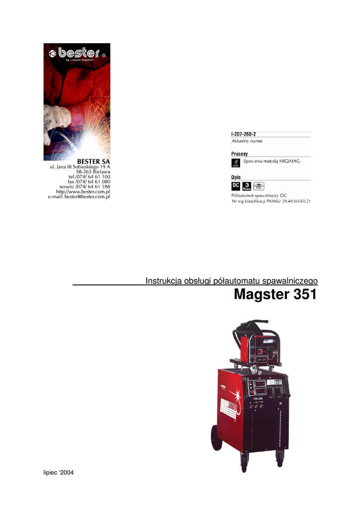 Instrukcja obsługi półautomatu spawalniczego Magster 351 lipiec ‘2004 Od BESTER Dzi kujemy Pa stwu i gratulujemy Wyboru półautomatu spawalniczego Magster 351. Teraz mo ecie Pa stwo spawa sprawnie i dobrze A my to Wam gwarantujemy. Declaration of confirmity Konformitätserklärung Deklaracja zgodno ci BESTER S.A. Declares that the welding machine: Erklärt, daß die Bauart der Maschine: Deklaruje, e spawalnicze ródło energii: Magster 351 s/n conforms to the following directives: den folgenden Bestimmungen entspricht: spełnia nast puj ce wytyczne: 73/23/CEE, 93/68/CEE, 89/366/CEE, 92/31/CEE and has been designed in conformance with the following norms: und in Übereinstimmung mit den nachstehenden Normen hergestellt wurde: i e zostało zaprojektowane zgodnie z wymaganiami nast puj cych norm: EN 50199, EN 60974-1 Tomasz Domagalski Operational Director BESTER S.A. ul. Jana III Sobieskiego 19A, 58-260 Bielawa, Poland 2 Spis tre ci 1 Bezpiecze stwo u ytkowania.............................................................................................4 2 Charakterystyka..................................................................................................................7 3 Uwagi ogólne i ostrze enia.................................................................................................7 4 Dane techniczne.................................................................................................................8 5 Elementy obsługi ródła pr du Magster 351......................................................................9 6 Elementy na ciance tylnej Magstera 351.........................................................................10 7 Elementy obsługi podajnika drutu PDE 41........................................................................11 8 Elementy na ciance tylnej podajnika drutu PDE 41.........................................................11 9 Elementy regulacyjne wewn trz podajnika PDE 41..........................................................12 10 Magster 351 budowa i kompletacja ...............................................................................12 11 Schemat ideowy ródła pr du Magster 351....................................................................15 12 Schemat ideowy podajnika drutu PDE 41.......................................................................16 13 Zestawienie stanowiska spawalniczego.........................................................................17 14 Instalacja półautomatu....................................................................................................18 14.1 Przył czenie do sieci zasilaj cej..................................................................................18 14.2 Podł czanie gazu osłonowego....................................................................................18 14.3 Ł czenie ródła pr du z podajnikiem drutu elektrodowego.........................................18 14.4 Podł czanie uchwytu spawalniczego...........................................................................18 14.5 Zakładanie drutu elektrodowego do podajnika.............................................................19 15 Spawania r czne metod MIG/MAG...............................................................................20 16 Zasady doboru parametrów spawania dla metody MIG/MAG.........................................20 17 Obsługa okresowa...........................................................................................................21 18 Zanim skorzystasz z serwisu...........................................................................................22 19 Uruchamianie półautomatu po dłu szym składowaniu....................................................23 20 Technologia spawania metod MIG/MAG.......................................................................23 21 Technologia spawania – podstawy..................................................................................24 21.1 Rodzaje spoin i typy zł czy...........................................................................................24 21.2 Zalecenia praktyczne....................................................................................................24 22 Wady spoin......................................................................................................................26 23 Wykaz cz ci zamiennych półautomatu Magster 351.....................................................27 24 Notatki..............................................................................................................................31 3 1 Bezpiecze stwo u ytkowania Ostrze enie! Chro siebie i osoby postronne przed powa nym niebezpiecze stwem lub mierci ! Nie dopuszczaj dzieci w pobli e miejsca pracy i do urz dzenia. Osoby z wszczepionym rozrusznikiem serca, zanim podejm prac z tym urz dzeniem, powinny skonsultowa si ze swoim lekarzem. Instalacja, obsługa serwisowa i naprawy tego urz dzenia mog by prowadzone tylko przez wykwalifikowany personel, z zachowaniem warunków bezpiecze stwa pracy obowi zuj cych dla urz dze elektrycznych. PORA ENIE ELEKTRYCZNE MO E ZABI Gdy urz dzenie jest wł czone do sieci wszystkie elementy tworz ce obwód pr du spawania s elektrycznie „gor ce” – nie dotyka ich goł r k ani przez wilgotn odzie . Obsługuj cy półautomat powinien by wyposa ony w odzie ochronn , która obejmuje: mask ochronn , r kawic , fartuch i buty. Odizolowa si elektrycznie od miejsca spawania i uziemienia za pomoc stosowanych rodków. Upewni si czy zastosowane rodki obejmuj wystarczaj co du y obszar dla zapewnienia bezpiecznej pracy . Je li proces spawania musi by prowadzony w warunkach szczególnego nara enia na niebezpiecze stwo pora enia elektrycznego /w zawilgoconych miejscach lub podczas opadów atmosferycznych; na metalowych konstrukcjach takich jak podłogi, kraty lub metalowe podesty; w niewygodnych pozycjach pracy takich jak na siedz co, na le 