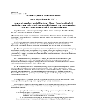 AIRLAW.PL Stan prawny 2011-12-28 ROZPORZĄDZENIE RADY MINISTRÓW z dnia 31 października 2007 r. w sprawie przekazywania Ministrowi Obrony Narodowej funkcji wynikających ze zwierzchnictwa w polskiej przestrzeni powietrznej na czas wojny, stanu wojennego lub stanu wyjątkowego Na podstawie art. 4 ust. 3 ustawy z dnia 3 lipca 2002 r. - Prawo lotnicze (Dz. U. z 2006 r. Nr 100, poz. 696, z późn. zm.) zarządza się, co następuje: § 1. Rozporządzenie określa warunki i sposób przekazywania Ministrowi Obrony Narodowej funkcji wynikających ze zwierzchnictwa w polskiej przestrzeni powietrznej na czas wojny, stanu wojennego lub stanu wyjątkowego. § 2. Z chwilą ogłoszenia stanu wyjątkowego na części lub całym terytorium państwa instytucja zapewniająca służby żeglugi powietrznej stosuje zasady przydzielania elementów przestrzeni powietrznej określone przez właściwe organy wojskowe dla tego rodzaju stanu nadzwyczajnego. § 3. Z chwilą ogłoszenia stanu wojennego i na czas wojny funkcje zarządzania ruchem lotniczym są wykonywane przez instytucję zapewniającą służby żeglugi powietrznej stanowiącą element wojskowego systemu kontroli przestrzeni powietrznej, podporządkowaną Dowódcy wykonującemu zadania Ministra Obrony Narodowej w zakresie ochrony granicy państwowej w przestrzeni powietrznej Rzeczypospolitej Polskiej. § 4. Dowódca wykonujący zadania Ministra Obrony Narodowej w zakresie ochrony granicy państwowej w przestrzeni powietrznej Rzeczypospolitej Polskiej może ograniczyć dostępność przestrzeni powietrznej dla lotnictwa cywilnego łącznie z całkowitym zakazem wykonywania lotów w czasie wojny, stanu wojennego lub stanu wyjątkowego. § 5. 1. Szczegółowe procedury przejmowania funkcji wynikających ze zwierzchnictwa w polskiej przestrzeni powietrznej na czas wojny, stanu wojennego lub stanu wyjątkowego określa, w planie kontroli przestrzeni powietrznej, Dowódca wykonujący zadania Ministra Obrony Narodowej w zakresie ochrony granicy państwowej w przestrzeni powietrznej Rzeczypospolitej Polskiej w uzgodnieniu z Prezesem Urzędu Lotnictwa Cywilnego i organem kierującym działalnością instytucji zapewniającej służby żeglugi powietrznej. 2. Minister Obrony Narodowej sprawuje kontrolę przestrzeni powietrznej w czasie wojny, stanu wojennego lub stanu wyjątkowego przez organy, których funkcje mu przekazano. § 6. Współpraca instytucji zapewniającej służby żeglugi powietrznej z wojskowymi służbami ruchu lotniczego i służbami systemu obrony powietrznej w czasie wojny, stanu wojennego lub stanu wyjątkowego polega na: 1) wspólnych działaniach w ramach jednolitego systemu zarządzania ruchem lotniczym przez wykorzystanie w szczególności: a) cywilno-wojskowego organu zarządzania przestrzenią powietrzną, b) organu kontroli operacyjnego ruchu lotniczego; 2) wymianie informacji o sytuacji w polskiej przestrzeni powietrznej między organami dowodzenia obroną powietrzną a instytucjami zapewniającymi służby ruchu lotniczego; 3) kontroli przestrzegania ograniczeń w polskiej przestrzeni powietrznej wynikających z wprowadzenia stanu wojennego lub stanu wyjątkowego oraz na czas wojny; 4) zapewnieniu koniecznej swobody działania w polskiej przestrzeni powietrznej dla statków powietrznych państwowych i wykonujących zadania lotnictwa państwowego; 5) udziale w zapewnieniu służb ruchu lotniczego w obszarach, w których wprowadzono struktury przestrzeni powietrznej inne niż stosowane w czasie pokoju; 6) szkoleniu personelu cywilnych i wojskowych służb ruchu lotniczego w zakresie trybu przejścia do kontroli przestrzeni powietrznej w czasie wojny, stanu wojennego lub stanu wyjątkowego. § 7. Rozporządzenie wchodzi w życie po upływie 14 dni od dnia ogłoszenia.