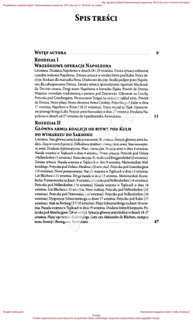 http://grzbiet.pl/sklep/historia-kampanii-jesiennej-1813-roku-tom-ii-od-kulm-do-lipska Przykładowy rozdział książki: Historia kampanii jesiennej 1813 roku tom II. Od Kulm do Lipska SPIS TREŚCI WsT~PAUTORA ....................................... . 9 RozDziALI WRZEŚNIOWE OPERACJE NAPOLEONA Literatura. Działania Napoleona w dniach 28 i 29 września. Ocena sytuacji militarnej z punktu widzenia Napoleona. Zmiana sytuacji w wyniku bitwy pod Kulm. Nowe decyzje. Rozkazy dla marszałka Neya. Ostateczne decyzje. Środki podjęte przez Napoleona dla zabezpieczenia Drezna. Zmiana sytuacji spowodowana raportem Macdonalda. Decyzje cesarza. Drugi marsz Napoleona w kierunku Śląska. Powrót do Drezna. Wrażenie wywołane wiadomością o porażce pod Dennewitz. Uderzenie na Czechy. Potyczka pod Geiesbergiem. Wyznaczenie Torgau na centralny zakład armii. Powrót do Drezna. Nowe plany. Nowa ofensywa Armii Czeskiej. Potyczka pod Kulm w dniu 17 v.neśnia. Napoleon w Pimie ( 18-21 września). Trzeci wypad na Śląsk. Opuszczenie prawego brzegu Łaby. Pozycje armii francuskiej w dniu 27 września. Działania Napoleona w dniach od 27 września do 4 października. Rozważania. . . . . . . . . . . . . . 11 RozDziAŁ II GŁÓWNA ARMIA KOALICJI OD BITWY POD KULM DO WYMARSZU DO SAKSONII Literatura. Stan głównej armii koalicji wieczorem 30 sierpnia. Pozycje głównej armii koalicji. Zajęcie nowych pozycji. Odbudowa struktury wewnętrznej armii. Stan wewnętrz ny armii. Działania dyplomatyczne. Plany operacyjne. Pozycja armii w dniu 4 września. Narada wojenna w Tepłicach w dniu 4 września. Nowa sytuacja. Potyczki pod Oelsen i Hellendorfem (S września). Nowe decyzje. Potyczka pod Berggiesshtibel (6 września). Zmiana sytuacji. Narada wojenna w Teplicach w dniu 9 września. Memorandum Wał końskiego. Potyczka pod Dohna i Heidenau (8 września). Potyczka pod Geiersbergiem ( 10 września). Nowe postanowienia. Narada wojenna w Teplicach w dniu 13 września. List Bitichera z 11 września. Druga narada w dniu 13 września. Memorandum Knesebecka. Postanowienia na dzień 14 września. Potyczka pod Nollendorfem ( 14 września). Potyczka pod Hellendorfem ( 14 września). Narada wojenna w Teplicach w dniu 14 września. List Bitichera z 13 września. Nowe rozkazy. Potyczka pod Hellendorfem ( l S września). Potyczka pod Peterswalde ( 16 września). Potyczka pod Nollendorfem ( 16 września). Dyspozycje Schwarzenberga na dzień 17 września. Potyczka pod Kulm ( 17 września). Atak na Freiberg ( 17 l 18 września). Plany Schwarzenberga na dzień 18 września. Narada wojenna w Teplicach w dniu 19 września. Działania lotnych korpusów. Potyczka pod Altenburgiem ( 28 września). Sytuacja głównej armii koalicji w dniach 18-2 7 września. Plany operacyjne Radetzky'ego. Listy cara Aleksandra do Bliichera, następcy tronu Szwecji i Bennigsena. Rozważania . . . . . . . . . . . . . . . . . . . . . . . . . . . . . . Książki historyczne 47 Internetowa księgarnia historii i faktu Grzbiet.pl Uwaga! Próbka wygenerowana automatycznie na podstawie tekstu źródłowego, oryginalne wydawnictwo może wyglądać inaczej. http://grzbiet.pl/sklep/historia-kampanii-jesiennej-1813-roku-tom-ii-od-kulm-do-lipska Przykładowy rozdział książki: Historia kampanii jesiennej 1813 roku tom II. Od Kulm do Lipska SPIS TREŚCI 6 ROZDZIAŁ III ARMIA PÓŁNOCNA OD POCZJ\TKU WRZEŚNIA DO PRZEKROCZENIA LABY W DNIU 4 PAŹDZIERNIKA Literatura. Sytuacja Armii Berlińskiej na początku września. Charakterystyka marszalka Neya. Zadania marszałka Neya. Armia Berlińska. Ocena sytuacji z punktu widzenia następcy tronu Szwecji. Wiadomości o nieprzyjacielu. Decyzje i zamiary następcy tronu. Ocena sytuacji z punktu widzenia Bułowa. Poglądy następcy tronu Szwecji. Ofensywa Armii Berlińskiej. Potyczka pod Zahną (S września). Rozważania. Ocena sytuacji przez Biilowa. Ocena sytuacji z punktu widzenia następcy tronu Szwecji. Środki podjęte przez Bulowa wieczorem S września. Działania Bulowa przed połu dniem 6 września. Działania następcy tronu przed południem 6 września. Działania Tauentziena przed południem 6 września. Rozkazy marszałka Neya na dzień 6 września. Bitwa pod Dennewitz (6 września). Pościg. Odwrót armii francuskiej. Potyczka pod Dahme (7 września). Przebieg pościgu w dniu 7 września. Rezultaty bitwy. Rozważania. Środki podjęte przez następcę tronu po bitwie pod Dennewitz. Propozycje Bi.ilowa. Powierzenie korpusowi Bulowa oblężenia Wittenbergi. Nowa sytuacja. Oblężenie Wittenbergi. Skarga następcy tronu na Biilowa. Budowa mostów koło Elster, Roslau i Aken. Akcja podpułkownika von der Marwitza w kierunku Brunszwiku. Akcja Czernyszewa na Kassel. Armia Berlińska po bitwie pod Dennewitz. Reorganizacja Armii Berlińskiej. Działania Armii Berlińskiej w drugiej połowie września. Potyczka pod Wartenburgiem (24 września). Memorandum Bulowa z dnia 2S września. Działania Neya od 2S września do 3 października. Potyczka pod Dessau (28 września). Atak na przyczółek pod Roslau. Rozważania . . 113 ROZDZIAŁ IV KAMPANIA NAD DOLNJ\. LABJ\. Literatura. Zadania armii nad dolną Łabą. Ugrupowanie Wallmodena. Charakterystyka Wallmodena. Ocena sytuacji przez Wallmodena. Pozycje korpusu przed zakończeniem zawieszenia broni. Francuski XIII. Korpus. Charakterystyka Davouta. Hamburg. Dyrektywy Napoleona dla Davouta. Rozpoczęcie działań wojennych. Potyczka pod Lauenburgiem ( 17 i 18 sierpnia). Potyczki pod Carnin i Goldenbow. Nowe rozkazy następcy tronu Szwecji z 2S i 27 sierpnia. Odpowiedź Wallmodena z dnia 29 sierpnia. Pozycja Davouta pod Ratzeburgiem. Ocena sytuacji z punktu widzenia Wallmodena. Potyczka koło Gtihrde. Rozważania. Operacje w drugiej połowie września. Rozważania. 207 ROZDZIAŁ V ARMIA ŚLJ\.SKA OD l WRZEŚNIA DO PRZEKROCZENIA LABY W DNIU 3 PAŹDZIERNIKA Literatura. Sytuacja Armii Śląska w dniu l września. List Bliichera do Schwarzenberga z 3 września. Rozważania. List Biliche