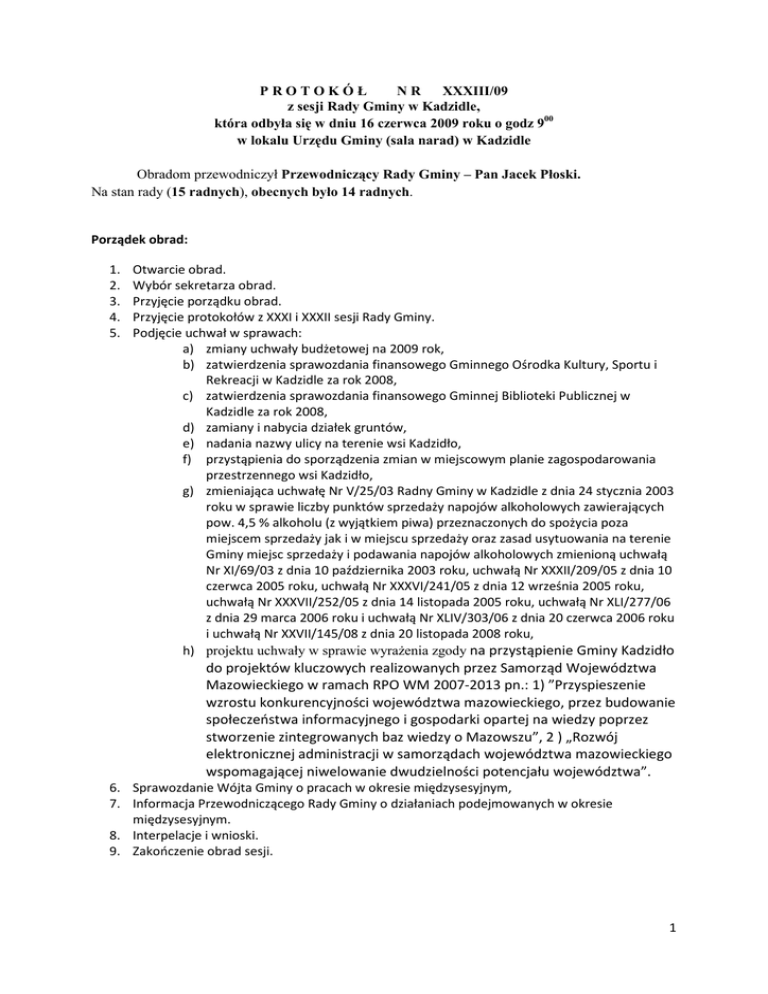 PROTOKÓŁ NR XXXIII/09 z sesji Rady Gminy w Kadzidle, która odbyła się w dniu 16 czerwca 2009 roku o godz 900 w lokalu Urzędu Gminy (sala narad) w Kadzidle Obradom przewodniczył Przewodniczący Rady Gminy – Pan Jacek Płoski. Na stan rady (15 radnych), obecnych było 14 radnych. Porządek obrad: 1. 2. 3. 4. 5. Otwarcie obrad. Wybór sekretarza obrad. Przyjęcie porządku obrad. Przyjęcie protokołów z XXXI i XXXII sesji Rady Gminy. Podjęcie uchwał w sprawach: a) zmiany uchwały budżetowej na 2009 rok, b) zatwierdzenia sprawozdania finansowego Gminnego Ośrodka Kultury, Sportu i Rekreacji w Kadzidle za rok 2008, c) zatwierdzenia sprawozdania finansowego Gminnej Biblioteki Publicznej w Kadzidle za rok 2008, d) zamiany i nabycia działek gruntów, e) nadania nazwy ulicy na terenie wsi Kadzidło, f) przystąpienia do sporządzenia zmian w miejscowym planie zagospodarowania przestrzennego wsi Kadzidło, g) zmieniająca uchwałę Nr V/25/03 Radny Gminy w Kadzidle z dnia 24 stycznia 2003 roku w sprawie liczby punktów sprzedaży napojów alkoholowych zawierających pow. 4,5 % alkoholu (z wyjątkiem piwa) przeznaczonych do spożycia poza miejscem sprzedaży jak i w miejscu sprzedaży oraz zasad usytuowania na terenie Gminy miejsc sprzedaży i podawania napojów alkoholowych zmienioną uchwałą Nr XI/69/03 z dnia 10 października 2003 roku, uchwałą Nr XXXII/209/05 z dnia 10 czerwca 2005 roku, uchwałą Nr XXXVI/241/05 z dnia 12 września 2005 roku, uchwałą Nr XXXVII/252/05 z dnia 14 listopada 2005 roku, uchwałą Nr XLI/277/06 z dnia 29 marca 2006 roku i uchwałą Nr XLIV/303/06 z dnia 20 czerwca 2006 roku i uchwałą Nr XXVII/145/08 z dnia 20 listopada 2008 roku, h) projektu uchwały w sprawie wyrażenia zgody na przystąpienie Gminy Kadzidło do projektów kluczowych realizowanych przez Samorząd Województwa Mazowieckiego w ramach RPO WM 2007-2013 pn.: 1) ”Przyspieszenie wzrostu konkurencyjności województwa mazowieckiego, przez budowanie społeczeństwa informacyjnego i gospodarki opartej na wiedzy poprzez stworzenie zintegrowanych baz wiedzy o Mazowszu”, 2 ) „Rozwój elektronicznej administracji w samorządach województwa mazowieckiego wspomagającej niwelowanie dwudzielności potencjału województwa”. 6. Sprawozdanie Wójta Gminy o pracach w okresie międzysesyjnym, 7. Informacja Przewodniczącego Rady Gminy o działaniach podejmowanych w okresie międzysesyjnym. 8. Interpelacje i wnioski. 9. Zakończenie obrad sesji. 1 Pkt 1. Przewodniczący dokonał otwarcia obrad XXXIII sesji Rady Gminy w Kadzidle. Powitał Wójta, pracowników Urzędu Gminy, radnych, sołtysów i gości zaproszonych. Stwierdził stan quorum, co pozwala na prawomocne obrady i podejmowanie uchwał w sprawach. Listy obecności radnych, sołtysów i gości zaproszonych stanowią załączniki nr 1, 2 i 3 do niniejszego protokołu. Pkt 2. Następnie przewodniczący zwrócił się do rady o zgłaszanie kandydatów na sekretarza dzisiejszych obrad. Na sekretarza obrad przewodniczący zaproponował radnego Henryka Wołosza, który wyraził zgodę. Innych kandydatur nie zgłoszono. Przewodniczący zarządził głosowanie w sprawie, kto jest za tym, żeby na sekretarza dzisiejszych obrad wybrać radnego Henryka Wołosza. Rada w obecności 14 radnych, 14 głosami – „za”, 0 głosów - „przeciw” i 0 głosów - „wstrzymujących się” wybrała sekretarza dzisiejszych obrad sesji. Przewodniczący stwierdził, że w wyniku głosowania rada jednogłośnie wybrała na sekretarza dzisiejszych obrad – radnego Henryka Wołosza. Pkt 3. Porządek obrad sesji radni otrzymali. Przewodniczący odczytał porządek obrad dzisiejszej sesji. Zwrócił się do radnych o zgłaszanie uwag do porządku obrad. Przewodniczący osobiście wnioskował o włączenie do porządku obrad jako podpunktu 5 h) projektu uchwały w sprawie wyrażenia zgody na przystąpienie Gminy Kadzidło do projektów kluczowych realizowanych przez Samorząd Województwa Mazowieckiego w ramach RPO WM 2007-2013 pn.: 1) ”Przyspieszenie wzrostu konkurencyjności województwa mazowieckiego, przez budowanie społeczeństwa informacyjnego i gospodarki opartej na wiedzy poprzez stworzenie zintegrowanych baz wiedzy o Mazowszu”, 2 ) „Rozwój elektronicznej administracji w samorządach województwa mazowieckiego wspomagającej niwelowanie dwudzielności potencjału województwa”. Sprzeciwu i innych uwag do porządku nie wniesiono. Przewodniczący zarządził głosowanie w sprawie, kto jest za włączeniem do porządku obrad sesji podpunktu 5 h) projektu uchwały w sprawie wyrażenia zgody na przystąpienie Gminy Kadzidło do projektów kluczowych realizowanych przez Samorząd Województwa Mazowieckiego w ramach RPO WM 2007-2013 pn.: 1) ”Przyspieszenie wzrostu konkurencyjności województwa mazowieckiego, przez budowanie społeczeństwa informacyjnego i gospodarki opartej na wiedzy poprzez stworzenie zintegrowanych baz wiedzy o Mazowszu”, 2 ) „Rozwój elektronicznej administracji w samorządach województwa mazowieckiego wspomagającej niwelowanie dwudzielności potencjału województwa”. Rada w obecności 14 radnych, przy 14 głosach – „za”, 0 głosów – „przeciw” i 0 głosów – „wstrzymujących się” opowiedziała się za powyższym. Przewodniczący stwierdził, że w wyniku głosowania rada jednogłośnie opowiedziała się za włączeniem do porządku punktu 5 h) . Następnie przewodniczący zarządził głosowanie w sprawie przyjęcia porządku obrad w całości czyli z powyższą zmianą. 2 Rada w obecności 14 radnych, przy 14 głosach - „za”, 0 głosów - „przeciw” i 0 głosów „wstrzymujących się” opowiedziała się za przyjęciem porządku obrad. Przewodniczący stwierdził, że porządek obrad sesji został przyjęty jednogłośnie w brzmieniu takim jak na wstępie niniejszego protokołu. Pkt 4. Z protokołem z XXXI i XXXII sesji Rady Gminy radni zapoznali się przed sesją. Uwag nie wniesio