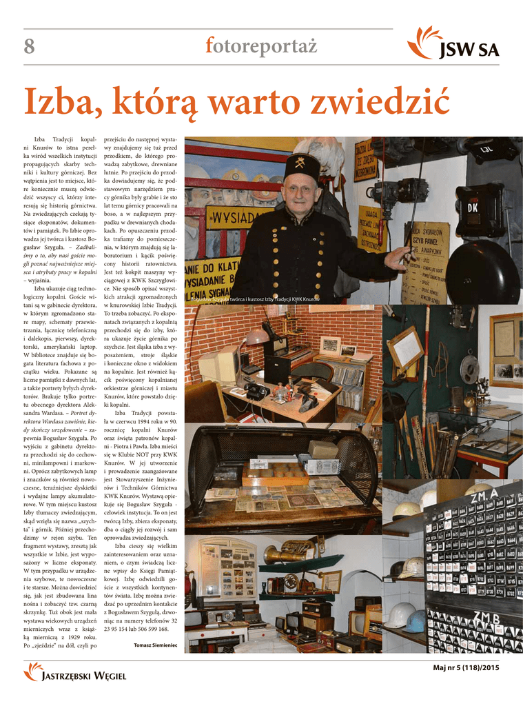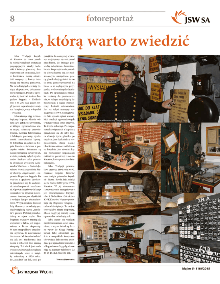 fotoreportaż Izba, którą warto zwiedzić Izba Tradycji kopalni Knurów to istna perełka wśród wszelkich instytucji propagujących skarby techniki i kultury górniczej. Bez wątpienia jest to miejsce, które koniecznie muszą odwiedzić wszyscy ci, którzy interesują się historią górnictwa. Na zwiedzających czekają tysiące eksponatów, dokumentów i pamiątek. Po Izbie oprowadza jej twórca i kustosz Bogusław Szyguła. – Zadbaliśmy o to, aby nasi goście mogli poznać najważniejsze miejsca i atrybuty pracy w kopalni – wyjaśnia. Izba ukazuje ciąg technologiczny kopalni. Goście witani są w gabinecie dyrektora, w którym zgromadzono stare mapy, schematy przewietrzania, łącznicę telefoniczną i dalekopis, pierwszy, dyrektorski, amerykański laptop. W bibliotece znajduje się bogata literatura fachowa z początku wieku. Pokazane są liczne pamiątki z dawnych lat, a także portrety byłych dyrektorów. Brakuje tylko portretu obecnego dyrektora Aleksandra Wardasa. – Portret dyrektora Wardasa zawiśnie, kiedy skończy urzędowanie – zapewnia Bogusław Szyguła. Po wyjściu z gabinetu dyrektora przechodzi się do cechowni, minilampowni i markowni. Oprócz zabytkowych lamp i znaczków są również nowoczesne, teraźniejsze dyskietki i wydajne lampy akumulatorowe. W tym miejscu kustosz Izby tłumaczy zwiedzającym, skąd wzięła się nazwa „szychta” i górnik. Później przechodzimy w rejon szybu. Ten fragment wystawy, zresztą jak wszystkie w Izbie, jest wyposażony w liczne eksponaty. W tym przypadku w urządzenia szybowe, te nowoczesne i te starsze. Można dowiedzieć się, jak jest zbudowana lina nośna i zobaczyć tzw. czarną skrzynkę. Tuż obok jest mała wystawa wiekowych urządzeń mierniczych wraz z książką mierniczą z 1929 roku. Po „zjeździe” na dół, czyli po przejściu do następnej wystawy znajdujemy się tuż przed przodkiem, do którego prowadzą zabytkowe, drewniane lutnie. Po przejściu do przodka dowiadujemy się, że podstawowym narzędziem pracy górnika były grabie i że sto lat temu górnicy pracowali na boso, a w najlepszym przypadku w drewnianych chodakach. Po opuszczeniu przodka trafiamy do pomieszczenia, w którym znajdują się laboratorium i kącik poświęcony historii ratownictwa. Jest też kokpit maszyny wyciągowej z KWK Szczygłowice. Nie sposób opisać wszystkich atrakcji zgromadzonych w knurowskiej Izbie Tradycji. To trzeba zobaczyć. Po eksponatach związanych z kopalnią przechodzi się do izby, która ukazuje życie górnika po szychcie. Jest śląska izba z wyposażeniem, stroje śląskie i konieczne okno z widokiem na kopalnie. Jest również kącik poświęcony kopalnianej orkiestrze górniczej i miastu Knurów, które powstało dzięki kopalni. Izba Tradycji powstała w czerwcu 1994 roku w 90. rocznicę kopalni Knurów oraz święta patronów kopalni - Piotra i Pawła. Izba mieści się w Klubie NOT przy KWK Knurów. W jej utworzenie i prowadzenie zaangażowane jest Stowarzyszenie Inżynierów i Techników Górnictwa KWK Knurów. Wystawą opiekuje się Bogusław Szyguła człowiek instytucja. To on jest twórcą Izby, zbiera eksponaty, dba o ciągły jej rozwój i sam oprowadza zwiedzających. Izba cieszy się wielkim zainteresowaniem oraz uznaniem, o czym świadczą liczne wpisy do Księgi Pamiątkowej. Izbę odwiedzili goście z wszystkich kontynentów świata. Izbę można zwiedzać po uprzednim kontakcie z Bogusławem Szygułą, dzwoniąc na numery telefonów 32 23 95 154 lub 506 599 168. Bogusław Szyguła twórca i kustosz Izby Tradycji KWK Knurów Tomasz Siemieniec Maj nr 5 (118)/2015 fotoreportaż Maj nr 5 (118)/2015
