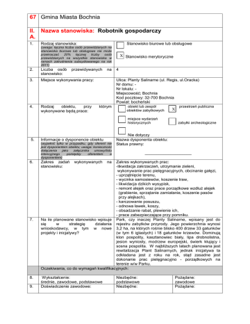 67 Gmina Miasta Bochnia II. Nazwa stanowiska: Robotnik gospodarczy A. 1. Rodzaj stanowiska: Stanowisko biurowe lub obsługowe (uwaga: łączna liczba osób przewidzianych na stanowiska biurowe lub obsługowe nie może przekraczać 20% łącznej liczby osób przewidzianych na wszystkie stanowiska w ramach zatrudnienia subsydiowanego na rok 2011) 2. Liczba osób stanowisko: przewidywanych 3. Miejsce wykonywania pracy: 4. Rodzaj obiektu, przy wykonywane będą prace: na X Stanowisko merytoryczne 4 Ulica: Planty Salinarne (ul. Regis, ul.Oracka) Nr domu: Nr lokalu: Miejscowość; Bochnia Kod pocztowy: 32-700 Bochnia Powiat: bocheński którym obiekt lub zespół obiektów zabytkowych miejsce wydarzeń historycznych 5. Informacje o dysponencie obiektu (wypełnić tylko w przypadku, gdy oferent nie jest dysponentem obiektu; uwaga: konieczność dołączenia jako załącznika umowy/listu intencyjnego pomiędzy oferentem a dysponentem) 6. 7. 8. 9. Zakres zadań stanowisku: wykonywanych X przestrzeń publiczna zabytki archeologiczne Nie dotyczy Nazwa dysponenta obiektu: Status prawny: ____________________ Zakres wykonywanych prac: -likwidacja zakrzaczeń, utrzymanie zieleni, wykonywanie prac pielęgnacyjnych, obcinanie gałęzi, - uprzątnięcie terenu, - wycinka samosiewów, koszenie traw, - likwidacja dzikich wysypisk, - remont alejek oraz prace porządkowe wzdłuż alejek (grabienie, sprzątanie zamiatanie, koszenie pasów przy alejkach), - karczowanie posuszu, - odnowa ławek, koszy, - obsadzanie rabat, plewienie ich, - prace zabezpieczające przy pomniku. Na ile planowane stanowisko wpisuje Park, czy inaczej Planty Salinarne, wpisany jest do się w strategię działania rejestru zabytków przyrody. Jego powierzchnia wynosi wnioskodawcy, w tym w nowe 3,2 ha, na których rośnie blisko 400 drzew 33 gatunków projekty i inicjatywy? (w tym 6 iglastych) i 18 gatunków krzewów. Dominują klon pospolity, kasztanowiec biały, lipa drobnolistna, jesion wyniosły, modrzew europejski, świerk kłujący i sosna pospolita. W najbliższych latach planowana jest rewitalizacja Plant Salinarnych, jednak inicjatywa ta odkładana jest z roku na rok, stąd zasadne jest dokonanie prac pielęgnacyjno - porządkowych na terenie w/w Parku. Oczekiwania, co do wymagań kwalifikacyjnych: Wykształcenie: średnie, zawodowe, podstawowe Doświadczenie zawodowe: na Niezbędne: podstawowe Niezbędne: Pożądane: zawodowe Pożądane: 10. bez doświadczenia zawodowego i z doświadczeniem zawodowym Umiejętności: bez doświadczenia zawodowego Niezbędne: z doświadczeniem zawodowym Pożądane: umiejętność wykonywania drobnych napraw 11. wykonywania drobnych napraw, dokładność, szybkość, zorganizowanie, umiejętność pracy w zespole Cechy osobowe: dokładność, szybkość, zorganizowanie, umiejętność pracy w zespole Pożądane: 12. pracowitość, zdyscyplinowanie, odpowiedzialność, sumienność, obowiązkowość Oferta jest kierowana również do osób z niepełnosprawnością Wstępne wymagania dotyczące sprawności kandydata (np. stopień sprawności fizycznej, intelektualnej, wzroku, słuchu, odporność na stres itp.) 13. Umiejętności, które osoba nabędzie na stanowisku: 14. Sposób wprowadzenia osoby na stanowisko (szkolenia wewnętrzne, instruktaże): 15. Sposób nadzoru/ monitorowania pracy na stanowisku: 16. Sposób organizacji pracy – czas pracy, np. Czy stanowisko wymaga dyspozycyjności w soboty/ niedzielę/ święta? Czy istnieje możliwość zatrudnienia przez Wnioskodawcę po zatrudnieniu subsydiowanym? W stosunku do ilu osób zgłaszanych na stanowisko objęte niniejszą ofertą Wnioskodawca deklaruje możliwość zatrudnienia. Dodatkowe informacje, które mogą być istotne przy ocenie oferty: 17. 18. Niezbędne: pracowitość, zdyscyplinowanie, odpowiedzialność X Tak sumienność, obowiązkowość Nie Wymagania dotyczące sprawności kandydata: preferowany lekki stopień niepełnosprawności sprawność fizyczna w stopniu umożliwiającym wykonywanie drobnych prac remontowych i porządkowych. Pracownicy nabędą umiejętności w zakresie utrzymania zieleni miejskiej, obsadzania rabat, wykonywania drobnych prac pielęgnacyjnych w tym zakresie, wykonywania remontów i prac zabezpieczających, malowania, grabienia, koszenia. Pracownicy zostaną przeszkoleni z zakresu BHP (szkolenie wstępne i stanowiskowe), zapoznani zostaną z kartą oceny ryzyka zawodowego, Regulaminem pracy oraz innymi wewnętrznymi regulaminami obowiązującymi w Urzędzie Miasta. Prace wykonywane przez pracowników w ramach programu „Konserwator” kierowane będą przez Naczelnika wydziału Architektury, Gospodarki Komunalnej i Inwestycji, który pisemnie zobowiązany będzie do kierowania pracą pracowników zatrudnionych przez Urząd Miejski oraz do zorganizowania jej w sposób gwarantujący realizację zaplanowanych zadań z zapewnieniem przestrzegania zasad bezpieczeństwa i higieny pracy. Wyznaczona zostanie również osoba od sprawowania bezpośredniego nadzoru na wykonywaniem prac przez w/w pracowników. Praca odbywać się będzie od poniedziałku do piątku w godz. od 7.00 do 15.00. Nie wymaga dyspozycyjności w soboty (niedziele) i święta. X Tak Nie Liczba osób: 3 osoby na czas określony 3 m -ce. Urząd Miasta Bochnia wywiązuje się z zobowiązań dotyczących dalszego zatrudnienia po okresie subsydiowanym, np. w ramach organizowanych przez Powiatowy Urząd Pracy w Bochni robót publicznych i staży.