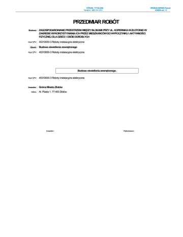 STRONA TYTUŁOWA Temat nr : DE1-111-1111 ORGBUD-SERWIS Poznań KOBRA wer. 12 PRZEDMIAR ROBÓT Budowa : ZAGOSPODAROWANIE PRZESTRZENI MIĘDZY BLOKAMI PRZY UL. KOPERNIKA W ZŁOTOWIE W ZAKRESIE WYKORZYSTYWANIA ICH PRZEZ MIESZKAŃCÓW DO WYPOCZYNKU I AKTYWNOŚCI FIZYCZNEJ DLA DZIECI I OSÓB DOROSŁYCH Kod CPV : 45310000-3 Roboty instalacyjne elektryczne Obiekt : Kod CPV : Budowa oświetlenia zewnętrznego 45310000-3 Roboty instalacyjne elektryczne Budowa oświetlenia zewnętrznego. Kod CPV : 45310000-3 Roboty instalacyjne elektryczne Inwestor : Gmina Miasto Złotów Adres : Al. Piasta 1, 77-400 Złotów Inwestor : Wykonawca : PRZEDMIAR ROBÓT Temat nr : DE1-111-1111 ORGBUD-SERWIS Poznań KOBRA wer. 12 Budowa oświetlenia zewnętrznego. Budowa : ZAGOSPODAROWANIE PRZESTRZENI MIĘDZY BLOKAMI PRZY UL. KOPERNIKA W ZŁOTOWIE W ZAKRESIE WYKORZYSTYWANIA ICH PRZEZ MIESZKAŃCÓW DO WYPOCZYNKU I AKTYWNOŚCI FIZYCZNEJ DLA DZIECI I OSÓB DOROSŁYCH Obiekt : Budowa oświetlenia zewnętrznego Data: 2016-04-25 Lp. Podstawa kalkulacji / opis pozycji Ilość Jedn. miary 1 Prace montażowe 1 KNNR 005-0701-02-00 MRRiB 69,440 m3 Ręczne kopanie rowów dla kabli, w gruncie : kat. III (221m x 0,4m x 0,8m) 2 KNNR 005-0706-02-00 MRRiB 221,000 m Nasypanie warstwy piasku na dnie rowu kablowego o szerokości: ponad 0,4 do 0,6 m 3 KNNR 005-0707-02-00 MRRiB 181,000 m Ręczne układanie kabli w rowach kablowych, o masie pon. 0,5 do 1,0 kg/m, z przykryciem kabli: folią z PCW uplast.gr.pow.0,4-0,6 mm gat.I/II 4 KNNR 005-0705-01-00 MRRiB 40,000 m Ułożenie rur osłonowych: z PCW, o śr.do 75 mm /rura DVK 75/ 5 KNNR 005-0713-01-00 MRRiB 40,000 m Układanie kabli w rurach, pustakach lub kanałach zamkniętych, o masie: do 0,5 kg/m 6 KNNR 005-0702-02-00 MRRiB 69,440 m3 Ręczne zasypywanie rowów dla kabli, w gruncie : kat. III 7 KNNR 005-0715-02-00 MRRiB 39,000 m Wprowadzenie kabla YAKY 4x25mm2 do słupa /analogia/ 8 KNNR 001-0408-02-00 MRRiB 69,440 m3 Zagęszczanie nasypów ubijakami mechanicznymi, w gruncie: spoistym kat. III 9 KSNR 005-1001-01-00 WACETOB Warszawa 9,000 szt Montaż i stawianie słupów oświetleniowych wraz z wykonaniem wykopu koparką podsiębierną-słup stalowy o masie do 100 kg - Słup SPB-0 (h=4m) 10 KSNR 005-1004-02-00 WACETOB Warszawa 9,000 szt Montaż opraw oświetlenia zewnętrznego na wysięgniku - oprawa OP10 LED 40W 11 KNNR 005-1006-01-00 MRRiB 9,000 szt Montaż: tablic bezpiecznikowych wnękowych TB12 12 KNNR 005-1003-01-00 MRRiB 9,000 kpl Montaż przewodów do opraw oświetleniowych, przez wciąganie w słupy, rury osłonowe i wysięgniki, przy wysokości latarń: do 4 m /bez wysięgnika/ 13 KNR 508-0608-07-00 WACETOB Warszawa 221,000 m Montaż uziemienia w rowach kablowych - drut stalowy ocynkowany fi 8mm 14 KNR 510-0601-02-00 IZOiEPB ORGBUD W-wa 18,000 szt Obróbka na sucho kabli energetycznych jednożyłow. z żyłami aluminiowymi, na napiecie do 1 kV, o izolacji i powłoce z tworzyw sztucznych; zarobienie końca kabla o przekroju: ponad 16 do 50 mm2 2 Usunięcie kolizji z istniejącą siecią energetyczną 15 KNNR 005-0701-02-00 MRRiB 25,600 m3 Ręczne kopanie rowów dla kabli, w gruncie : kat. III - odkopanie istniejących kabli w miejscach kolizyjnych 16 KNNR 005-0705-01-00 MRRiB 80,000 m Ułożenie rur osłonowych dwudzielnych QRD 110 17 KNNR 005-0702-02-00 MRRiB 25,600 m3 Ręczne zasypywanie rowów dla kabli, w gruncie : kat. III 18 KNNR 001-0408-02-00 MRRiB 25,600 m3 Zagęszczanie nasypów ubijakami mechanicznymi, w gruncie: spoistym kat. III 3 Pomiary pomontażowe 19 KNNR 005-1302-03-00 MRRiB 11,000 odc Badanie linii kablowej: niskiego napięcia - kabel 4-żyłowy 20 KNNR 005-1303-01-00 MRRiB 1,000 pomiar Pomiar rezystancji izolacji przewodów: obwód 1-fazowy - pierwszy pomiar 21 KNNR 005-1303-02-00 MRRiB 8,000 pomiar Pomiar rezystancji izolacji przewodów: obwód 1-fazowy - każdy nastepny pomiar 22 KNNR 005-1304-01-00 MRRiB Badania i pomiary instalacji uziemienia ochronnego lub roboczego: - pierwszy pomiar 1,000 szt PRZEDMIAR ROBÓT Temat nr : DE1-111-1111 ORGBUD-SERWIS Poznań KOBRA wer. 12 Budowa oświetlenia zewnętrznego. 3. Pomiary pomontażowe Data: 2016-04-25 Lp. Podstawa kalkulacji / opis pozycji 23 KNNR 005-1304-02-00 MRRiB Ilość Jedn. miary 8,000 szt Badania i pomiary instalacji uziemienia ochronnego lub roboczego: - każdy następny pomiar 24 KNR 508-0902-01-00 WACETOB Warszawa 1,000 pomiar Sprawdzenie samoczynnego wyłączenia zasilania: pomiar impedancji pętli zwarciowej - pierwszy 25 KNR 508-0902-02-00 WACETOB Warszawa 8,000 pomiar Sprawdzenie samoczynnego wyłączenia zasilania: pomiar impedancji pętli zwarciowej - następny 4 Obsługa geodezyjna 26 Pozycja 1,000 kpl Obsługa geodezyjna - - - Koniec wydruku - - - NAKŁADY RMS Temat nr : DE1-111-1111 ORGBUD-SERWIS Poznań KOBRA wer. 12 Budowa oświetlenia zewnętrznego. Budowa : ZAGOSPODAROWANIE PRZESTRZENI MIĘDZY BLOKAMI PRZY UL. KOPERNIKA W ZŁOTOWIE W ZAKRESIE WYKORZYSTYWANIA ICH PRZEZ MIESZKAŃCÓW DO WYPOCZYNKU I AKTYWNOŚCI FIZYCZNEJ DLA DZIECI I OSÓB DOROSŁYCH Obiekt : Budowa oświetlenia zewnętrznego NAKŁADY RMS Data: 2016-04-25 Lp. Alt. Gr. / Symbol KMB / Producent Inw. Opis czynnika R,M,S Ilość J.m. Robocizna 1. 999 Robocizna 572,68310 r-g Nakład robocizny : 572,68310 r-g Materiały 1. 2. 3. 4. 5. 6. 7. 8. 9. 10. 11. 12. 13. 14. 15. 16. 17. 18. 19. 20. 21. 1 1034799 1050099 1121099 1560199 1601800 1601899 1602599 1700310 5609999 5609999 7058300 7301999 7593500 7620002 7648099 7648099 7660199 7951008 7960155 8110199 8190601 Wazeliny techniczne Benzyny do ekstrakcji Drut stalowy ocynkowany fi 8mm Folie PVC Piaski do betonów zwykłych naturalne Piaski do betonów zwykłych Żwiry do betonów zwykłych,wielofrakcyjne Cement portlandzki zwykły 35 bez dodatków Rura DVK 75 Rura QRD 110 /dwudzielna/ Tablice bezpiecznikowe TB12 Oprawa OP-010 LED 40W Fundament pod słup Końcówka kablowa do zapras.,2KA 25 mm2 Opaski kablowe instalacyjne (OKI) Opaski kablowe instalacyjne (OKI)0,15 Uchwyty kablowe uniwer