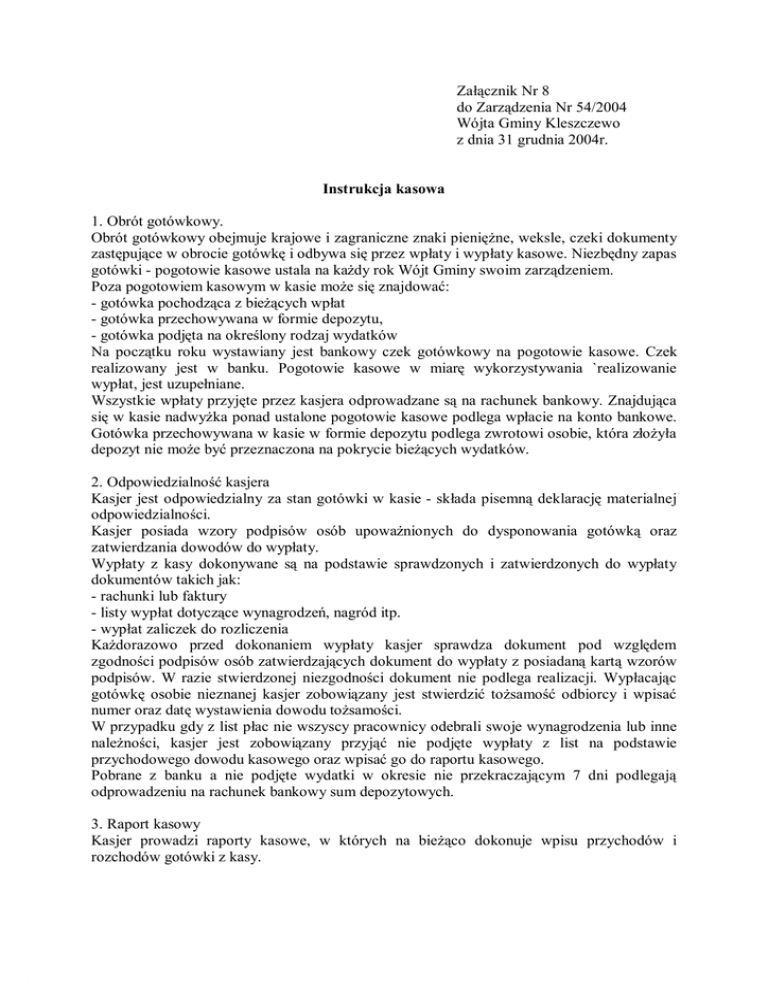 Załącznik Nr 8 do Zarządzenia Nr 54/2004 Wójta Gminy Kleszczewo z dnia 31 grudnia 2004r. Instrukcja kasowa 1. Obrót gotówkowy. Obrót gotówkowy obejmuje krajowe i zagraniczne znaki pieniężne, weksle, czeki dokumenty zastępujące w obrocie gotówkę i odbywa się przez wpłaty i wypłaty kasowe. Niezbędny zapas gotówki - pogotowie kasowe ustala na każdy rok Wójt Gminy swoim zarządzeniem. Poza pogotowiem kasowym w kasie może się znajdować: - gotówka pochodząca z bieżących wpłat - gotówka przechowywana w formie depozytu, - gotówka podjęta na określony rodzaj wydatków Na początku roku wystawiany jest bankowy czek gotówkowy na pogotowie kasowe. Czek realizowany jest w banku. Pogotowie kasowe w miarę wykorzystywania `realizowanie wypłat, jest uzupełniane. Wszystkie wpłaty przyjęte przez kasjera odprowadzane są na rachunek bankowy. Znajdująca się w kasie nadwyżka ponad ustalone pogotowie kasowe podlega wpłacie na konto bankowe. Gotówka przechowywana w kasie w formie depozytu podlega zwrotowi osobie, która złożyła depozyt nie może być przeznaczona na pokrycie bieżących wydatków. 2. Odpowiedzialność kasjera Kasjer jest odpowiedzialny za stan gotówki w kasie - składa pisemną deklarację materialnej odpowiedzialności. Kasjer posiada wzory podpisów osób upoważnionych do dysponowania gotówką oraz zatwierdzania dowodów do wypłaty. Wypłaty z kasy dokonywane są na podstawie sprawdzonych i zatwierdzonych do wypłaty dokumentów takich jak: - rachunki lub faktury - listy wypłat dotyczące wynagrodzeń, nagród itp. - wypłat zaliczek do rozliczenia Każdorazowo przed dokonaniem wypłaty kasjer sprawdza dokument pod względem zgodności podpisów osób zatwierdzających dokument do wypłaty z posiadaną kartą wzorów podpisów. W razie stwierdzonej niezgodności dokument nie podlega realizacji. Wypłacając gotówkę osobie nieznanej kasjer zobowiązany jest stwierdzić tożsamość odbiorcy i wpisać numer oraz datę wystawienia dowodu tożsamości. W przypadku gdy z list płac nie wszyscy pracownicy odebrali swoje wynagrodzenia lub inne należności, kasjer jest zobowiązany przyjąć nie podjęte wypłaty z list na podstawie przychodowego dowodu kasowego oraz wpisać go do raportu kasowego. Pobrane z banku a nie podjęte wydatki w okresie nie przekraczającym 7 dni podlegają odprowadzeniu na rachunek bankowy sum depozytowych. 3. Raport kasowy Kasjer prowadzi raporty kasowe, w których na bieżąco dokonuje wpisu przychodów i rozchodów gotówki z kasy. Na podstawie dokumentu KP kasa przyjmie kasjer dokonuje wpisu przychodu do raportu kasowego. Wypłaty gotówki wpisywane są do raportu na podstawie faktur, rachunków, poleceń wypłat, zaliczek, delegacji wyjazdu służbowego oraz innych dowodów wewnętrznych zadeklarowanych i zatwierdzonych do wypłaty. Raporty muszą być bezwzględnie sporządzone na koniec każdego miesiąca. Wszystkie dowody dołączone do raportu muszą zawierać potwierdzenie wypłaconej kwoty z określeniem jej wysokości datą i podpisem osoby pobierającej wypłatę. Raport kasowy zamyka się przez sumowanie wpłat i wypłat oraz obliczenie stanu końcowego gotówki. Podpisany przez kasjera oryginał raportu wraz z dowodami kasowymi kasjer przekazuje do działu księgowości budżetowej. Kopia raportu pozostaje w kasie. 4. Znaki skarbowe i weksle. Znaki skarbowe i weksle sprzedawane są w kasie. Raport z obrotu znakami skarbowymi i wekslami sporządza się na koniec każdego miesiąca na podstawie zestawienia zamówienia oraz dowodów wpłat.. Zamówienie na znaki skarbowe i weksle składane są do banku, z którym zawarto umowę do wysokości i gotówki za sprzedane znaki i weksle. Zaliczka na znaki skarbowe wynosi 799 zł, a na weksle 1 zł. 5. Druki ścisłego zarachowania. Kasjer zobowiązany jest do prowadzenia na bieżąco druków ścisłego zarachowania. Ewidencja druków obejmuje kwitariusz K - 103. Odbiór oraz zwrot druków ścisłego zarachowania potwierdzony jest przez upoważnione osoby (głównie sołtysów) podpisem i datą w księdze druków ścisłego zarachowania. Księga musi mieć wszystkie strony ponumerowane i trwale zszyte. 12. Przekazywanie kasy. Przekazywanie kasy odbywa się na podstawie inwentaryzacji zdawczo - odbiorczej. Pracownik przejmujący kasę musi posiadać deklarację odpowiedzialności materialnej. W czasie przekazywania wszystkie przekazywane pozycje podlegają przeliczeniu, a stan kasy musi być zgodny z raportem kasowym. Podczas przekazywania kasy obecni są Skarbnik lub Sekretarz Gminy oraz osoba zdająca - Kasjer i osoba przyjmująca kasę. 13. Zabezpieczenie przed kradzieżą gotówki, znaków skarbowych, weksli i druków ścisłego zarachowania oraz dokumentów. W Urzędzie Gminy zainstalowany jest system alarmowy podłączony do Komendy Policji. Po zakończeniu pracy gotówka przechowywana jest w kasetce metalowej zamykanej na klucz i umieszczonej w kasie pancernej. Znaki skarbowe i weksle przechowywane są w kasie pancernej. Druki ścisłego zarachowania przechowywane są w szafie metalowej zamykanej na kluch. W oknach zamontowane są szyby przeciw włamaniowe, a drzwi kasy zamykane są na dwa zamki.