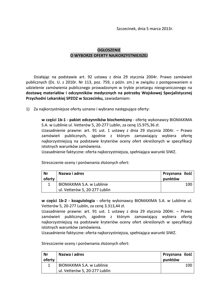 Szczecinek, dnia 5 marca 2013r. OGŁOSZENIE O WYBORZE OFERTY NAJKORZYSTNIEJSZEJ Działając na podstawie art. 92 ustawy z dnia 29 stycznia 2004r. Prawo zamówień publicznych (Dz. U. z 2010r. Nr 113, poz. 759, z późn. zm.) w związku z postępowaniem o udzielenie zamówienia publicznego prowadzonym w trybie przetargu nieograniczonego na dostawę materiałów i odczynników medycznych na potrzeby Wojskowej Specjalistycznej Przychodni Lekarskiej SPZOZ w Szczecinku, zawiadamiam: 1) Za najkorzystniejsze oferty uznano i wybrano następujące oferty: w części 1b-1 - pakiet odczynników biochemiczny - ofertę wykonawcy BIOMAXIMA S.A. w Lublinie ul. Vetterów 5, 20-277 Lublin, za cenę 15.975,36 zł. Uzasadnienie prawne: art. 91 ust. 1 ustawy z dnia 29 stycznia 2004r. – Prawo zamówień publicznych, zgodnie z którym zamawiający wybiera ofertę najkorzystniejszą na podstawie kryteriów oceny ofert określonych w specyfikacji istotnych warunków zamówienia. Uzasadnienie faktyczne: oferta najkorzystniejsza, spełniająca warunki SIWZ. Streszczenie oceny i porównania złożonych ofert: Nazwa i adres Nr oferty 1 BIOMAXIMA S.A. w Lublinie ul. Vetterów 5, 20-277 Lublin Przyznana ilość punktów 100 w części 1b-2 - koagulologia - ofertę wykonawcy BIOMAXIMA S.A. w Lublinie ul. Vetterów 5, 20-277 Lublin, za cenę 3.313,44 zł. Uzasadnienie prawne: art. 91 ust. 1 ustawy z dnia 29 stycznia 2004r. – Prawo zamówień publicznych, zgodnie z którym zamawiający wybiera ofertę najkorzystniejszą na podstawie kryteriów oceny ofert określonych w specyfikacji istotnych warunków zamówienia. Uzasadnienie faktyczne: oferta najkorzystniejsza, spełniająca warunki SIWZ. Streszczenie oceny i porównania złożonych ofert: Nr Nazwa i adres oferty 1 BIOMAXIMA S.A. w Lublinie ul. Vetterów 5, 20-277 Lublin Przyznana ilość punktów 100 w części 1b-3 - testy biochemiczne i immunochemiczne - ofertę wykonawcy BIOMAXIMA S.A. w Lublinie ul. Vetterów 5, 20-277 Lublin, za cenę 6.745,68 zł. Uzasadnienie prawne: art. 91 ust. 1 ustawy z dnia 29 stycznia 2004r. – Prawo zamówień publicznych, zgodnie z którym zamawiający wybiera ofertę najkorzystniejszą na podstawie kryteriów oceny ofert określonych w specyfikacji istotnych warunków zamówienia. Uzasadnienie faktyczne: oferta najkorzystniejsza, spełniająca warunki SIWZ. Streszczenie oceny i porównania złożonych ofert: Nr Nazwa i adres oferty 1 BIOMAXIMA S.A. w Lublinie ul. Vetterów 5, 20-277 Lublin Przyznana ilość punktów 100 w części 1b-4 - płyny kondycjonujące do aparatu biochemicznego – METROLAB 2300 - ofertę wykonawcy BIOMAXIMA S.A. w Lublinie ul. Vetterów 5, 20-277 Lublin, za cenę 6.936,96 zł. Uzasadnienie prawne: art. 91 ust. 1 ustawy z dnia 29 stycznia 2004r. – Prawo zamówień publicznych, zgodnie z którym zamawiający wybiera ofertę najkorzystniejszą na podstawie kryteriów oceny ofert określonych w specyfikacji istotnych warunków zamówienia. Uzasadnienie faktyczne: oferta najkorzystniejsza, spełniająca warunki SIWZ. Streszczenie oceny i porównania złożonych ofert: Nr Nazwa i adres oferty 1 BIOMAXIMA S.A. w Lublinie ul. Vetterów 5, 20-277 Lublin Przyznana ilość punktów 100 w części 1b-5 - sprzęt jednorazowy - ofertę wykonawcy BIOMAXIMA S.A. w Lublinie ul. Vetterów 5, 20-277 Lublin, za cenę 16.022,16 zł. Uzasadnienie prawne: art. 91 ust. 1 ustawy z dnia 29 stycznia 2004r. – Prawo zamówień publicznych, zgodnie z którym zamawiający wybiera ofertę najkorzystniejszą na podstawie kryteriów oceny ofert określonych w specyfikacji istotnych warunków zamówienia. Uzasadnienie faktyczne: oferta najkorzystniejsza, spełniająca warunki SIWZ. Streszczenie oceny i porównania złożonych ofert: Nr Nazwa i adres oferty 1 BIOMAXIMA S.A. w Lublinie ul. Vetterów 5, 20-277 Lublin Przyznana ilość punktów 100 w części 1e - kompresy, opaski, plastry - ofertę wykonawcy ZARYS Sp. z o.o. w Zabrzu, ul. Pod Borem 18, 41-808 Zabrze, za cenę 21.305,57 zł. Uzasadnienie prawne: art. 91 ust. 1 ustawy z dnia 29 stycznia 2004r. – Prawo zamówień publicznych, zgodnie z którym zamawiający wybiera ofertę najkorzystniejszą na podstawie kryteriów oceny ofert określonych w specyfikacji istotnych warunków zamówienia. Uzasadnienie faktyczne: oferta najkorzystniejsza, spełniająca warunki SIWZ. Streszczenie oceny i porównania złożonych ofert: Nr Nazwa i adres oferty 3 ZARYS Sp. z o.o. w Zabrzu, ul. Pod Borem 18, 41-808 Zabrze Przyznana ilość punktów 100 w części 1j - rękawiczki - ofertę wykonawcy ZARYS Sp. z o.o. w Zabrzu, ul. Pod Borem 18, 41-808 Zabrze, za cenę 7.969,75 zł. Uzasadnienie prawne: art. 91 ust. 1 ustawy z dnia 29 stycznia 2004r. – Prawo zamówień publicznych, zgodnie z którym zamawiający wybiera ofertę najkorzystniejszą na podstawie kryteriów oceny ofert określonych w specyfikacji istotnych warunków zamówienia. Uzasadnienie faktyczne: oferta najkorzystniejsza, spełniająca warunki SIWZ. Streszczenie oceny i porównania złożonych ofert: Nazwa i adres Nr oferty 3 ZARYS Sp. z o.o. w Zabrzu, ul. Pod Borem 18, 41-808 Zabrze 2 TZMO S.A. w Toruniu ul. Zółkiewskiego 20/26, 87-100 Toruń Przyznana ilość punktów 100 85,69 w części 1k - serwety chirurgiczne - ofertę wykonawcy TZMO S.A. w Toruniu ul. Zółkiewskiego 20/26, 87-100 Toruń, za cenę 3.343,68 zł. Uzasadnienie prawne: art. 91 ust. 1 ustawy z dnia 29 stycznia 2004r. – Prawo zamówień publicznych, zgodnie z którym zamawiający wybiera ofertę najkorzystniejszą na podstawie kryteriów oceny ofert określonych w specyfikacji istotnych warunków zamówienia. Uzasadnienie faktyczne: oferta najkorzystniejsza, spełniająca warunki SIWZ. Streszczenie oceny i porównania złożonych ofert: Nr Nazwa i adres oferty 2 TZMO S.A. w Toruniu ul. Zółkiewskiego 20/26, 87-100 Toruń 2) W pozostałym zakresie, tj.: a) gabinet stomatologiczny (część 1a); b) poradnia ginekologiczna (część 1c); Przyznana ilość p