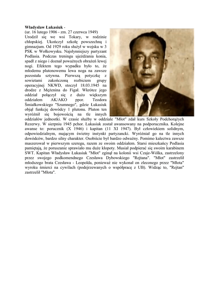 Władysław Łukasiuk (ur. 16 lutego 1906 - zm. 27 czerwca 1949) Urodził się we wsi Tokary, w rodzinie chłopskiej. Ukończył szkołę powszechną i gimnazjum. Od 1929 roku słuŜył w wojsku w 3 PSK w Wołkowysku. Najsłynniejszy partyzant Podlasia. Podczas treningu ujeŜdŜania konia, spadł z niego i doznał powaŜnych obraŜeń lewej nogi. Efektem tego wypadku było to, Ŝe młodemu plutonowemu lewa noga na zawsze pozostała sztywna. Pierwszą potyczkę z sowietami zakończoną rozbiciem grupy operacyjnej NKWD, stoczył 18.03.1945 na drodze z MęŜenina do Figał. Wkrótce jego oddział połączył się z duŜo większym oddziałem AK/AKO ppor. Teodora Śmiałkowskiego "Szumnego", gdzie Łukasiuk objął funkcję dowódcy 1 plutonu. Pluton ten wyróŜnił się bojowością na tle innych oddziałów jednostki. W czasie słuŜby w oddziale "Młot" zdał kurs Szkoły PodchorąŜych Rezerwy. W sierpniu 1945 pchor. Łukasiuk został awansowany na podporucznika. Kolejne awanse to: porucznik (X 1946) i kapitan (11 XI 1947). Był człowiekiem solidnym, odpowiedzialnym, mającym świetny instynkt partyzancki. WyróŜniał go na tle innych dowódców, bardzo silny charakter. Osobiście był bardzo odwaŜny. Pomimo kalectwa zawsze maszerował w pierwszym szeregu, razem ze swoim oddziałem. Starsi mieszkańcy Podlasia pamiętają, Ŝe poruszanie sprawiało mu duŜe kłopoty. Musiał podpierać się swoim karabinem SWT. Kapitan Władysław Łukasiuk "Młot" zginął na kolonii wsi Czaje-Wólka, zastrzelony przez swojego podkomendnego Czesława Dybowskiego "Rejtana". "Młot" zastrzelił młodszego brata Czesława - Leopolda, poniewaŜ nie wykonał on zleconego przez "Młota" wyroku śmierci na cywilach (podejrzewanych o współpracę z UB). Widząc to, "Rejtan" zastrzelił "Młota".