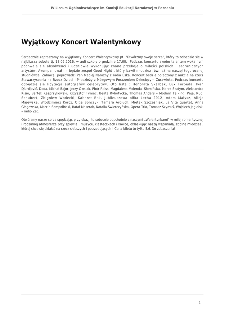IV Liceum Ogólnokształcące im.Komisji Edukacji Narodowej w Poznaniu Wyjątkowy Koncert Walentynkowy Serdecznie zapraszamy na wyjątkowy Koncert Walentynkowy pt. "Otwórzmy swoje serca", który to odbędzie się w najbliższą sobotę tj. 13.02.2016, w auli szkoły o godzinie 17.00. Podczas koncertu swoim talentem wokalnym pochwalą się absolwenci i uczniowie wykonując znane przeboje o miłości polskich i zagranicznych artystów. Akompaniował im będzie zespół Good Night , który bawił młodzież również na naszej tegorocznej studniówce. Zabawę poprowadzi Pan Maciej Narożny z radia Eska. Koncert będzie połączony z aukcją na rzecz Stowarzyszenia na Rzecz Dzieci i Młodzieży z Mózgowym Porażeniem Dziecięcym Żurawinka. Podczas koncertu odbędzie się licytacja autografów celebrytów. Oto lista : Honorata Skarbek, Lux Torpeda, Ivan Djurdjević, Doda, Michał Bajor, Jerzy Owsiak, Piotr Reiss, Magdalena Molenda- Słomińska, Marek Siudym, Aleksandra Kisio, Bartek Kasprzykowski, Krzysztof Tyniec, Beata Rybotycka, Thomas Anders – Modern Talking, Peja, Rudi Schubert, Zbigniew Wodecki, Kabaret Rak, Jubileuszowa piłka Lecha 2012, Adam Małysz, Alicja Majewska, Włodzimierz Korcz, Olga Bończyk, Tamara Arciuch, Mietek Szcześniak, La Vita quartet, Anna Głogowska, Marcin Sompoliński, Rafał Maserak, Natalia Świerczyńska, Opera Trio, Tomasz Szymuś, Wojciech Jagielski – radio Zet. Otwórzmy nasze serca spędzając przy okazji to sobotnie popołudnie z naszymi „Walentynkami” w miłej romantycznej i rodzinnej atmosferze przy śpiewie , muzyce, ciasteczkach i kawce, oklaskując naszą wspaniałą, zdolną młodzież , której chce się działać na rzecz słabszych i potrzebujących ! Cena biletu to tylko 5zł. Do zobaczenia! 1