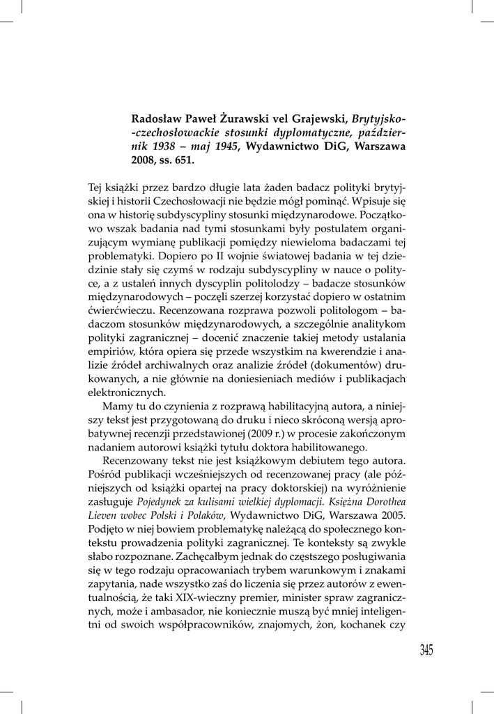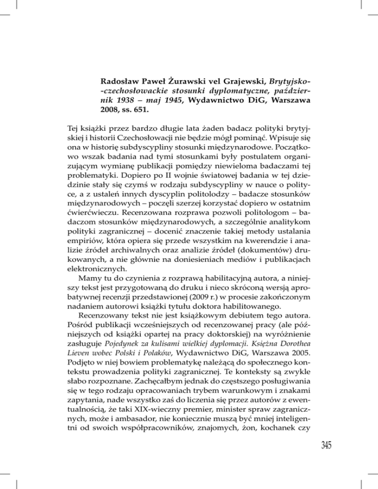 Radosław Paweł Żurawski vel Grajewski, Brytyjsko-czechosłowackie stosunki dyplomatyczne, październik 1938 – maj 1945, Wydawnictwo DiG, Warszawa 2008, ss. 651. Tej książki przez bardzo długie lata żaden badacz polityki brytyjskiej i historii Czechosłowacji nie będzie mógł pominąć. Wpisuje się ona w historię subdyscypliny stosunki międzynarodowe. Początkowo wszak badania nad tymi stosunkami były postulatem organizującym wymianę publikacji pomiędzy niewieloma badaczami tej problematyki. Dopiero po II wojnie światowej badania w tej dziedzinie stały się czymś w rodzaju subdyscypliny w nauce o polityce, a z ustaleń innych dyscyplin politolodzy – badacze stosunków międzynarodowych – poczęli szerzej korzystać dopiero w ostatnim ćwierćwieczu. Recenzowana rozprawa pozwoli politologom – badaczom stosunków międzynarodowych, a szczególnie analitykom polityki zagranicznej – docenić znaczenie takiej metody ustalania empiriów, która opiera się przede wszystkim na kwerendzie i analizie źródeł archiwalnych oraz analizie źródeł (dokumentów) drukowanych, a nie głównie na doniesieniach mediów i publikacjach elektronicznych. Mamy tu do czynienia z rozprawą habilitacyjną autora, a niniejszy tekst jest przygotowaną do druku i nieco skróconą wersją aprobatywnej recenzji przedstawionej (2009 r.) w procesie zakończonym nadaniem autorowi książki tytułu doktora habilitowanego. Recenzowany tekst nie jest książkowym debiutem tego autora. Pośród publikacji wcześniejszych od recenzowanej pracy (ale późniejszych od książki opartej na pracy doktorskiej) na wyróżnienie zasługuje Pojedynek za kulisami wielkiej dyplomacji. Księżna Dorothea Lieven wobec Polski i Polaków, Wydawnictwo DiG, Warszawa 2005. Podjęto w niej bowiem problematykę należącą do społecznego kontekstu prowadzenia polityki zagranicznej. Te konteksty są zwykle słabo rozpoznane. Zachęcałbym jednak do częstszego posługiwania się w tego rodzaju opracowaniach trybem warunkowym i znakami zapytania, nade wszystko zaś do liczenia się przez autorów z ewentualnością, że taki XIX-wieczny premier, minister spraw zagranicznych, może i ambasador, nie koniecznie muszą być mniej inteligentni od swoich współpracowników, znajomych, żon, kochanek czy 345 Recenzje nade wszystko od XXI-wiecznych historyków; a do tego jeszcze nawet coś o prowadzeniu polityki mogą wiedzieć. Recenzowana książka obejmuje okres od października 1938 do maja 1945 roku i zawiera (oprócz wstępu, zakończenia i innych zwykle występujących w monografii części, ale bez indeksu rzeczowego i z niedopracowanym indeksem osobowym) jedenaście rozdziałów w układzie chronologicznym. W każdym z rozdziałów autor stawia na wstępie pytania badawcze (od dwóch pytań do dwunastu, w większości numerowanych), łącznie pada ich około sześćdziesięciu; Autor udziela na nie odpowiedzi i podkreśla cząstkowe swe tezy we wnioskach na końcu rozdziału. Rzadko spotyka się konstrukcję tak czytelną. „Zakończenie” rozprawy zawiera „bilans” (s. 585-590), co wolno traktować jako tezę rozprawy. Ten „bilans” zajmuje prawie sześć stronic zadrukowanych drobną czcionką, gdyż jest to zarazem streszczenie książki. W dążeniu do zrozumienia tej nader rozbudowanej tezy – a właściwie całego wywodu – należy pamiętać o podanym przez autora uściśleniu tematu. Podany w tytule książki problem badawczy został bowiem przez niego sprecyzowany na samym początku rozprawy w następujący sposób: Cele badawcze prezentowanej rozprawy nie mogły zostać ograniczone wyłącznie do wskazania głównych problemów będących przedmiotem negocjacji brytyjsko-czechosłowackich w omawianym okresie, zidentyfikowania poglądów zainteresowanych stron na owe kwestie i programów, jakie względem nich chciały realizować oraz do udzielania odpowiedzi na pytanie o wynik końcowy prowadzonej między nimi gry. Te zasadnicze, ogólne ustalenia zostały już bowiem w znacznym stopniu dokonane, co znalazło swe odzwierciedlenie w istniejącej bogatej literaturze przedmiotu. Chcąc poszerzyć funkcjonującą w historiografii wiedzę na interesujący mnie temat, stanąłem wobec konieczności poważniejszego niż dotąd zagłębienia się w kulisy prowadzonych negocjacji dyplomatycznych, podjęcia próby zidentyfikowania cząstkowych, taktycznych celów politycznych uczestniczących w nich stron, przyjrzenia się „metodologii” prowadzenia rozmów – swego rodzaju warsztatowi dyplomatycznemu, jakim strony owe dysponowały, wskazania narzędzi politycznych, którymi posługiwali się kolejni uczestniczący w pisywanej rozgrywce gracze, prześledzenia ewolucji zajmowanych przez nich stanowisk w danych kwestiach, określenie 346 Recenzje czynników, które w taki czy inny sposób wpływały na kształtowanie owych postaw, wreszcie podjęcia próby odpowiedzi na pytanie o ogólny bilans wzajemnych stosunków w opisywanej epoce. Na podstawie całości przeprowadzonych rozważań postaram się zaproponować ogólną periodyzację poszczególnych faz rozwoju stosunków brytyjsko-czechosłowackich wraz ze wskazaniem głównych cech charakterystycznych dla każdej z nich. Będę także usiłował ustalić reguły towarzyszące „codziennej praktyce” działań obu dyplomacji we wzajemnych kontaktach, jak i te, które wyznaczały strategiczne kierunki ich poczynań. Szczegółowe pytania badawcze, dotyczące poszczególnych części badanej problematyki zostały sformułowane we wstępach każdego z rozdziałów (s. 16). Zestawienie tych celów ze wspomnianymi pytaniami w liczbie około sześćdziesięciu wskazuje, że pytania „rozdziałowe” traktowane są jako konkretyzacja ogólniejszych pytań ze wstępu i prawdopodobnie też w takiej kolejności były stawiane, bez zwrotnego cyzelowania pytań „wstępnych”. Oprócz źródeł drukowanych, opracowań oraz testów dostępnych na stronach 