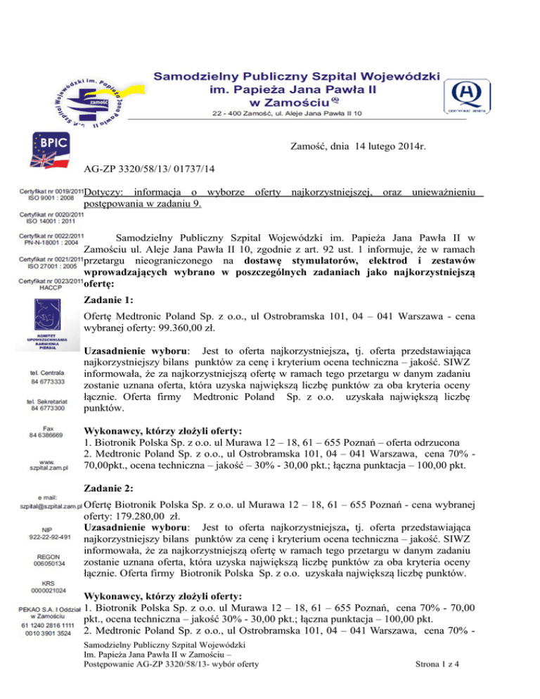 Zamość, dnia 14 lutego 2014r. AG-ZP 3320/58/13/ 01737/14 Dotyczy: informacja o wyborze oferty najkorzystniejszej, oraz unieważnieniu postępowania w zadaniu 9. Samodzielny Publiczny Szpital Wojewódzki im. Papieża Jana Pawła II w Zamościu ul. Aleje Jana Pawła II 10, zgodnie z art. 92 ust. 1 informuje, że w ramach przetargu nieograniczonego na dostawę stymulatorów, elektrod i zestawów wprowadzających wybrano w poszczególnych zadaniach jako najkorzystniejszą ofertę: Zadanie 1: Ofertę Medtronic Poland Sp. z o.o., ul Ostrobramska 101, 04 – 041 Warszawa - cena wybranej oferty: 99.360,00 zł. Uzasadnienie wyboru: Jest to oferta najkorzystniejsza, tj. oferta przedstawiająca najkorzystniejszy bilans punktów za cenę i kryterium ocena techniczna – jakość. SIWZ informowała, że za najkorzystniejszą ofertę w ramach tego przetargu w danym zadaniu zostanie uznana oferta, która uzyska największą liczbę punktów za oba kryteria oceny łącznie. Oferta firmy Medtronic Poland Sp. z o.o. uzyskała największą liczbę punktów. Wykonawcy, którzy złożyli oferty: 1. Biotronik Polska Sp. z o.o. ul Murawa 12 – 18, 61 – 655 Poznań – oferta odrzucona 2. Medtronic Poland Sp. z o.o., ul Ostrobramska 101, 04 – 041 Warszawa, cena 70% 70,00pkt., ocena techniczna – jakość – 30% - 30,00 pkt.; łączna punktacja – 100,00 pkt. Zadanie 2: Ofertę Biotronik Polska Sp. z o.o. ul Murawa 12 – 18, 61 – 655 Poznań - cena wybranej oferty: 179.280,00 zł. Uzasadnienie wyboru: Jest to oferta najkorzystniejsza, tj. oferta przedstawiająca najkorzystniejszy bilans punktów za cenę i kryterium ocena techniczna – jakość. SIWZ informowała, że za najkorzystniejszą ofertę w ramach tego przetargu w danym zadaniu zostanie uznana oferta, która uzyska największą liczbę punktów za oba kryteria oceny łącznie. Oferta firmy Biotronik Polska Sp. z o.o. uzyskała największą liczbę punktów. Wykonawcy, którzy złożyli oferty: 1. Biotronik Polska Sp. z o.o. ul Murawa 12 – 18, 61 – 655 Poznań, cena 70% - 70,00 pkt., ocena techniczna – jakość 30% - 30,00 pkt.; łączna punktacja – 100,00 pkt. 2. Medtronic Poland Sp. z o.o., ul Ostrobramska 101, 04 – 041 Warszawa, cena 70% Samodzielny Publiczny Szpital Wojewódzki Im. Papieża Jana Pawła II w Zamościu – Postępowanie AG-ZP 3320/58/13- wybór oferty Strona 1 z 4 69,17 pkt., ocena techniczna – jakość – 30% - 30,00 pkt.; łączna punktacja – 99,17 pkt. Zadanie 3: Ofertę Medtronic Poland Sp. z o.o. ul Ostrobramska 101, 04 – 041 Warszawa - cena wybranej oferty: 187.920,00 zł. Uzasadnienie wyboru: Jest to oferta najkorzystniejsza, tj. oferta przedstawiająca najkorzystniejszy bilans punktów za cenę i kryterium ocena techniczna – jakość. SIWZ informowała, że za najkorzystniejszą ofertę w ramach tego przetargu w danym zadaniu zostanie uznana oferta, która uzyska największą liczbę punktów za oba kryteria oceny łącznie. Oferta firmy Medtronic Poland Sp. z o.o. uzyskała największą liczbę punktów. Wykonawcy, którzy złożyli oferty: 1. Biotronik Polska Sp. z o.o. ul Murawa 12 – 18, 61 – 655 Poznań, cena 70% - 61,14 pkt., ocena techniczna – jakość 30% - 30,00 pkt.; łączna punktacja – 91,14 pkt. 2. Medtronic Poland Sp. z o.o., ul Ostrobramska 101, 04 – 041 Warszawa, cena 70% 70,00 pkt., ocena techniczna – jakość – 30% - 30,00 pkt.; łączna punktacja – 100,00 pkt. Zadanie 4: Ofertę Medtronic Poland Sp. z o.o. ul. Ostrobramska 101, 04 – 041 Warszawa - cena wybranej oferty: 181.440,00 zł. Uzasadnienie wyboru: Jest to oferta najkorzystniejsza, tj. oferta przedstawiająca najkorzystniejszy bilans punktów za cenę i kryterium ocena techniczna – jakość. SIWZ informowała, że za najkorzystniejszą ofertę w ramach tego przetargu w danym zadaniu zostanie uznana oferta, która uzyska największą liczbę punktów za oba kryteria oceny łącznie. Oferta firmy Medtronic Poland Sp. z o.o. uzyskała największą liczbę punktów. Wykonawcy, którzy złożyli oferty: 1. Medtronic Poland Sp. z o.o. ul. Ostrobramska 101, 04 – 041 Warszawa, cena 70% 70,00 pkt., ocena techniczna – jakość 30% - 30,00 pkt.; łączna punktacja – 100,00 pkt. Zadanie 5: Ofertę Medtronic Poland Sp. z o.o. ul. Ostrobramska 101, 04 – 041 Warszawa - cena wybranej oferty: 181.440,00 zł. Uzasadnienie wyboru: Jest to oferta najkorzystniejsza, tj. oferta przedstawiająca najkorzystniejszy bilans punktów za cenę i kryterium ocena techniczna – jakość. SIWZ informowała, że za najkorzystniejszą ofertę w ramach tego przetargu w danym zadaniu zostanie uznana oferta, która uzyska największą liczbę punktów za oba kryteria oceny łącznie. Oferta firmy Medtronic Poland Sp. z o.o. uzyskała największą liczbę punktów. Wykonawcy, którzy złożyli oferty: 1. Biotronik Polska Sp. z o.o. ul. Murawa 12 – 18, 61 – 655 Poznań, cena 70% - 62,03 pkt., ocena techniczna – jakość 30% - 30,00 pkt.; łączna punktacja – 92,03 pkt. 2. Medtronic Poland Sp. z o.o. ul. Ostrobramska 101, 04 – 041 Warszawa, cena 70% Samodzielny Publiczny Szpital Wojewódzki Im. Papieża Jana Pawła II w Zamościu – Postępowanie AG-ZP 3320/58/13- wybór oferty Strona 2 z 4 70,00 pkt., ocena techniczna – jakość 30% - 30,00 pkt.; łączna punktacja – 100,00 pkt 3. St. Jude Medical Sp. z o.o. ul. Broniewskiego 3, 01 – 785 Warszawa, cena 70% 61,25 pkt., ocena techniczna – jakość 30% - 30,00 pkt.; łączna punktacja – 91,25 pkt Zadanie 6: Ofertę Biotronik Polska Sp. z o.o. ul. Murawa 12 – 18, 61 – 655 Poznań - cena wybranej oferty: 73.440,00 zł. Uzasadnienie wyboru: Jest to oferta najkorzystniejsza, tj. oferta przedstawiająca najkorzystniejszy bilans punktów za cenę i kryterium ocena techniczna – jakość. SIWZ informowała, że za najkorzystniejszą ofertę w ramach tego przetargu w danym zadaniu zostanie uznana oferta, która uzyska największą liczbę punktów za oba kryteria oce
