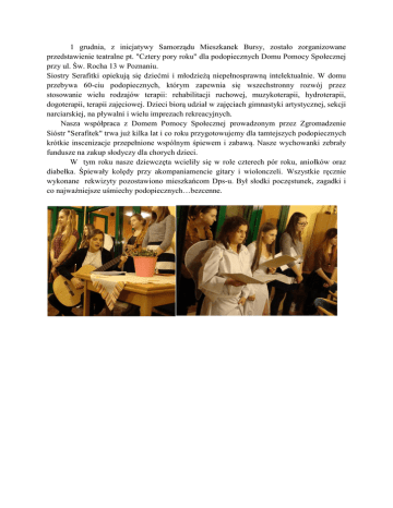 1 grudnia, z inicjatywy Samorządu Mieszkanek Bursy, zostało zorganizowane przedstawienie teatralne pt. "Cztery pory roku" dla podopiecznych Domu Pomocy Społecznej przy ul. Św. Rocha 13 w Poznaniu. Siostry Serafitki opiekują się dziećmi i młodzieżą niepełnosprawną intelektualnie. W domu przebywa 60-ciu podopiecznych, którym zapewnia się wszechstronny rozwój przez stosowanie wielu rodzajów terapii: rehabilitacji ruchowej, muzykoterapii, hydroterapii, dogoterapii, terapii zajęciowej. Dzieci biorą udział w zajęciach gimnastyki artystycznej, sekcji narciarskiej, na pływalni i wielu imprezach rekreacyjnych. Nasza współpraca z Domem Pomocy Społecznej prowadzonym przez Zgromadzenie Sióstr "Serafitek" trwa już kilka lat i co roku przygotowujemy dla tamtejszych podopiecznych krótkie inscenizacje przepełnione wspólnym śpiewem i zabawą. Nasze wychowanki zebrały fundusze na zakup słodyczy dla chorych dzieci. W tym roku nasze dziewczęta wcieliły się w role czterech pór roku, aniołków oraz diabełka. Śpiewały kolędy przy akompaniamencie gitary i wiolonczeli. Wszystkie ręcznie wykonane rekwizyty pozostawiono mieszkańcom Dps-u. Był słodki poczęstunek, zagadki i co najważniejsze uśmiechy podopiecznych…bezcenne.