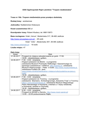 XXIX Ogólnopolski Rajd Leśników "Tropem niedźwiedzia" Trasa nr 10b: Tropem niedźwiedzia przez przełęcz dukielską Rodzaj trasy: autokarowa Jednostka: Nadleśnictwo Kołaczyce Koszt uczestnictwa 680 zł Koordynator trasy: Robert Kludacz, tel. 668115873 Baza noclegowa: Hotel „Venus”, Moderówka 317, 38-460 Jedlicze http://www.venusplaza.com.pl/ - 28 osób Hotel ” Artis” , Moderówka 307, 38-460 Jedlicze http://www.artishotel.pl/ - 19 osób Liczba miejsc: 47 Opis trasy Dzień 21.06.2017 22.06.2017 23.06.2017 24.06.2017 Opis Przyjazd do miejsca zakwaterowania po godz. 17:00. 18:00 - obiadokolacja z grillem. 7:30 – 8:30 - śniadanie. Wyjazd autokarem do Bóbrki - w programie: zwiedzanie Muzeum Przemysłu Naftowego i Gazowniczego im. Ignacego Łukasiewicza w Bóbrce, http://bobrka.pl/, zwiedzanie Muzeum Historycznego – Pałac w Dukli, http://www.muzeumdukla.pl, zwiedzanie Pustelni św. Jana www.polska.travel/pl/sanktuaria-i-miejsca-kultu/pustelnia-sw-jana-zdukli/ 18:30 - obiadokolacja z grillem. 7:30 – 8:30 - śniadanie. Wyjazd autokarem do Trzcinicy - w programie: zwiedzanie Skansenu Archeologicznego „Karpacka Troja” w Trzcinicy https:// www.karpackatroja.pl/, zwiedzanie Muzeum Magurskiego Parku Narodowego w Krempnej, cmentarz z I wojny światowej w Krempnej, cerkiew w Chyrowej. 18:30 - obiadokolacja z grillem. 8:30 – 9:30 - śniadanie. Przyjazd do MOSiR w Sanoku. http://www.mosir-sanok.pl/ 13:00 – 22:00 podsumowanie Rajdu. Kołaczyce 10b - Tropem niedźwiedzia przez przełęcz dukielską https://drive.google.com/open?id=1-ELhPRetOmEoTyshpZNybk8OKVI&usp=sharing