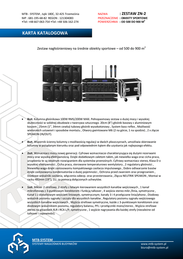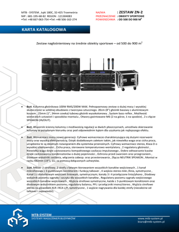 MTB - SYSTEM , Łęki 180C, 32-425 Trzemeśnia NIP : 681-195-68-82 REGON : 121304083 •Tel: +48 667-063-754 •Tel: +48 506-162-274 NAZWA : ZESTAW ZN-2 PRZEZNACZENIE : OBIEKTY SPORTOWE 2 POWIERZCHNIA : OD 500 DO 900 M KARTA KATALOGOWA Zestaw nagłośnieniowy na średnie obiekty sportowe – od 500 do 900 m2 8szt. Kolumna głośnikowa 100W RMS/200W MAX. Pełnopasmowy zestaw o dużej mocy i wysokiej skuteczności w solidnej obudowie z tworzywa sztucznego. 20cm (8") głośnik basowy z aluminiowym koszem , 25mm (1", 34mm cewka) tubowy głośnik wysokotonowy , System bass-reflex , Możliwość wielorakich ustawień i sposobów montażu , Otwory gwintowane M6 (2 na górze, 1 na spodzie) , 2 x złącze SPEAKON (IN/OUT). 8szt. Wspornik ścienny kolumny z możliwością regulacji w dwóch płaszczyznach, umożliwia skierowanie kolumny w pożądanym kierunku oraz pod odpowiednim kątem dla uzyskania jak najlepszego efektu. 2szt. Wzmacniacz mocy nowej generacji. Cyfrowe wzmacniacze charakteryzująca się dużymi rezerwami mocy oraz wysoką efektywnością. Dzięki dodatkowym zaletom takim, jak niewielka waga oraz cicha praca, urządzenia te są idealnym rozwiązaniem dla systemów przenośnych. Cyfrowy wzmacniacz stereo, Klasa D o wysokiej efektywności , Cicha praca, sterowane temperaturowo wentylatory , 2 regulatory głośności , Niewielka waga dzięki zastosowaniu kompaktowego zasilacza impulsowego , Dobre odtwarzanie basów dzięki zastosowaniu kondensatorów o dużej pojemności , Ochrona przed zwarciem oraz przegrzaniem , Diodowe wskaźniki zasilania, włączenia zabezp. oraz przesterowania , Złącza NEUTRIK SPEAKON , Montaż w racku 482mm (19"), 1U, za pomocą dołączonych uchwytów. 1szt. Mikser 2-strefowy. 2 strefy z łatwym kierowaniem wszystkich kanałów wejściowych , 1 kanał mikrofonowy z 3-punktowym korektorem i funkcją talkover , 4 wejścia stereo mikr./linia, symetryczne , Kanał 1 z dodatkowym wejściem liniowym, symetrycznym; kanały 3 i 4 przełączane linia/phono , Diodowy wskaźnik poziomu sygnału i szczytu dla wszystkich kanałów , Regulatory poziomu sygnału wejściowego wszystkich kanałów wejściowych , Wyjścia strefowe symetryczne, każde z 3-punktowym korektorem oraz diodowym wskaźnikiem poziomu, regulatory balansu, PFL i przełączniki mono/stereo , Wyjścia strefowe stereo na gniazdach XLR i RCA L/P, symetryczne , 1 wyjście nagrywania dla każdej strefy (niezależne od talkover i zapowiedzi). MTB-SYSTEM SYSTEMY NAGŁOŚNIEŃ BUDYNKÓW www.mtb-system.pl [email protected] MTB - SYSTEM , Łęki 180C, 32-425 Trzemeśnia NIP : 681-195-68-82 REGON : 121304083 •Tel: +48 667-063-754 •Tel: +48 506-162-274 NAZWA : ZESTAW ZN-2 PRZEZNACZENIE : OBIEKTY SPORTOWE 2 POWIERZCHNIA : OD 500 DO 900 M 1szt. Podwójny mikrofon bezprzewodowy, wieloczęstotliwościowy w technologii UHF PLL. Możliwość wyboru 2 x 1000 kanałów UHF (672.000-696.975MHz), podzielonych na 10 grup po 100 , Funkcja ACT do przesyłania wybranej częstotliwości w podczerwieni , Automatyczne wyszukiwanie częstotliwości , System "true diversity" z wymiennymi antenami (złącza BNC) , Próg wyciszenia szumów (squelch) i regulacja głośności , Wyświetlacz LCD: grupa/kanał, antena A/B, poziom mocy sygnału RF, poziom sygnału audio AF. 1szt. Skrzynia RACK na wszystkie urządzenia do bezpiecznego przechowywania oraz wygodnego transportu zestawu nagłośnieniowego. W komplecie listwa zasilająca 8 x 230V. 1kpl. Niezbędne okablowanie sygnałowe, komplet wtyków Neutrik Speakon. MTB-SYSTEM SYSTEMY NAGŁOŚNIEŃ BUDYNKÓW www.mtb-system.pl [email protected]
