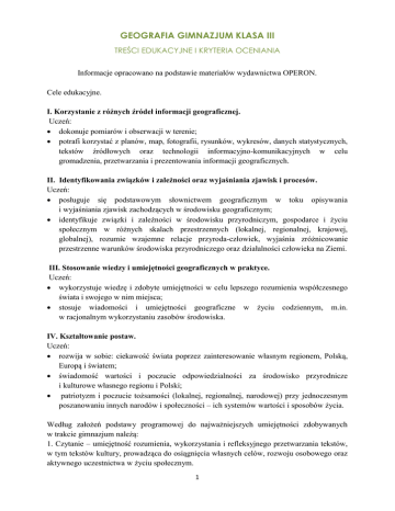 GEOGRAFIA GIMNAZJUM KLASA III TREŚCI EDUKACYJNE I KRYTERIA OCENIANIA Informacje opracowano na podstawie materiałów wydawnictwa OPERON. Cele edukacyjne. I. Korzystanie z różnych źródeł informacji geograficznej. Uczeń: dokonuje pomiarów i obserwacji w terenie; potrafi korzystać z planów, map, fotografii, rysunków, wykresów, danych statystycznych, tekstów źródłowych oraz technologii informacyjno-komunikacyjnych w celu gromadzenia, przetwarzania i prezentowania informacji geograficznych. II. Identyfikowania związków i zależności oraz wyjaśniania zjawisk i procesów. Uczeń: posługuje się podstawowym słownictwem geograficznym w toku opisywania i wyjaśniania zjawisk zachodzących w środowisku geograficznym; identyfikuje związki i zależności w środowisku przyrodniczym, gospodarce i życiu społecznym w różnych skalach przestrzennych (lokalnej, regionalnej, krajowej, globalnej), rozumie wzajemne relacje przyroda-człowiek, wyjaśnia zróżnicowanie przestrzenne warunków środowiska przyrodniczego oraz działalności człowieka na Ziemi. III. Stosowanie wiedzy i umiejętności geograficznych w praktyce. Uczeń: wykorzystuje wiedzę i zdobyte umiejętności w celu lepszego rozumienia współczesnego świata i swojego w nim miejsca; stosuje wiadomości i umiejętności geograficzne w życiu codziennym, m.in. w racjonalnym wykorzystaniu zasobów środowiska. IV. Kształtowanie postaw. Uczeń: rozwija w sobie: ciekawość świata poprzez zainteresowanie własnym regionem, Polską, Europą i światem; świadomość wartości i poczucie odpowiedzialności za środowisko przyrodnicze i kulturowe własnego regionu i Polski; patriotyzm i poczucie tożsamości (lokalnej, regionalnej, narodowej) przy jednoczesnym poszanowaniu innych narodów i społeczności – ich systemów wartości i sposobów życia. Według założeń podstawy programowej do najważniejszych umiejętności zdobywanych w trakcie gimnazjum należą: 1. Czytanie – umiejętność rozumienia, wykorzystania i refleksyjnego przetwarzania tekstów, w tym tekstów kultury, prowadząca do osiągnięcia własnych celów, rozwoju osobowego oraz aktywnego uczestnictwa w życiu społecznym. 1 2. Myślenie matematyczne – umiejętność wykorzystania narzędzi matematyki w życiu codziennym i formułowanie sądów opartych na rozumowaniu matematycznym. 3. Myślenie naukowe – umiejętność wykorzystania wiedzy o charakterze naukowym do identyfikowania i rozwiązywania problemów, a także formowanie wniosków opartych na obserwacjach empirycznych dotyczących przyrody i społeczeństwa. 4. Umiejętność komunikowania się w języku ojczystym i w językach obcych, zarówno w mowie, jak i piśmie. 5. Umiejętność sprawnego posługiwania się nowoczesnymi technologiami informacyjnokomunikacyjnymi. 6. Umiejętność wyszukiwania, selekcjonowania i krytycznej analizy informacji. 7. Umiejętność rozpoznawania własnych potrzeb edukacyjnych oraz uczenia się. I. Sąsiedzi Polski – zróżnicowanie geograficzne, przemiany. Uczeń: a) charakteryzuje i porównuje, na podstawie różnych źródeł informacji geograficznej, środowisko przyrodnicze krajów sąsiadujących z Polską; wykazuje ich zróżnicowanie społeczne i gospodarcze; b) wyjaśnia przyczyny dynamicznego rozwoju gospodarczego Niemiec; c) przedstawia współczesne przemiany społeczne i gospodarcze Ukrainy; d) wykazuje zróżnicowanie przyrodnicze, narodowościowe, kulturowe i gospodarcze Rosji; e) przedstawia główne cechy środowiska przyrodniczego, gospodarki oraz formy współpracy z krajem będącym najbliższym sąsiadem regionu, w którym uczeń mieszka. Zagadnienia: Porównanie cech środowiska przyrodniczego krajów sąsiadujących z Polską. Wyjaśnienie przyczyn dynamicznego rozwoju gospodarczego Niemiec. Porównanie cech środowiska przyrodniczego i gospodarki Czech i Słowacji. Współczesne przemiany społeczne i gospodarcze Ukrainy, Białorusi i Litwy. Zróżnicowanie przyrodnicze, narodowościowe, kulturowe i gospodarcze Rosji. Planowane osiągnięcia i działania ucznia: wskazuje państwa sąsiadujące z Polską na mapie; na podstawie map i innych źródeł informacji (fotografii, filmów itp.) charakteryzuje środowisko naturalne sąsiednich krajów; ocenia ich środowisko naturalne pod względem przydatności do działalności gospodarczej człowieka; wskazuje na mapie największe miasta na terytorium państw sąsiadujących z Polską; określa funkcje miast i czynniki wpływające na rozwój tych miast; opisuje specyficzne cechy każdego z państw; porównuje dane statystyczne dotyczące zjawisk ekonomicznych i demograficznych w poszczególnych państwach ; 2 na podstawie różnych źródeł informacji ocenia wpływ gospodarki socjalistycznej na obecny poziom rozwoju gospodarczego sąsiednich krajów; opierając się na rzetelnych źródłach informacji, ocenia przemiany gospodarcze i społeczne w państwach sąsiadujących z Polską; korzystając z danych statystycznych, map, artykułów prasowych itp. przedstawia czynniki rozwoju niemieckiej gospodarki i określa na zagrożenia dla jej dalszego rozwoju; na podstawie analizy mapy i innych źródeł prezentuje swój „plan dla Ukrainy” (dotyczący np. rozwoju przemysłu, rolnictwa, turystyki); na podstawie aktualnych informacji z prasy, radia, telewizji, Internetu przedstawia aktualne problemy gospodarcze, społeczne, polityczne omawianych krajów (np. Rosji, Białorusi, Ukrainy); ocenia współpracę Polski i własnego regionu z krajami sąsiednimi; prezentuje wybrane przez siebie zagadnienie dotyczące dowolnego państwa sąsiadującego z Polską, leżącego najbliżej miejsca zamieszkania ucznia; na podstawie map opisuje środowisko geograficzne Rosji (budowę geologiczną i jej wpływ na rzeźbę, występowanie surowców mineralnych, zróżnicowanie stref i typów klimatu, stref roślinnych i glebowych) oraz korzystając z innych źródeł, ocenia to środowisko pod wzgl