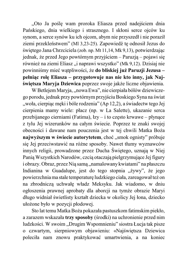 „Oto Ja poślę wam proroka Eliasza przed nadejściem dnia Pańskiego, dnia wielkiego i strasznego. I skłoni serce ojców ku synom, a serce synów ku ich ojcom, abym nie przyszedł i nie poraził ziemi przekleństwem” (Ml 3,23-25). Zapowiedź tę odnosił Jezus do świętego Jana Chrzciciela (zob. np. Mt 11,14, Mk 9,13), potwierdzając jednak, że przed Jego powtórnym przyjściem – Paruzją – pojawi się również na ziemi Eliasz „i naprawi wszystko” (Mk 9,12). Dzisiaj nie powinniśmy mieć wątpliwości, że do bliskiej już Paruzji Jezusa – pełniąc rolę Eliasza – przygotowuje nas nie kto inny, jak Najświętsza Maryja Dziewica poprzez swoje jakże liczne objawienia. W Betlejem Maryja, „nowa Ewa”, nie cierpiała bólów dziewiczego porodu, jednak przy powtórnym przyjściu Boskiego Syna na świat „woła, cierpiąc męki i bóle rodzenia” (Ap 12,2), a świadectw tego Jej cierpienia mamy wiele: płacz (np. w La Salette), ukazanie serca przebijanego cierniami (Fatima), łzy – i to często krwawe – płynące z tylu Jej wizerunków na całym świecie. Poprzez te znaki swojej obecności i dawane nam pouczenia jest w tej chwili Matka Boża najwyższym w świecie autorytetem, choć „smok ognisty” próbuje się Jej przeciwstawić na różne sposoby. Nawet tłumy wyznawców innych religii, prowadzone przez Ducha Świętego, uznają w Niej Panią Wszystkich Narodów, czcią otaczają pielgrzymujące Jej figury i obrazy. Obraz, przez Nią samą „namalowany kwiatami” na płaszczu Indianina w Guadalupe, jest do tego stopnia „żywy”, że jego powierzchnia ma stale temperaturę ludzkiego ciała, zareagował też on na zbrodniczą uchwałę władz Meksyku. Jak wiadomo, w dniu ogłoszenia prawnej aprobaty dla aborcji na tymże obrazie Maryi długo widniał świetlisty kształt dziecka w okolicy Jej łona, dziecko ułożone było w pozycji płodowej. Sto lat temu Matka Boża pokazała pastuszkom fatimskim piekło, a zarazem wskazała trzy sposoby (środki) na uchronienie przed nim ludzkości. W swoim „Drugim Wspomnieniu” siostra Łucja tak pisze o czwartym, sierpniowym objawieniu: «Najświętsza Dziewica poleciła nam znowu praktykować umartwienia, a na koniec powiedziała: „Módlcie się, módlcie się wiele i ponoście ofiary za grzeszników, bo wiele dusz idzie do piekła, gdyż nie ma nikogo, kto by się za nie poświęcał i modlił”». W jej „Czwartym Wspomnieniu” znajdujemy podobne słowa: „Czyńcie ofiary za grzeszników, bo wiele dusz idzie na wieczne potępienie, bo nie mają nikogo, kto by się za nie ofiarował i modlił”. Różnie bywało w ciągu stulecia z odpowiedzią na prośby Matki Kościoła… Niestety do dziś w nielicznych tylko parafiach świata napotkać można nabożeństwo Pierwszych Sobót miesiąca, które wciąż – zdaniem duszpasterzy – „nie obowiązuje”. A cóż dopiero mówić o innych prośbach Maryi? W Polsce mogłyby więc cieszyć inicjatywy ludzi świeckich, którzy czują się ostatnio w sposób wyjątkowy przynagleni do modlitwy i postu, a nawet zbierają się w grupy zorganizowane, ustalając między sobą dni i godziny tychże praktyk. Mogłyby, ale nie cieszą, gdyż… praktyki te ograniczają się najczęściej do wspierania tylko Polski z jej nowymi władzami! Możemy być wdzięczni znanemu i zasłużonemu franciszkaninowi z Bośni, ojcu Jozo Zovko, któremu zawdzięczamy m.in. powstanie ruchu „Margaretek za kapłanów”, za to że nasłuchuje wieści z Polski i wskazuje pielgrzymom kierunek działania, oparty na dotychczasowych doświadczeniach. Wiadomo, że nasi przodkowie modlitwą potężną, zbiorową, pokorną i ufną, połączoną z postem, wypraszali u Boga wielkie zwycięstwa, cuda, odmianę swojego losu, Boże Miłosierdzie. Moglibyśmy to czynić także w obecnej, jakże trudnej sytuacji. Ranny zwierz jest najgroźniejszy, gdyż rozwścieczony działa na oślep, a do niego podobni są w tej chwili ludzie atakujący polskie władze, opłacani przez wrogów Polski i Kościoła, których trzeba powstrzymać. Przy tym posunięcia i plany nowych władz budzą w nas nadzieję na wyjście z kryzysu i jest naturalne, że chcemy je wspierać, także duchowo. To wszystko prawda. To potrzeba chwili. Jednak… spójrzmy na to także od innej strony. Bać się „rannego zwierza” nie trzeba, choć 2 jego hałaśliwe napaści, czy to na ulicach naszych miast, czy to na forum Unii Europejskiej, mogą wyglądać groźnie. Raczej śmiejmy się z nich i dziękujmy za nie Bogu, gdyż jeśli piekło przez swoich ludzi okazuje wściekłość, to znaczy że dostało po głowie, a tym samym zatryumfował Bóg i Jego najwyższe wartości. Weszliśmy na właściwą drogę i na niej chcemy wytrwać. Tę drogę wskazują słowa Pana Jezusa (Mt 6,33): „Starajcie się naprzód o królestwo Boga i o jego sprawiedliwość, a to wszystko będzie wam dodane”. Tak, dodatkiem a nie głównym celem mają być godziwe środki utrzymania. Jeśli zaś chodzi o królestwo Boga – dążąc do intronizacji Jezusa jako Króla Polski, i to w sposób oparty na Jego własnych wskazówkach i żądaniach, przekazanych nam przez Rozalię Celakównę, obieramy najwłaściwszą drogę, a tym samym w najlepszy sposób troszczymy się o nasz byt narodowy. Dobro Ojczyzny, naszej matki, stawiamy na poczesnym miejscu. Powyższe zasady obowiązują zawsze, niezależnie od zewnętrznych okoliczności. Obecnie jednak Pan Jezus oczekuje od Polski, którą „szczególnie umiłował” i którą obarczył wyjątkową misją, że jej dobrzy obywatele wzniosą się na o wiele wyższy poziom myślenia, odczuwania, troski i działania. Misją tą ma być przygotowanie świata na Jego powtórne przyjście zwane Paruzją! To wydarzenie ma wkrótce wstrząsnąć fundamentem każdego życia: osobistego, społecznego, narodowego i ogólnoświatowego, ma zadecydować o tym, kto z mieszkańców ziemi na niej pozostanie, a kto będzie z nie