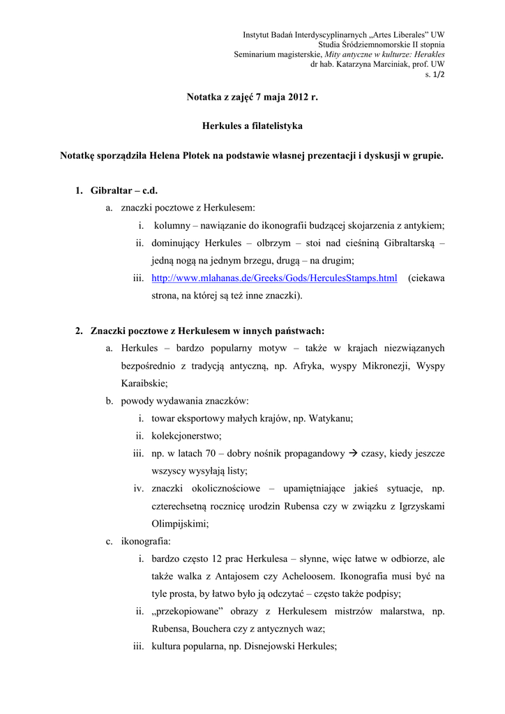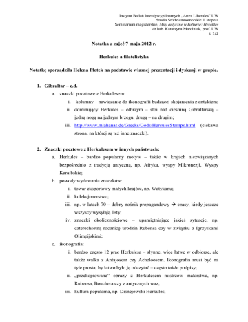 Instytut Badań Interdyscyplinarnych „Artes Liberales” UW Studia Śródziemnomorskie II stopnia Seminarium magisterskie, Mity antyczne w kulturze: Herakles dr hab. Katarzyna Marciniak, prof. UW s. 1/2 Notatka z zajęć 7 maja 2012 r. Herkules a filatelistyka Notatkę sporządziła Helena Płotek na podstawie własnej prezentacji i dyskusji w grupie. 1. Gibraltar – c.d. a. znaczki pocztowe z Herkulesem: i. kolumny – nawiązanie do ikonografii budzącej skojarzenia z antykiem; ii. dominujący Herkules – olbrzym – stoi nad cieśniną Gibraltarską – jedną nogą na jednym brzegu, drugą – na drugim; iii. http://www.mlahanas.de/Greeks/Gods/HerculesStamps.html (ciekawa strona, na której są też inne znaczki). 2. Znaczki pocztowe z Herkulesem w innych państwach: a. Herkules – bardzo popularny motyw – także w krajach niezwiązanych bezpośrednio z tradycją antyczną, np. Afryka, wyspy Mikronezji, Wyspy Karaibskie; b. powody wydawania znaczków: i. towar eksportowy małych krajów, np. Watykanu; ii. kolekcjonerstwo; iii. np. w latach 70 – dobry nośnik propagandowy czasy, kiedy jeszcze wszyscy wysyłają listy; iv. znaczki okolicznościowe – upamiętniające jakieś sytuacje, np. czterechsetną rocznicę urodzin Rubensa czy w związku z Igrzyskami Olimpijskimi; c. ikonografia: i. bardzo często 12 prac Herkulesa – słynne, więc łatwe w odbiorze, ale także walka z Antajosem czy Acheloosem. Ikonografia musi być na tyle prosta, by łatwo było ją odczytać – często także podpisy; ii. „przekopiowane” obrazy z Herkulesem mistrzów malarstwa, np. Rubensa, Bouchera czy z antycznych waz; iii. kultura popularna, np. Disnejowski Herkules; Instytut Badań Interdyscyplinarnych „Artes Liberales” UW Studia Śródziemnomorskie II stopnia Seminarium magisterskie, Mity antyczne w kulturze: Herakles dr hab. Katarzyna Marciniak, prof. UW s. 2/2 d. Grecja: i. Bardzo wiele znaczków z Herkulesem – szeroki kontekst: • znaczki z okresu walk grecko-macedońskich 1903-1908; • lata 70. – seria znaczków z Herkulesem z cyklu 12 prac – ale tylko prace związane z zabijaniem przeciwników – do tego autorzy dobrali inne znane sceny z życia Herkulesa, np. walka z Antajosem okres reżimu pułkowników w 1970 r. proces sądowy przeciwników reżimu pułkowników – czy mógł być związek?; • znaczki z Herkulesem – drużyna piłkarska. 3. Inne ciekawe odniesienia do mitu Herkulesa, które pojawiły się w trakcie kwerendy „filatelistycznej”, niezwiązane jednak z filatelistyką: • Konkurencja zawodów siłaczy – Uchwyt Herkulesa, tzw. Hercules Hold: a. zawodnik ma utrzymać, jak najdłużej, dwa jednakowe ciężary, których siły działają w przeciwne strony. Wypuszczenie z dłoni jednego lub obu ciężarów kończy konkurencję; b. w jednej z wersji ciężarem są dwie kolumny, w drugiej dwa samochody, które staczają się w przeciwnych kierunkach z dwóch pochylni. • Obraz Salvadora Dalego, znany pod angielskim tytułem: Hercules Lifts the Skin of the Sea and Stops Venus for an Instant from Waking Love z 1963 r. – mniej popularny obraz słynnego artysty – kwestie do przemyślenia: jak tłumaczyć tytuły dzieł nierozpowszechnionych w Polsce? Jakie przesłanie niesie ta praca Dalego? Jak artysta widzi mit Herkulesa?