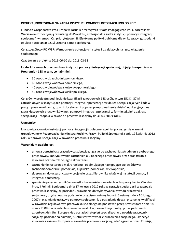PROJEKT „PROFESJONALNA KADRA INSTYTUCJI POMOCY I INTEGRACJI SPOŁECZNEJ” Fundacja Gospodarcza Pro Europa w Toruniu oraz Wyższa Szkoła Pedagogiczna im. J. Korczaka w Warszawie rozpoczynają rekrutację do Projektu „Profesjonalna kadra instytucji pomocy i integracji społecznej” w ramach Osi priorytetowej: II. Efektywne polityki publiczne dla rynku pracy, gospodarki i edukacji; Działania: 2.5 Skuteczna pomoc społeczna. Cel szczegółowy PO WER: Wzmocnienie potencjału instytucji działających na rzecz włączenia społecznego. Czas trwania projektu: 2016-06-10 do: 2018-03-31 Liczba kluczowych pracowników instytucji pomocy i integracji społecznej, objętych wsparciem w Programie - 188 w tym, co najmniej: 30 osób z woj. zachodniopomorskiego, 68 osób z województwa pomorskiego, 40 osób z województwa kujawsko-pomorskiego, 50 osób z województwa wielkopolskiego. Cel główny projektu: podniesienie kwalifikacji zawodowych 188 osób, w tym 151 K i 37 M zatrudnionych w instytucjach pomocy i integracji społecznej oraz dalsza specjalizacja tych kadr w pracy z poszczególnymi grupami docelowymi poprzez przeprowadzenie działań edukacyjnych na rzecz kluczowych pracowników inst. pomocy i integracji społecznej w formie szkoleń z zakresu specjalizacji II stopnia w zawodzie pracownik socjalny do 31.03.2018r roku. Uczestnicy: kluczowi pracownicy instytucji pomocy i integracji społecznej spełniający wszystkie warunki uregulowane w Rozporządzeniu Ministra Rodziny, Pracy i Polityki Społecznej z dnia 17 kwietnia 2012 roku w sprawie specjalizacji w zawodzie pracownik socjalny. Warunkiem udziału jest: umowa uczestnika z pracodawcą zobowiązująca go do zachowania zatrudnienia u obecnego pracodawcy, kontynuowania zatrudnienia u obecnego pracodawcy przez czas trwania szkolenia oraz na rok po jego zakończeniu, zatrudnienie na terenie makroregionu I obejmującego następujące województwa: zachodniopomorskie, pomorskie, kujawsko-pomorskie, wielkopolskie, skierowani do uczestnictwa w projekcie przez Kierownika właściwej instytucji pomocy i integracji społecznej, spełnianie przez uczestników wszystkich warunków zawartych w Rozporządzeniu Ministra Pracy i Polityki Społecznej z dnia 17 kwietnia 2012 roku w sprawie specjalizacji w zawodzie pracownik socjalny, tj. posiadać uprawnienia do wykonywania zawodu pracownika socjalnego, uzyskanego na podstawie przepisów ustawy lub art. 5 ustawy z dnia 16 lutego 2007 r. o zamianie ustawy o pomocy społecznej, lub posiadanie decyzji o uznaniu kwalifikacji w zawodzie regulowanym pracownika socjalnego na podstawie przepisów ustawy z dnia 18 marca 2008 r. o zasadach uznawania kwalifikacji zawodowych nabytych w państwach członkowskich Unii Europejskiej, posiadać I stopień specjalizacji w zawodzie pracownik socjalny, posiadać co najmniej 5-letni staż w zawodzie pracownika socjalnego, ukończyć szkolenia z zakresu II stopnia w zawodzie pracownik socjalny, zdać egzamin przed Komisją; w pierwszej kolejności wsparcie będzie kierowane do tych, którzy nie korzystali ze wsparcia w postaci specjalizacji I i II stopnia w zawodzie pracownika socjalnego w ramach projektów finansowanych ze środków PO KL 2007-2013 Rekrutacja trwa: od 21.06.2016r. do 05.08.2016r. Dodatkowe informacje odnośnie projektu na stronie: http://fundacjaproeuropa.org.pl/projekty/specjalizacja-ii-stopnia/ oraz w Biurze projektu: ul. Warszawska 4/7, 87-100 Toruń, tel. 533 665 339 lub 56 658 59 09 ul. Plac Jana Kilińskiego 3, 71-414 Szczecin, [email protected] tel. 91 422 51 32, 91 422 51 66 Zgłoszenia przyjmujemy do 05.08.2016r.