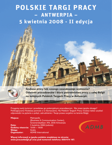 Polskie Targi Pracy – Antwerpia – 5 kwietnia 2008 - II edycja Szukasz pracy lub nowego zawodowego wyzwania? Odwiedź pracodawców i biura pośrednictwa pracy z całej Belgii na kolejnych Polskich Targach Pracy w Antwerpii. Przygotuj swój życiorys i przedstaw go potencjalnym pracodawcom. Nie znasz języka obcego? Polskojęzyczna Hostessa pomoże ci w tłumaczeniu. Na Polskich Targach Pracy możesz także uzyskać odpowiedzi na pytania o pobyt, zatrudnienie i Twoje prawa socjalne na terenie Belgii. Miejsce: Data: Godziny otwarcia: Wstęp: Organizator: Metropolis (Business & Communication Center), Groenendaallaan 394, 2030 Antwerpia 5 kwietnia 2008 (sobota) 10:00 – 18:00 Gratis ADMB International Więcej informacji w języku polskim znajdziesz na stronie: www.pracawbelgii.pl oraz pod numerem telefonu: 050/474 187.