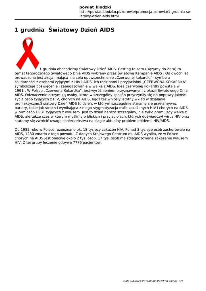 powiat_klodzki http://powiat.klodzko.pl/zdrowie/promocja-zdrowia/1-grudnia-sw iatowy-dzien-aids.html 1 grudnia Światowy Dzień AIDS 1 grudnia obchodzimy Światowy Dzień AIDS. Getting to zero (Dążymy do Zera) to temat tegorocznego Światowego Dnia AIDS wybrany przez Światową Kampanię AIDS . Od dwóch lat prowadzona jest akcja, mająca na celu upowszechnienie „Czerwonej kokardki’ - symbolu solidarności z osobami żyjącymi z HIV i AIDS, ich rodzinami i przyjaciółmi.„CZERWONA KOKARDKA” symbolizuje poświęcenie i zaangażowanie w walkę z AIDS. Idea czerwonej kokardki powstała w 1991r. W Polsce „Czerwona Kokardka”, jest wyróżnieniem przyznawanym z okazji Światowego Dnia AIDS. Odznaczenie otrzymują osoby, które w szczególny sposób przyczyniły się do poprawy jakości życia osób żyjących z HIV, chorych na AIDS, bądź też wniosły istotny wkład w działania profilaktyczne.Światowy Dzień AIDS to dzień, w którym szczególnie staramy się przełamywać bariery, takie jak strach i wynikająca z niego stygmatyzacja osób zakażonych HIV i chorych na AIDS, w tym osób LGBT żyjących z wirusem. Jest to dzień bardzo szczególny, nie tylko promujący walkę z AIDS, ale także czas w którym myślimy o bliskich i przyjaciołach, których doświadczył wirus HIV oraz staramy się zwrócić uwagę społeczeństwa na ciągle aktualny problem epidemii HIV/AIDS. Od 1985 roku w Polsce rozpoznano ok. 18 tysięcy zakażeń HIV. Ponad 3 tysiące osób zachorowało na AIDS, 1280 zmarło z tego powodu. Z danych Krajowego Centrum ds. AIDS wynika, że w Polsce chorych na AIDS jest obecnie około 2 tys. osób. 17 tys. osób ma zdiagnozowane zakażenie wirusem HIV. Z tej grupy leczenie odbywa 7776 pacjentów. Data publikacji 2017-03-08 20:01:36, Strona: 1/1