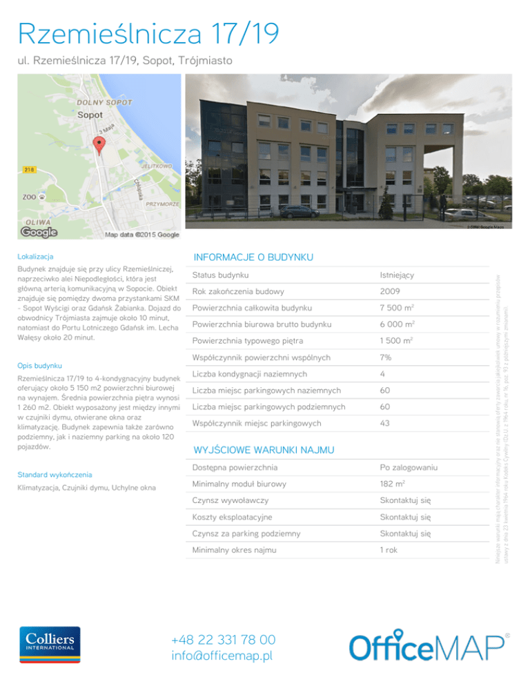 Rzemieślnicza 17/19 ul. Rzemieślnicza 17/19, Sopot, Trójmiasto Lokalizacja Status budynku Istniejący Rok zakończenia budowy 2009 Powierzchnia całkowita budynku 7 500 m2 Powierzchnia biurowa brutto budynku 6 000 m2 Powierzchnia typowego piętra 1 500 m2 Współczynnik powierzchni wspólnych 7% Liczba kondygnacji naziemnych 4 Liczba miejsc parkingowych naziemnych 60 Liczba miejsc parkingowych podziemnych 60 Współczynnik miejsc parkingowych 43 Opis budynku Rzemieślnicza 17/19 to 4-kondygnacyjny budynek oferujący około 5 150 m2 powierzchni biurowej na wynajem. Średnia powierzchnia piętra wynosi 1 260 m2. Obiekt wyposażony jest między innymi w czujniki dymu, otwierane okna oraz klimatyzację. Budynek zapewnia także zarówno podziemny, jak i naziemny parking na około 120 pojazdów. WYJŚCIOWE WARUNKI NAJMU Dostępna powierzchnia Po zalogowaniu Minimalny moduł biurowy 182 m2 Czynsz wywoławczy Skontaktuj się Koszty eksploatacyjne Skontaktuj się Czynsz za parking podziemny Skontaktuj się Minimalny okres najmu 1 rok Standard wykończenia Klimatyzacja, Czujniki dymu, Uchylne okna +48 22 331 78 00 [email protected] Niniejsze warunki mają charakter informacyjny oraz nie stanowią oferty zawarcia jakiejkolwiek umowy w rozumieniu przepisów ustawy z dnia 23 kwietnia 1964 roku Kodeks Cywilny (Dz.U. z 1964 roku, nr 16, poz. 93 z późniejszymi zmianami). INFORMACJE O BUDYNKU Budynek znajduje się przy ulicy Rzemieślniczej, naprzeciwko alei Niepodległości, która jest główną arterią komunikacyjną w Sopocie. Obiekt znajduje się pomiędzy dwoma przystankami SKM - Sopot Wyścigi oraz Gdańsk Żabianka. Dojazd do obwodnicy Trójmiasta zajmuje około 10 minut, natomiast do Portu Lotniczego Gdańsk im. Lecha Wałęsy około 20 minut.