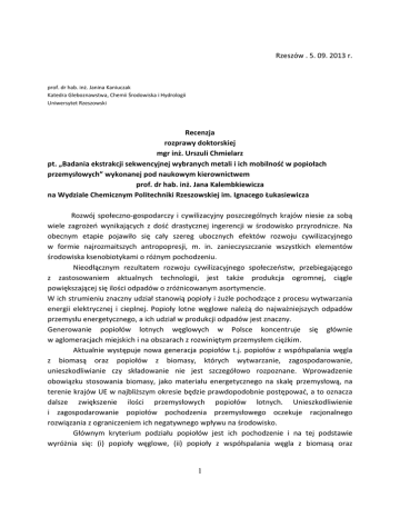 Rzeszów . 5. 09. 2013 r. prof. dr hab. inż. Janina Kaniuczak Katedra Gleboznawstwa, Chemii Środowiska i Hydrologii Uniwersytet Rzeszowski Recenzja rozprawy doktorskiej mgr inż. Urszuli Chmielarz pt. „Badania ekstrakcji sekwencyjnej wybranych metali i ich mobilność w popiołach przemysłowych” wykonanej pod naukowym kierownictwem prof. dr hab. inż. Jana Kalembkiewicza na Wydziale Chemicznym Politechniki Rzeszowskiej im. Ignacego Łukasiewicza Rozwój społeczno-gospodarczy i cywilizacyjny poszczególnych krajów niesie za sobą wiele zagrożeń wynikających z dość drastycznej ingerencji w środowisko przyrodnicze. Na obecnym etapie pojawiło się cały szereg ubocznych efektów rozwoju cywilizacyjnego w formie najrozmaitszych antropopresji, m. in. zanieczyszczanie wszystkich elementów środowiska ksenobiotykami o różnym pochodzeniu. Nieodłącznym rezultatem rozwoju cywilizacyjnego społeczeństw, przebiegającego z zastosowaniem aktualnych technologii, jest także produkcja ogromnej, ciągle powiększającej się ilości odpadów o zróżnicowanym asortymencie. W ich strumieniu znaczny udział stanowią popioły i żużle pochodzące z procesu wytwarzania energii elektrycznej i cieplnej. Popioły lotne węglowe należą do najważniejszych odpadów przemysłu energetycznego, a ich udział w produkcji odpadów jest znaczny. Generowanie popiołów lotnych węglowych w Polsce koncentruje się głównie w aglomeracjach miejskich i na obszarach z rozwiniętym przemysłem ciężkim. Aktualnie występuje nowa generacja popiołów t.j. popiołów z współspalania węgla z biomasą oraz popiołów z biomasy, których wytwarzanie, zagospodarowanie, unieszkodliwianie czy składowanie nie jest szczegółowo rozpoznane. Wprowadzenie obowiązku stosowania biomasy, jako materiału energetycznego na skalę przemysłową, na terenie krajów UE w najbliższym okresie będzie prawdopodobnie postępować, a to oznacza dalsze zwiększenie ilości przemysłowych popiołów lotnych. Unieszkodliwienie i zagospodarowanie popiołów pochodzenia przemysłowego oczekuje racjonalnego rozwiązania z ograniczeniem ich negatywnego wpływu na środowisko. Głównym kryterium podziału popiołów jest ich pochodzenie i na tej podstawie wyróżnia się: (i) popioły węglowe, (ii) popioły z współspalania węgla z biomasą oraz 1 (iii) popioły z biomasy. Popioły przemysłowe w zależności od ich właściwości i składu, m.in. zawartości Cr (VI), Cu, Ni, As, Cd, Be mogą być sklasyfikowane jako odpady niebezpieczne. Pani mgr inż. Urszula Chmielarz przeprowadziła kompleksowe badania uwzględniające pochodzenie lotnych popiołów przemysłowych: (i) popioły węglowe (2), (ii) popioły z współspalania węgla z biomasą (1) oraz (iii) popioły z biomasy (1), wraz z oceną ich właściwości fizycznych i fizykochemicznych (skład granulometryczny, wilgotność, pH, straty prażenia, gęstość nasypowa, aktywność pucolanowa, rozpuszczalność w roztworach wodnych w szerokim zakresie pH, rozpuszczalność i roztwarzalność w warunkach ekstrakcji sekwencyjnej). Autorka szczegółowo badała również skład chemiczny pyłów: (i) metale alkaliczne i ziem alkalicznych: Na, K, Mg, Ca, (ii) metale ciężkie: Pb, Cr, Mn, Fe, Co, Ni, Cu, Zn, Cd, (iii) specjacje o szczególnych właściwościach (rakotwórczych i mutagennych): Cr (VI), (iv) inne metale: m.in. Al-niezbędny do sklasyfikowania popiołów w-g normy BN-79/6722/-09. W zakres badań składu chemicznego przemysłowych popiołów lotnych włączona została ekstrakcja sekwencyjna i mobilność wybranych metali oraz dezaktywacja chemiczna popiołów metodą ekstrakcji sekwencyjnej, co stanowi nowum w pracy doktorskiej Autorki. Doktorantka dokonała oceny oddziaływania popiołów, przed dezaktywacją i na różnych etapach jej prowadzenia, na warstwy powierzchniowe gleby, której skład był modyfikowany popiołem. Pani mgr inż. Urszula Chmielarz podjęła się rozpoznania niezwykle ważnego problemu technologicznego w zakresie ekstrakcji sekwencyjnej i chemicznej dezaktywacji, wytwarzanych w ostatnich latach, odpadów przemysłowych, często o bliżej nieokreślonym składzie i właściwościach. Autorka prowadząc bardzo pracochłonne i szeroko zakrojone badania, zrealizowała również ważne cele naukowe, które dotyczyły: a) badania i opisu wpływu ekstrakcji sekwencyjnej na frakcje chemiczne wybranych metali, ich specjację funkcjonalną i mobilność metali m.in. metali alkalicznych i ziem alkaicznych, metali ciężkich i toksycznych w popiołach przemysłowych, b) badania i opisu dezaktywacji chemicznej popiołów metodą ekstrakcji sekwencyjnej na ich skład i mobilność metali, c) oceny wpływu popiołów po różnych etapach dezaktywacji na powierzchniową warstwę gleby, d) oceny trwałości wybranych form chemicznych chromu w eluatach i popiołach oraz ich izolowanie z przemysłowych popiołów lotnych, co również stanowi bardzo ważne osiągnięcie nowatorskie Autorki i Promotora niniejszej rozprawy. Zagospodarowanie i wykorzystanie lotnych popiołów z węgla w Polsce osiągnęło poziom ponad 90%, co skutkuje tym, że podjęty problem badawczy jest bardzo istotny m.in. w kontekście ograniczenia, czy wręcz zminimalizowania ich szkodliwego oddziaływania na środowisko przyrodnicze. Odbiorcami zanieczyszczeń są tak ważne elementy składowe środowiska, jak atmosfera, gleby, wody powierzchniowe i częściowo podziemne oraz roślinność ekosystemów i agroekosystemów, zwierzęta i człowiek. Problemowi temu, 2 teoretycznie trudnemu, który wymaga wiedzy i dużych umiejętności badacza oraz ogromnego nakładu pracy, Doktorantka poświęciła swoje badania. Formalna ocena pracy Rozprawa doktorska obejmuje łącznie 195 stron i składa się z 6 rozdziałów oraz poza numeracją zamieszczono: literaturę, dorobek naukowy, streszczenie i abstract. Praca zawiera klasyczne rozdziały wymagane w rozprawie doktorskiej i obejmuj